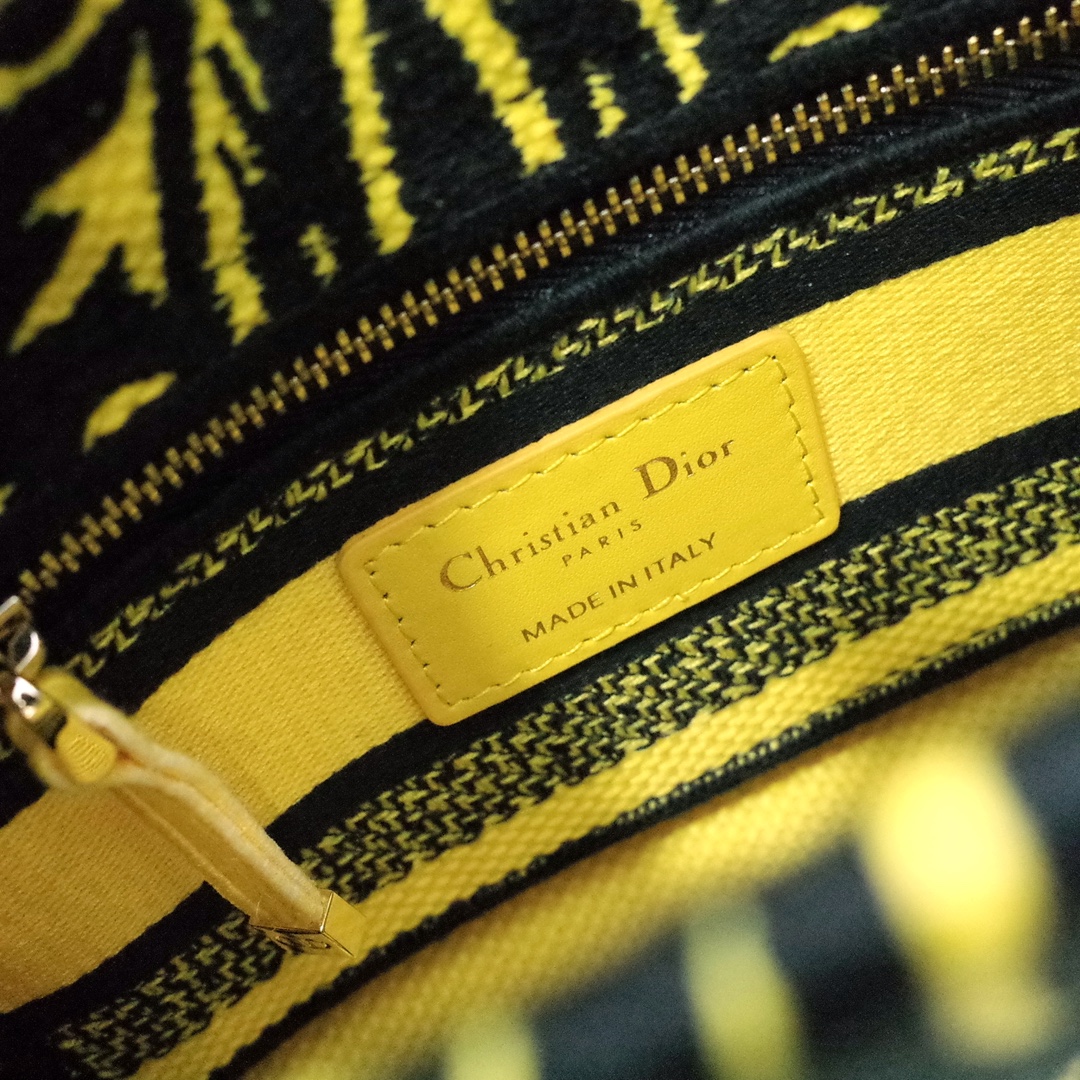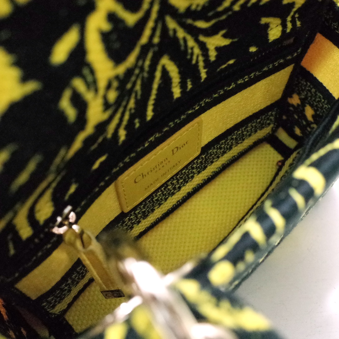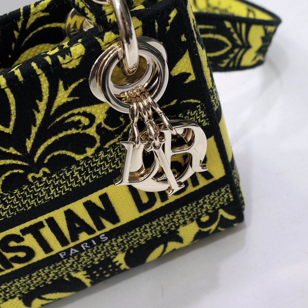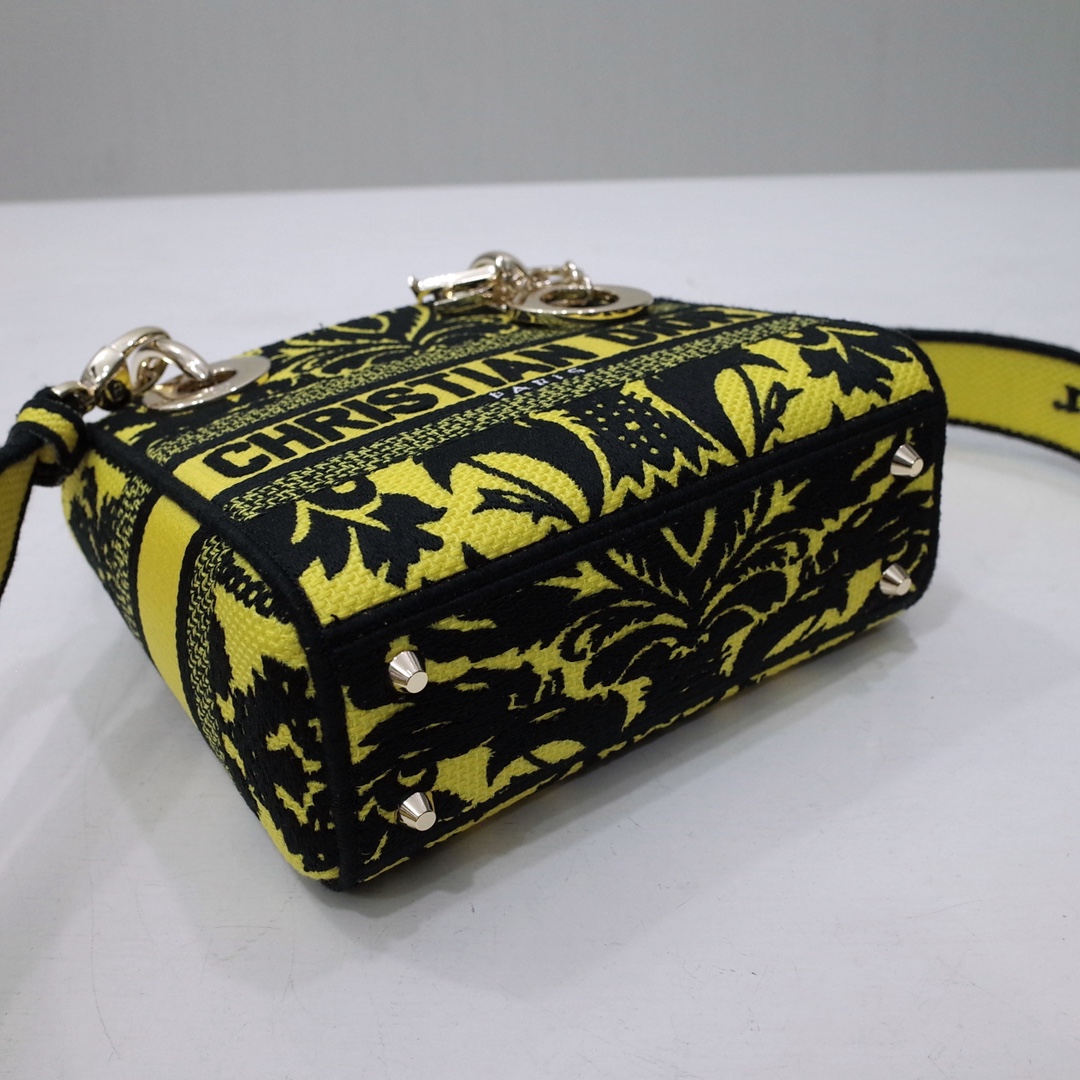 The Lady D-Lite bag combines classic elegance with House modernity. The style is fully embroidered with a yellow multicolor Ornamental motif inspired by Andalusian baroque in a graphic spirit. The front features a 'CHRISTIAN DIOR PARIS' signature while the 'D.I.O.R.' charms in pale gold-finish metal further enhance the silhouette. Equipped with a wide, reversible and removable embroidered shoulder strap, the miniature Lady D-Lite bag can be carried by hand or worn crossbody.