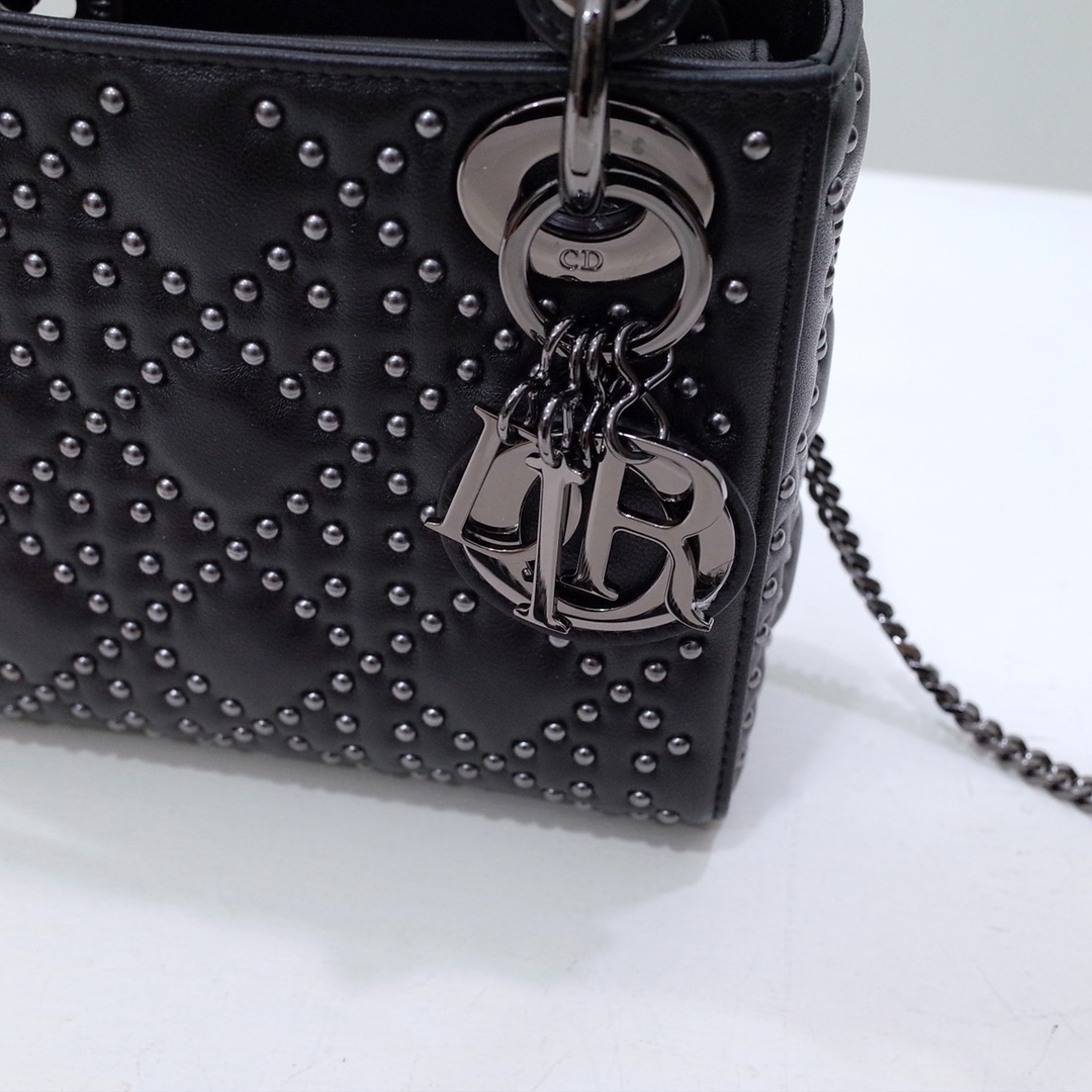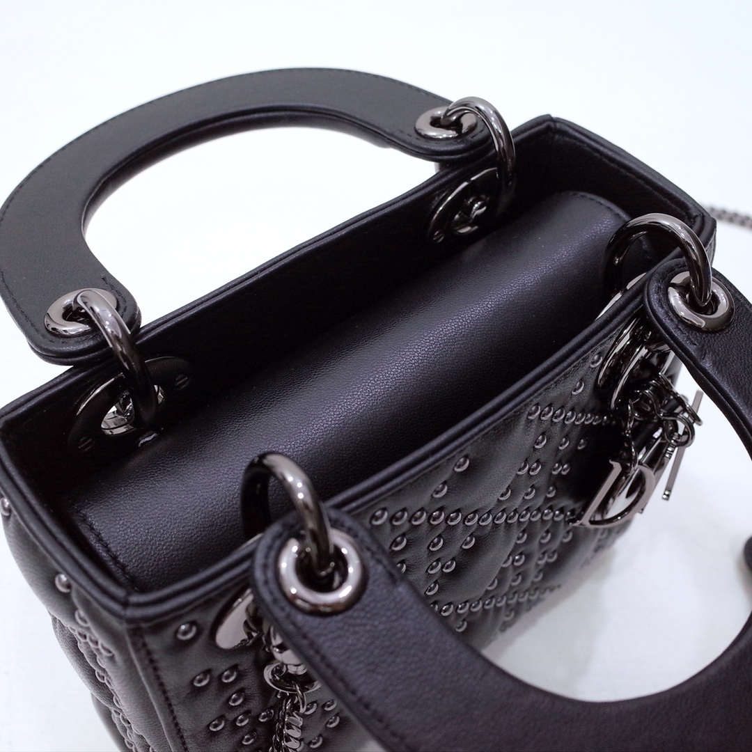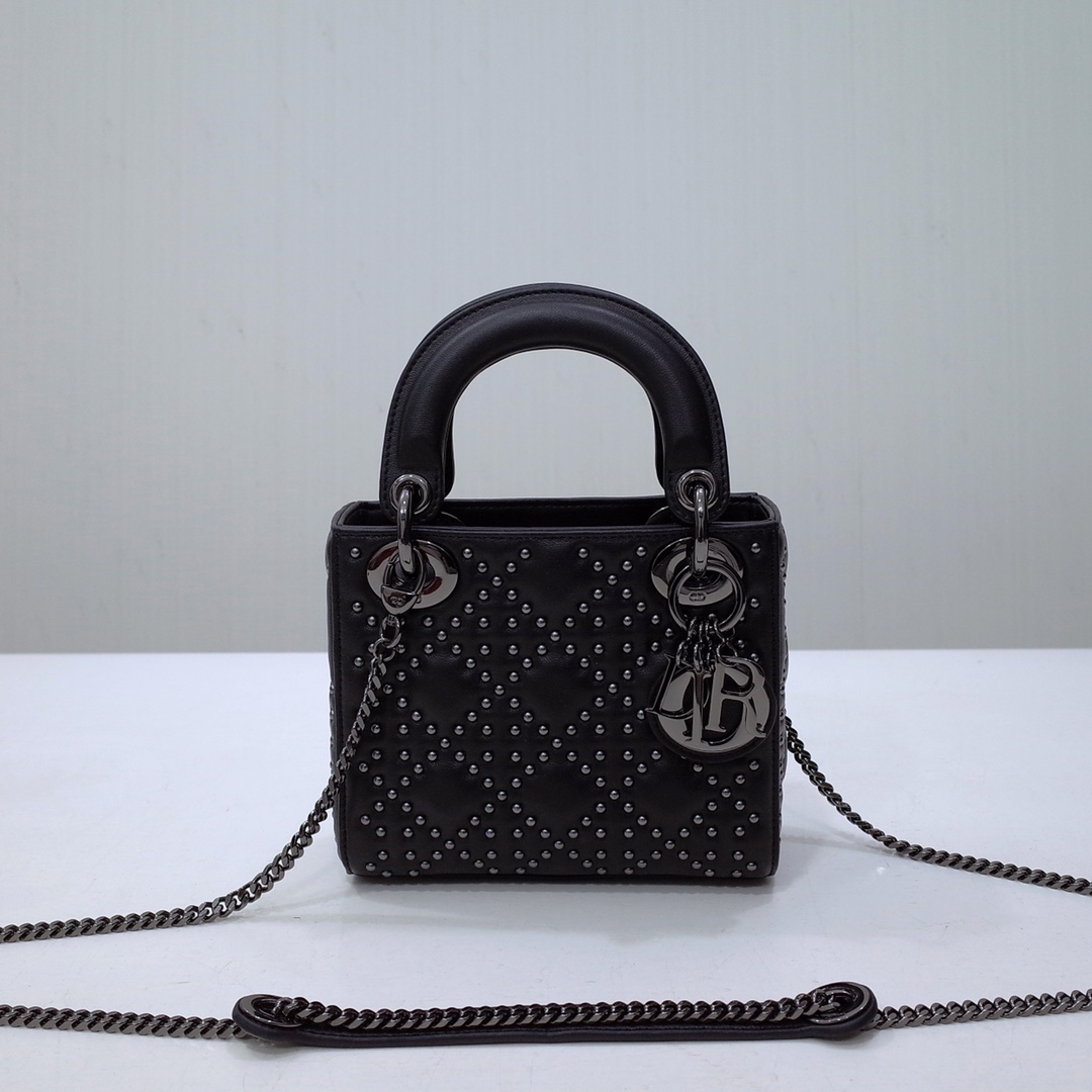 The Lady Dior Bag embodies the House's vision of elegance and beauty. Refined and graceful, the timeless creation is crafted in black Lucky Star Cannage lambskin, offering a new take on the iconic motif and featuring hand-applied stars. Ruthenium-finish metal 'D.I.O.R.' charms embellish and illuminate the silhouette. Boasting a removable chain shoulder strap, the miniature Lady Dior bag will make an ideal evening companion and may be carried by hand or worn crossbody.