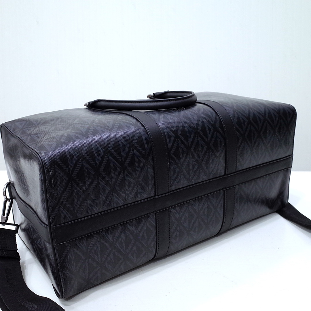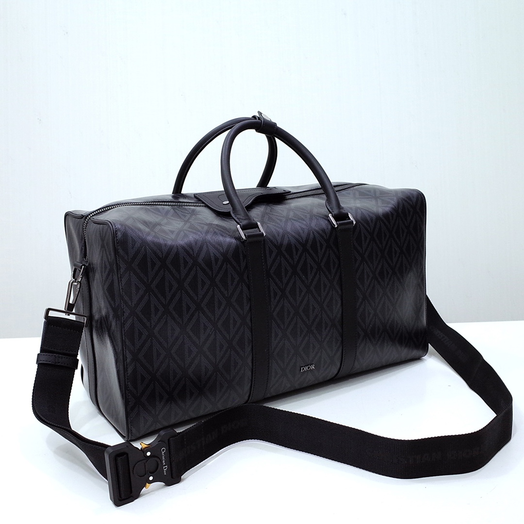 The House's newest essential, the Dior Lingot 50 Duffle bag, is a practical and elegant design. Crafted in black CD Diamond canvas inspired by the House's archives, the item is enhanced by smooth calfskin details. A zipped compartment with a Saddle flap will hold all the essentials. The folding top handles and adjustable, removable shoulder strap with an aluminum buckle allow the bag to be carried by hand, worn over the shoulder or crossbody.