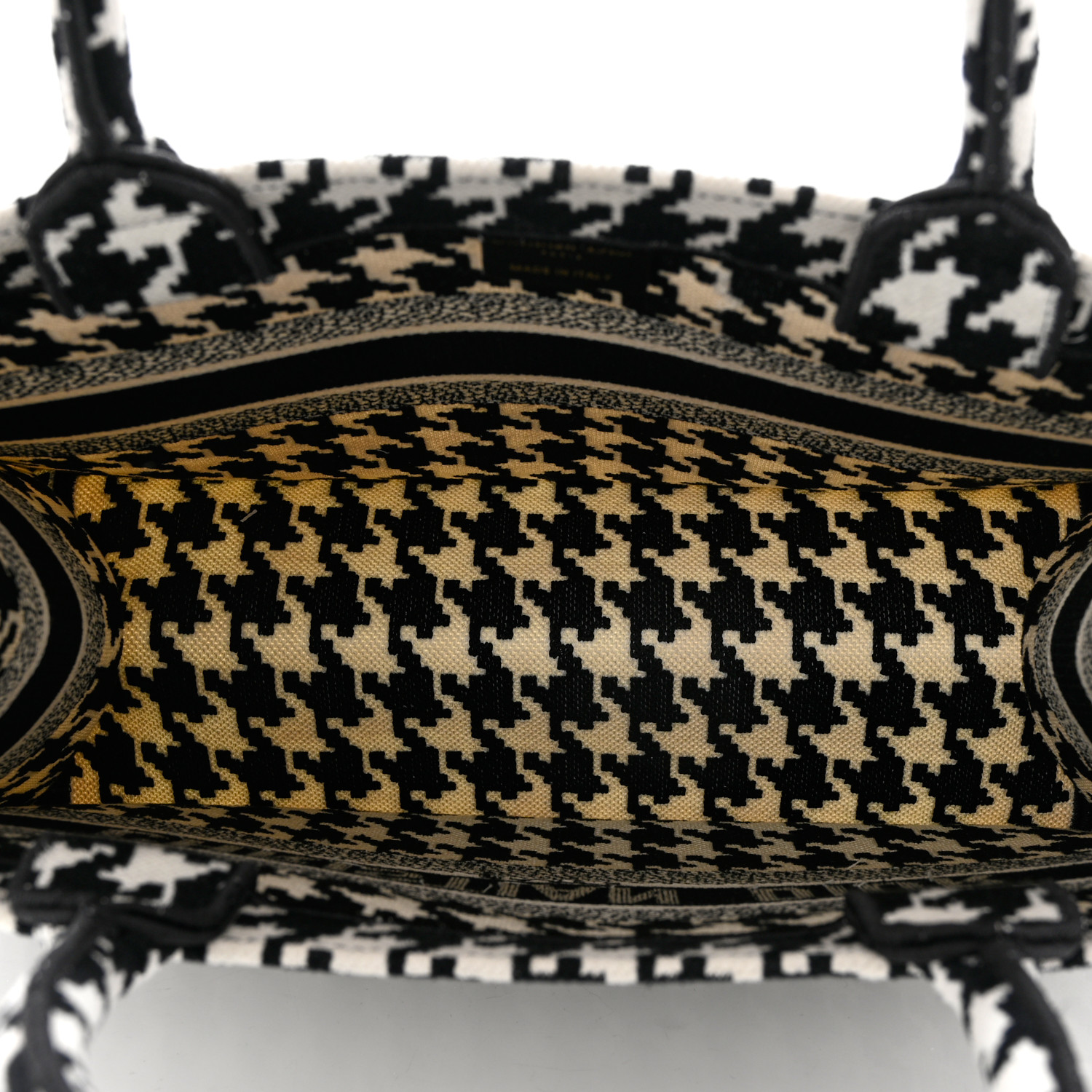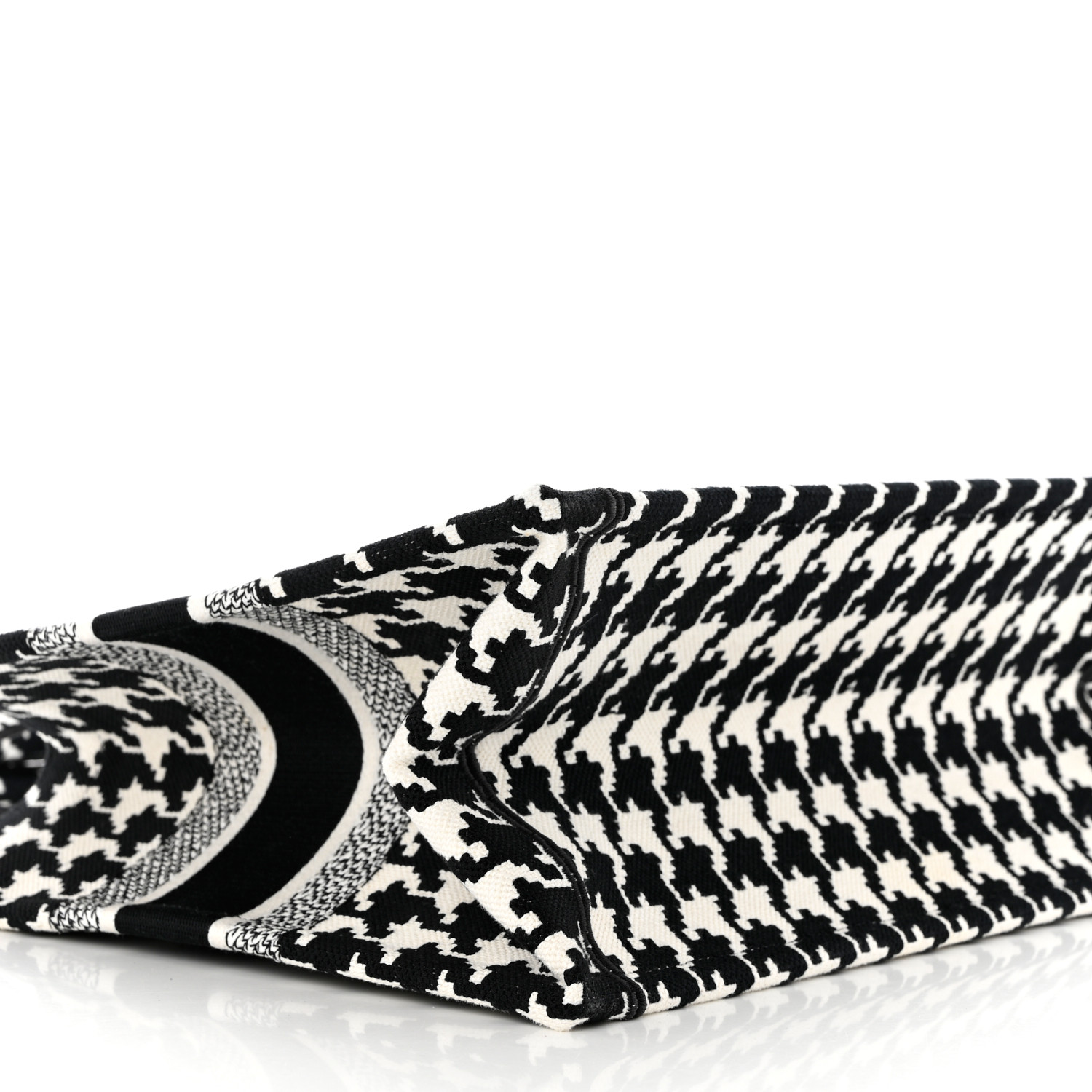 This is an authentic CHRISTIAN DIOR Canvas Houndstooth Embroidered Medium Book Tote in Black and White. This lovely tote is crafted of classic houndstooth embroidered canvas in black and white. The bag features rolled canvas top handles and a prominent white CHRISTIAN DIOR logo embroidered on the front. The top is open to a spacious canvas interior.