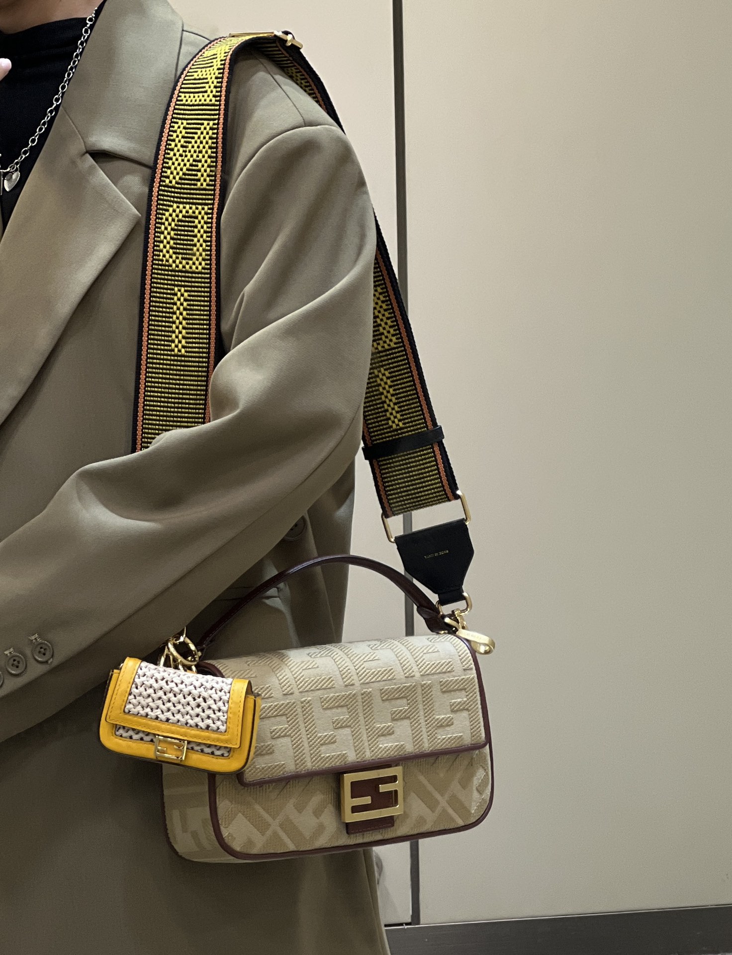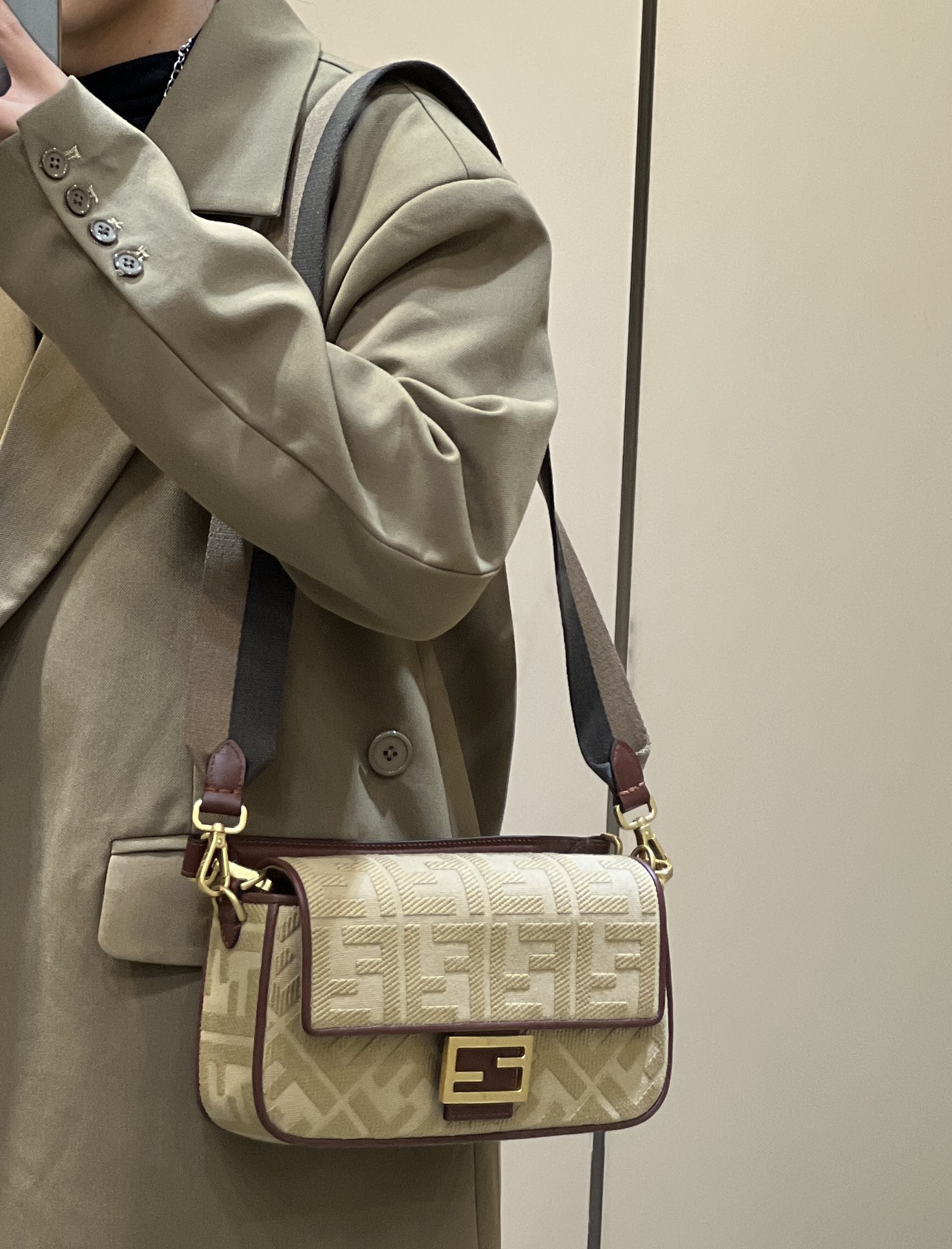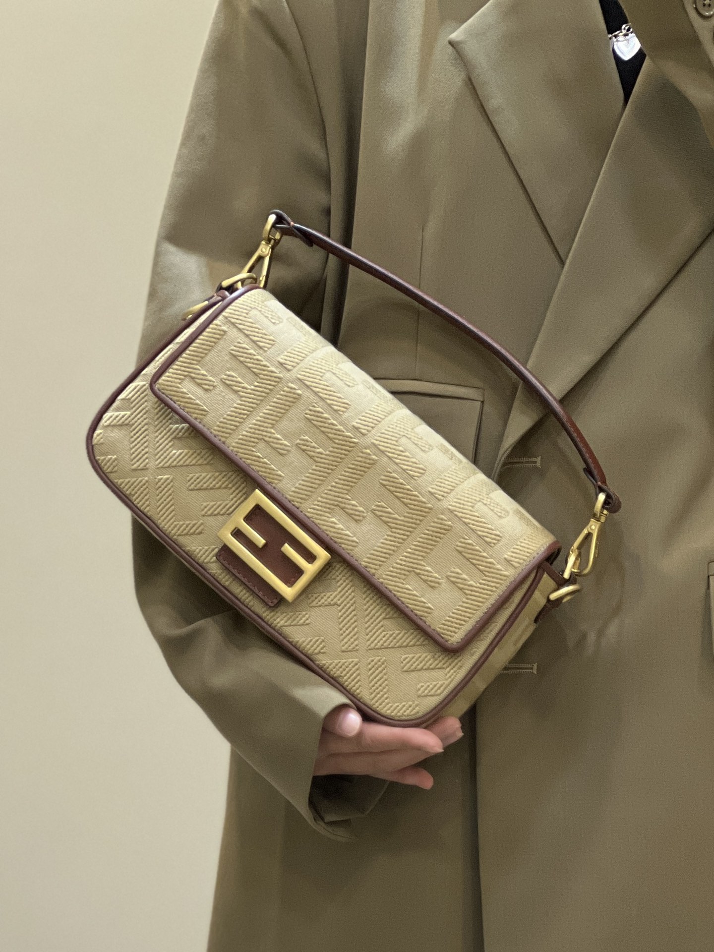 The FENDI iconic Baguette bag is crafted with premium canvas using advanced techniques, featuring double FF three-dimensional embroidery for an unbeatable texture. The exquisite contrasting edge trim adds a trendy and fashionable touch. The wide shoulder strap design and practical flip cover enhance its functionality, with small details visible throughout.