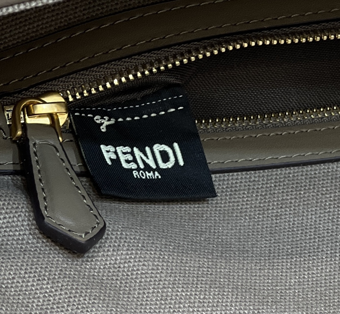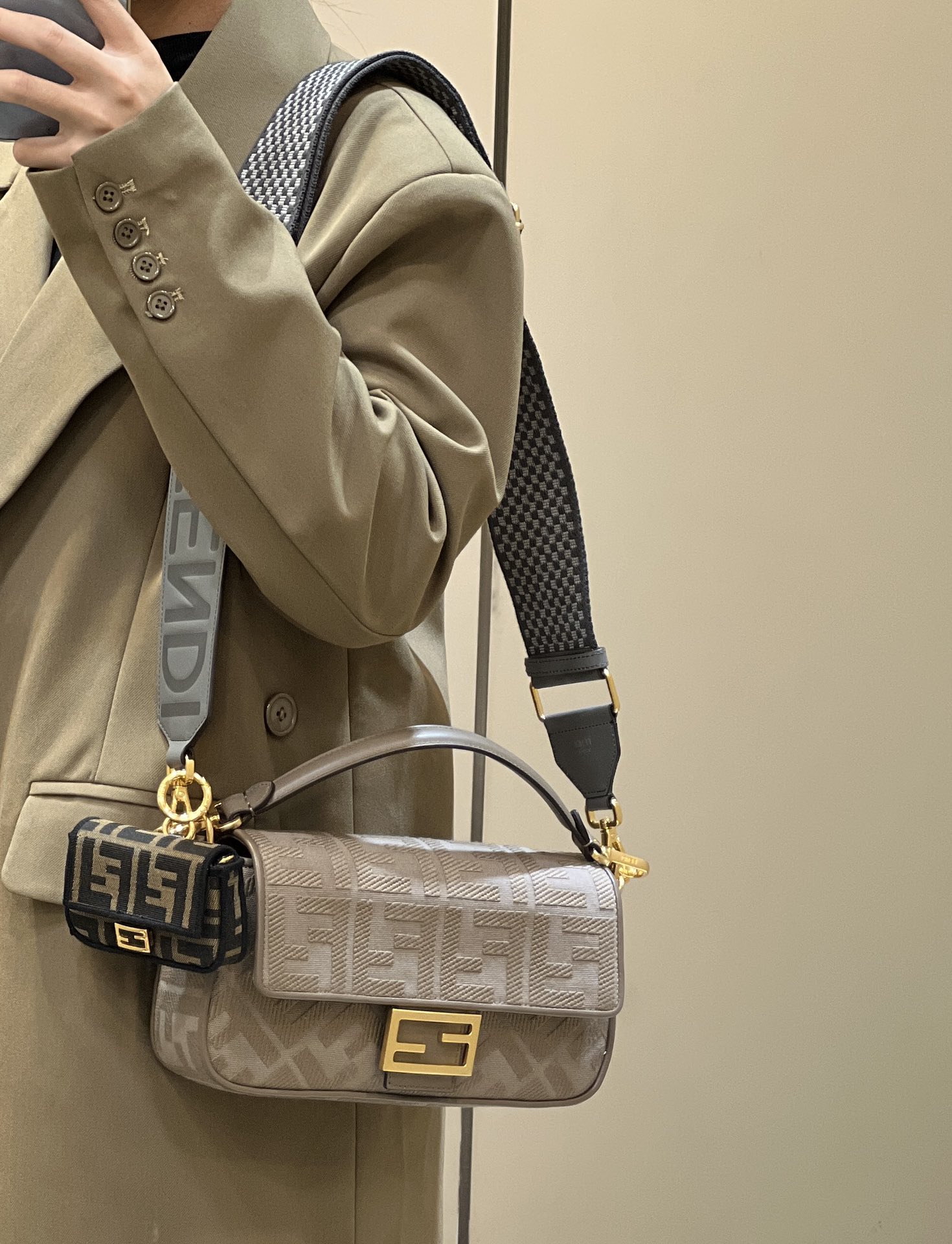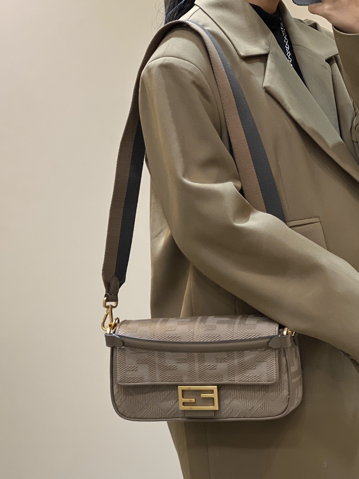 The FENDI iconic Baguette bag is crafted with premium canvas using advanced techniques, featuring double FF three-dimensional embroidery for an unbeatable texture. The exquisite contrasting edge trim adds a trendy and fashionable touch. The wide shoulder strap design and practical flip cover enhance its functionality, with small details visible throughout.