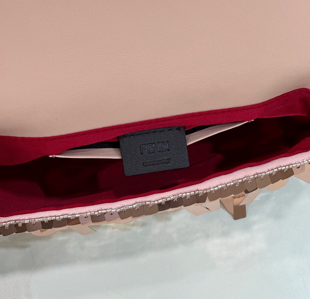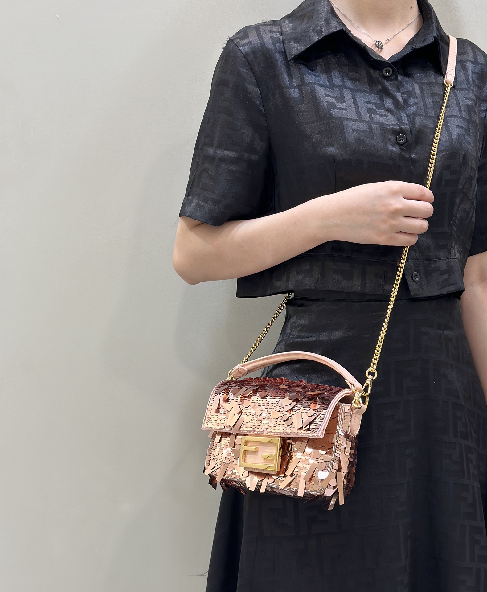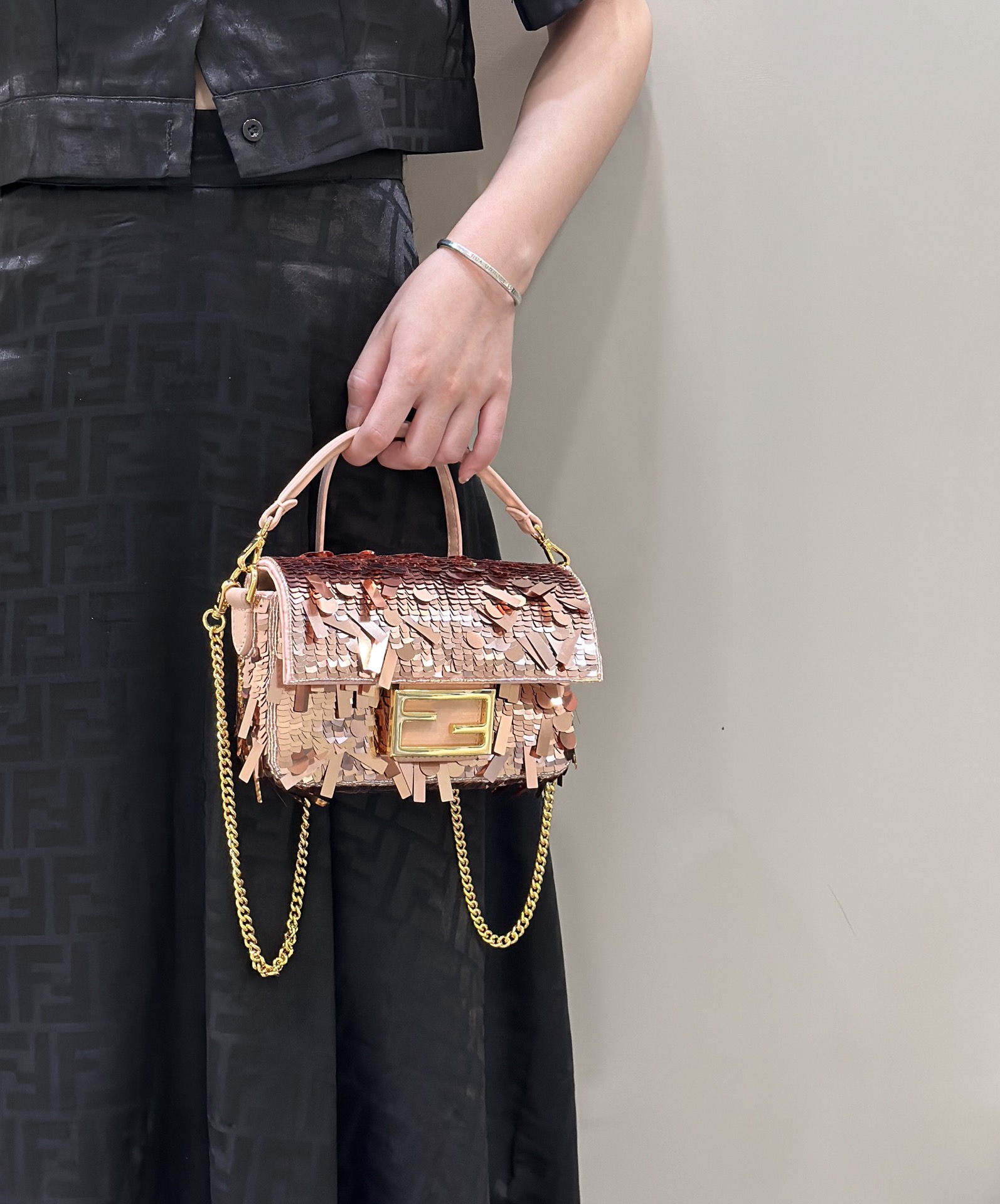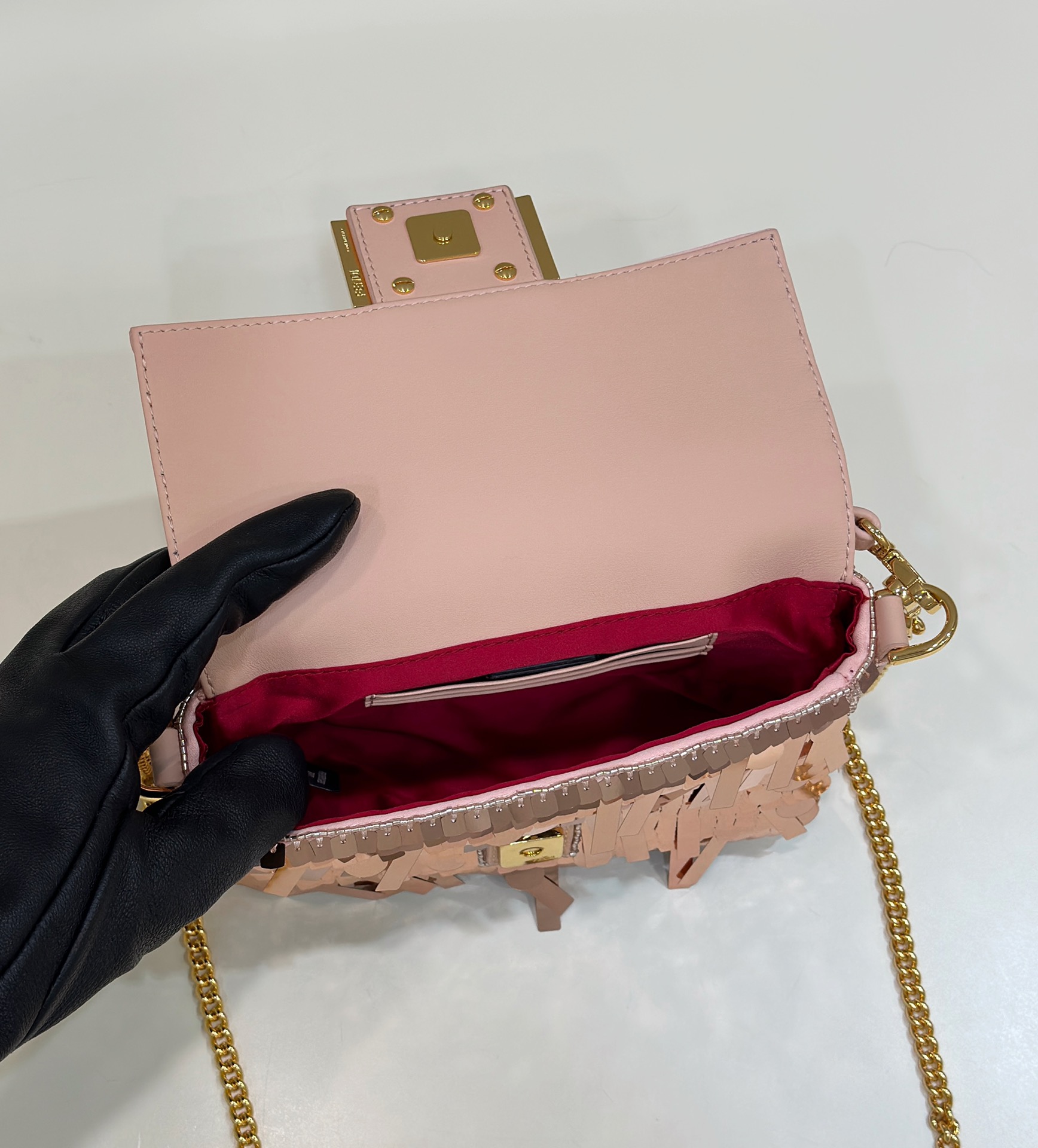 The Fendi Baguette is embellished with beads on its exterior, and every detail is meticulously hand-sewn with over 100 craftsmanship techniques. It is painstakingly crafted with the goal of presenting the best possible product to everyone, with every detail faithfully reproduced. Its capacity remains functional in all aspects.