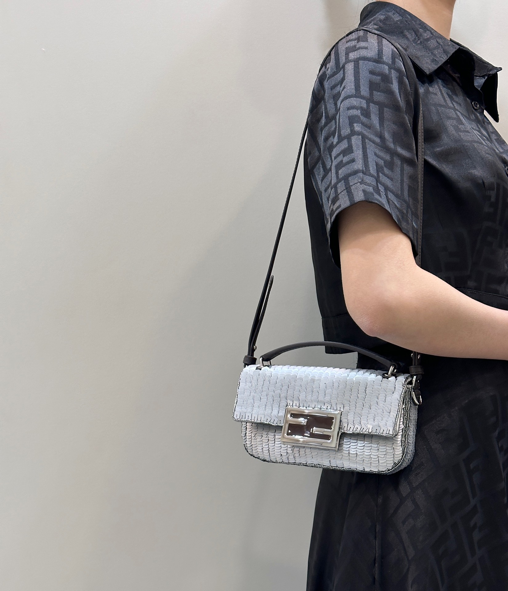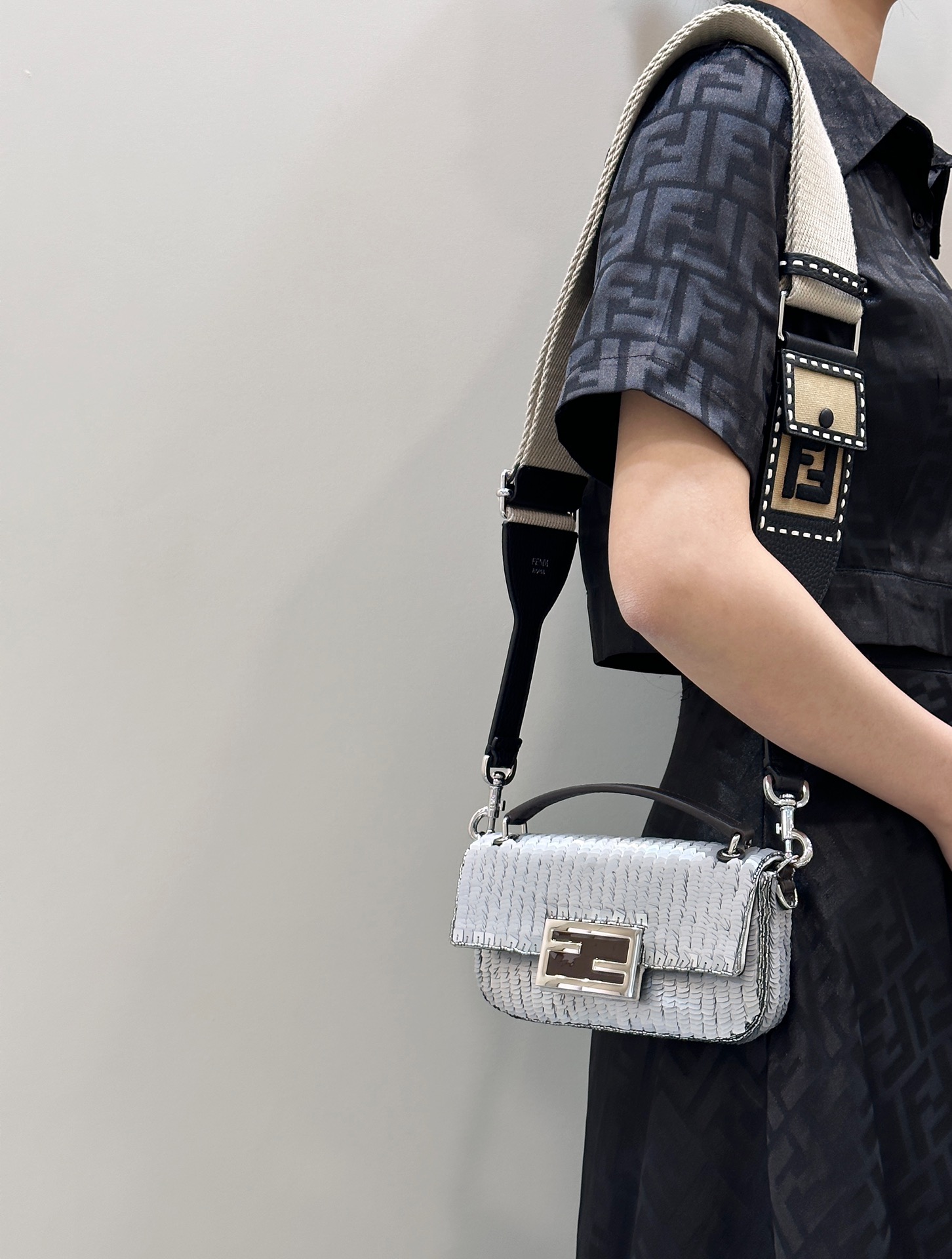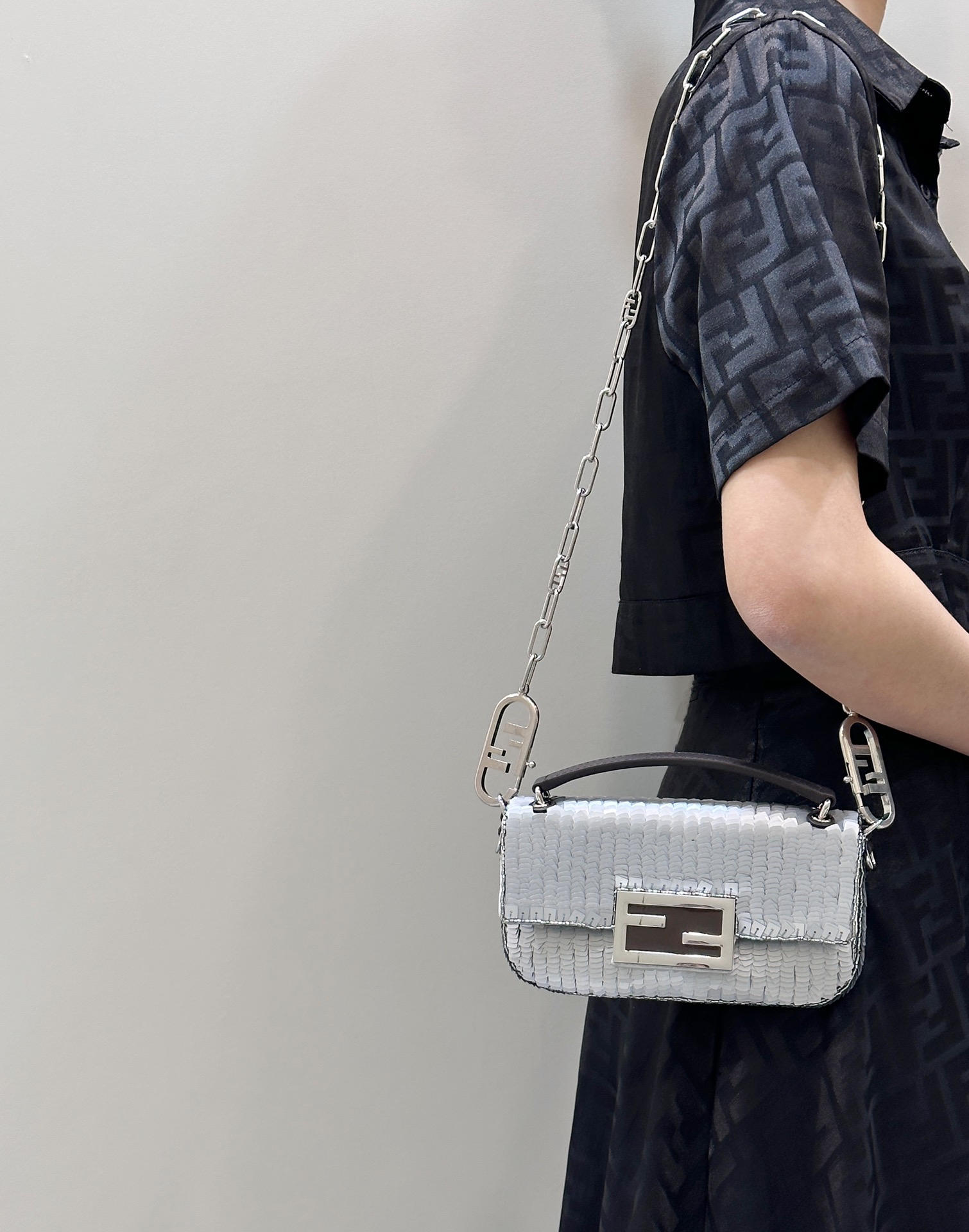 The Fendi Baguette is embellished with beads on its exterior, and every detail is meticulously hand-sewn with over 100 craftsmanship techniques. It is painstakingly crafted with the goal of presenting the best possible product to everyone, with every detail faithfully reproduced. Its capacity remains functional in all aspects.