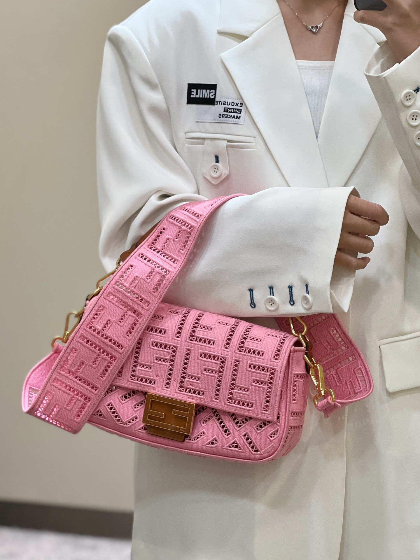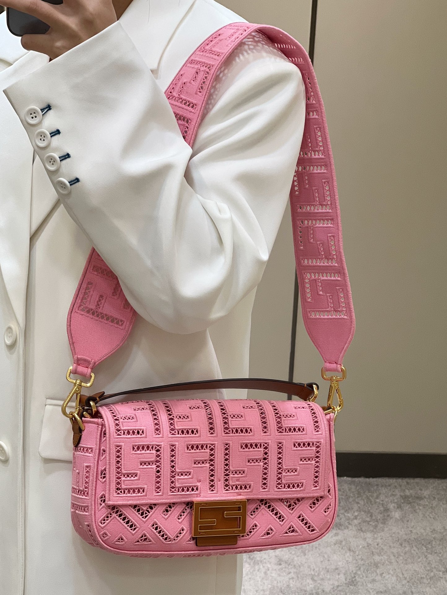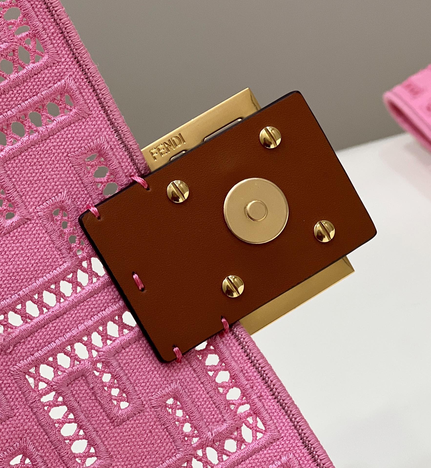 FENDI FHTH FF Fabric Openwork Baguette Handbag pink