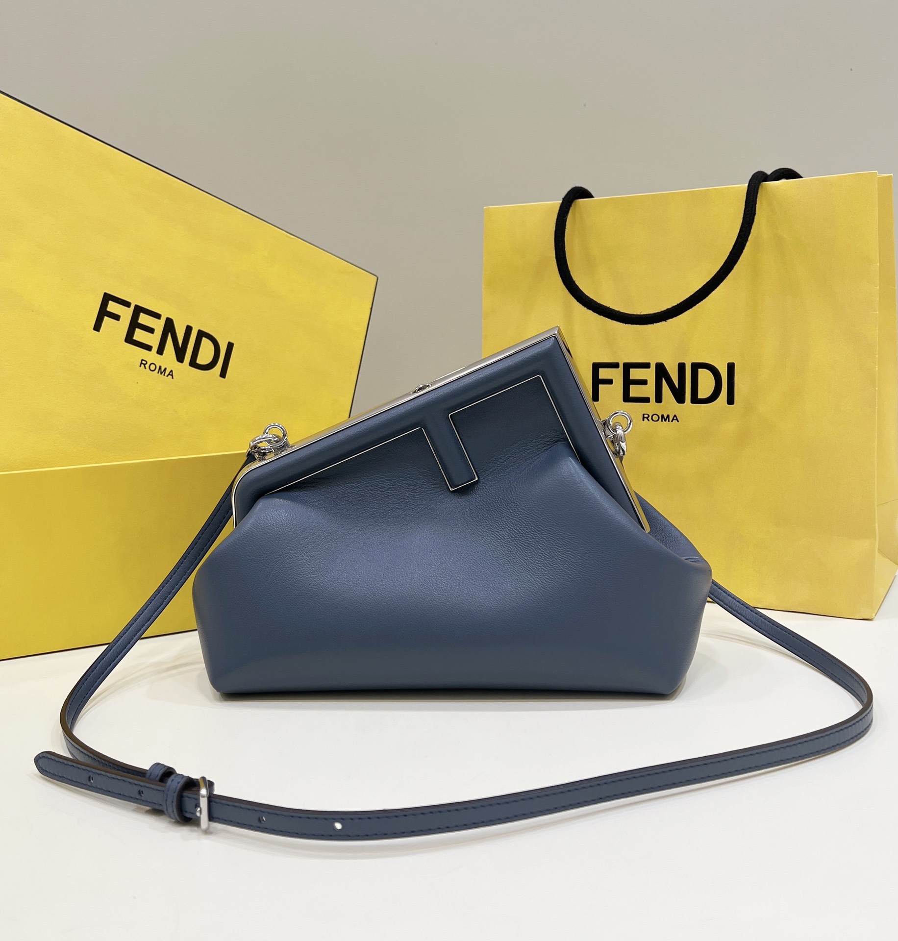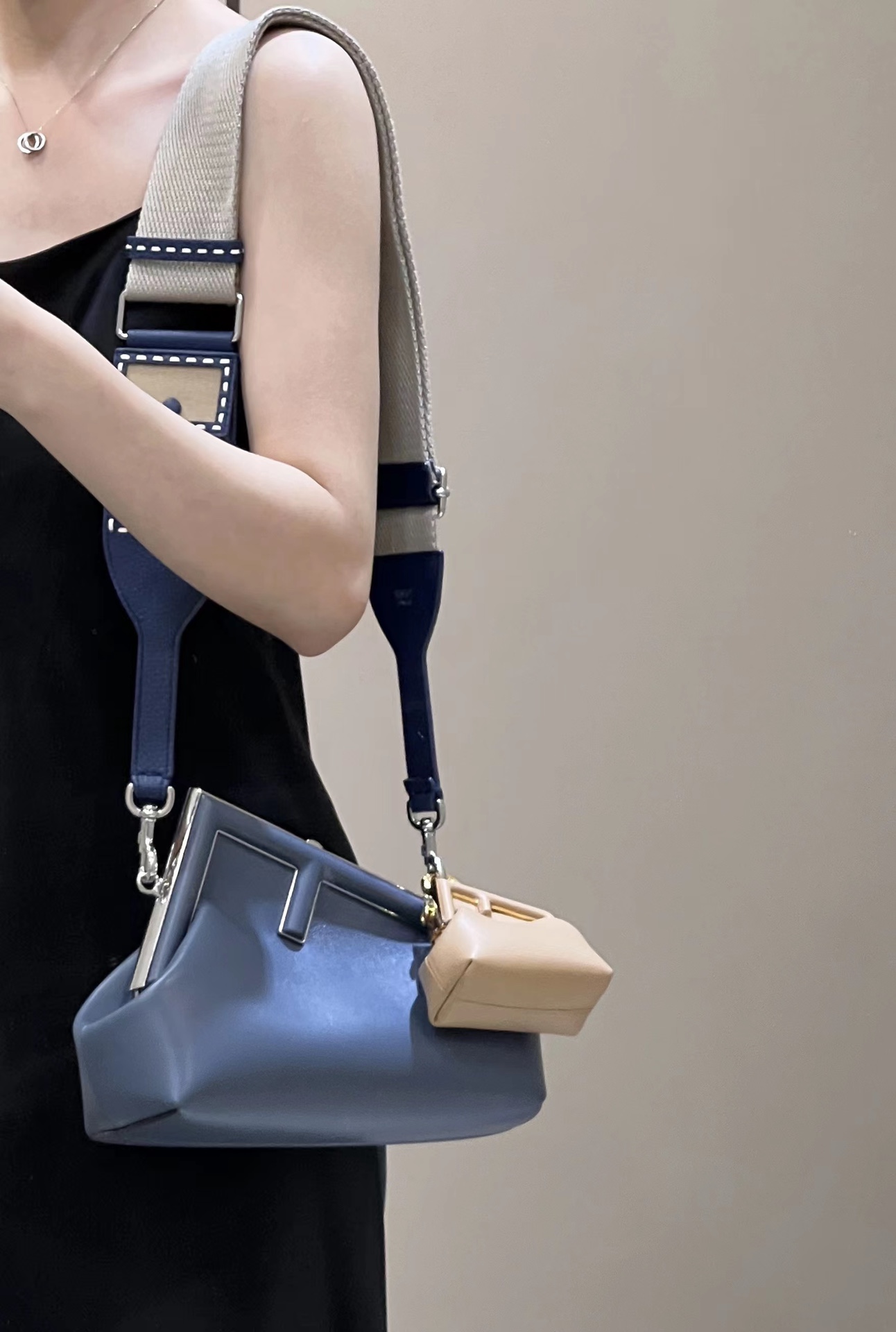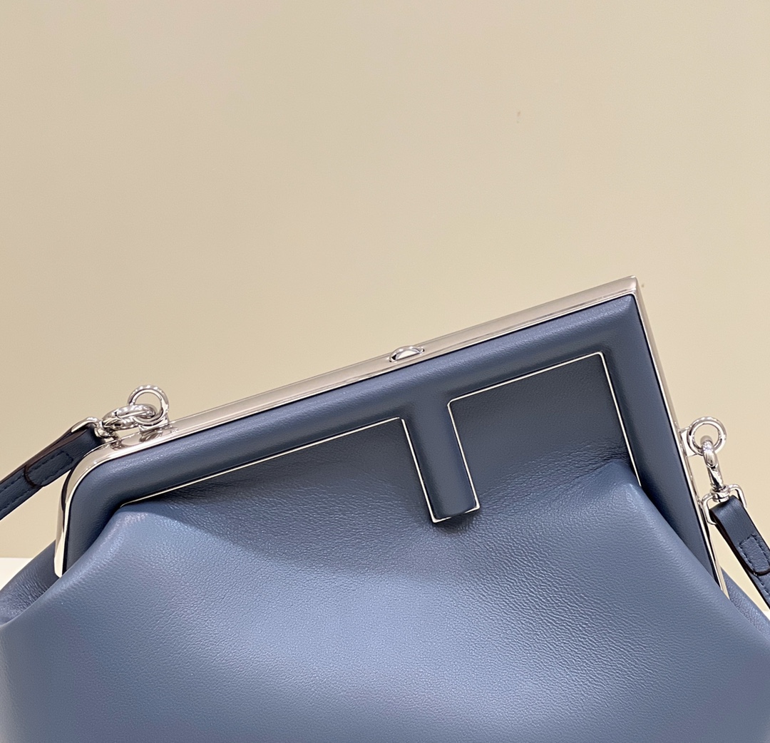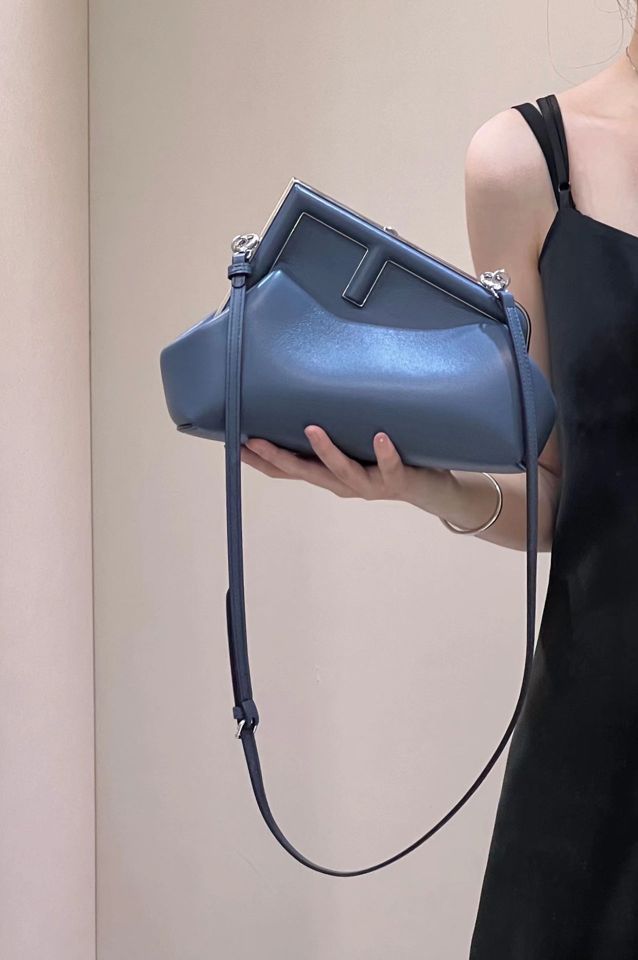 The Fendi First collection features the letter "F" as a prominent design element, with slanting frame contours that create a unique and innovative appearance. The asymmetrical bag shapes are fashionable and sleek, designed to be used as handbags with the option of a detachable shoulder strap for use as a shoulder bag. The hand-held style is perfect, and the multi-functional design allows for versatile use. The supple leather offers a luxurious feel, and this bag has been recommended by many celebrities.