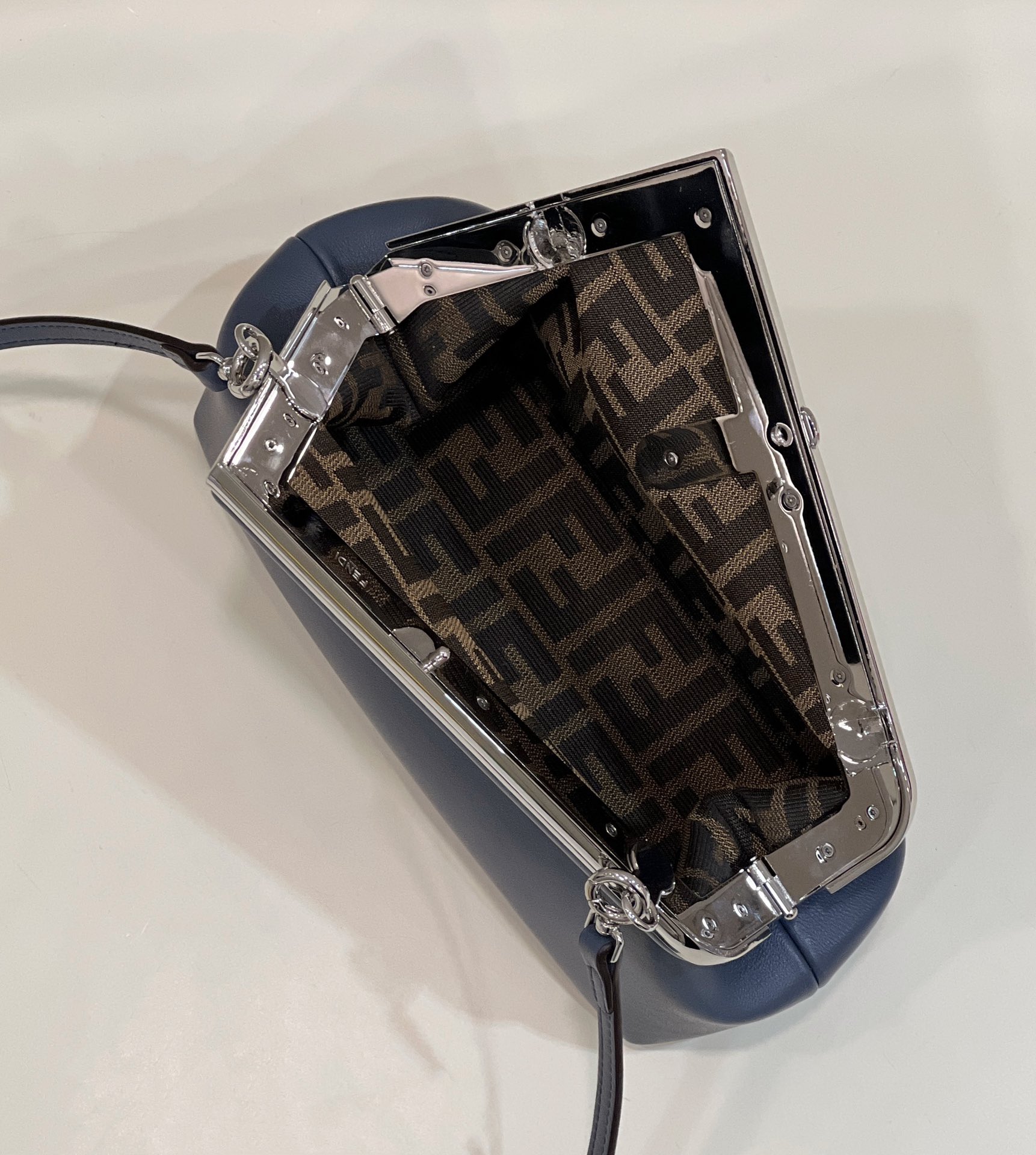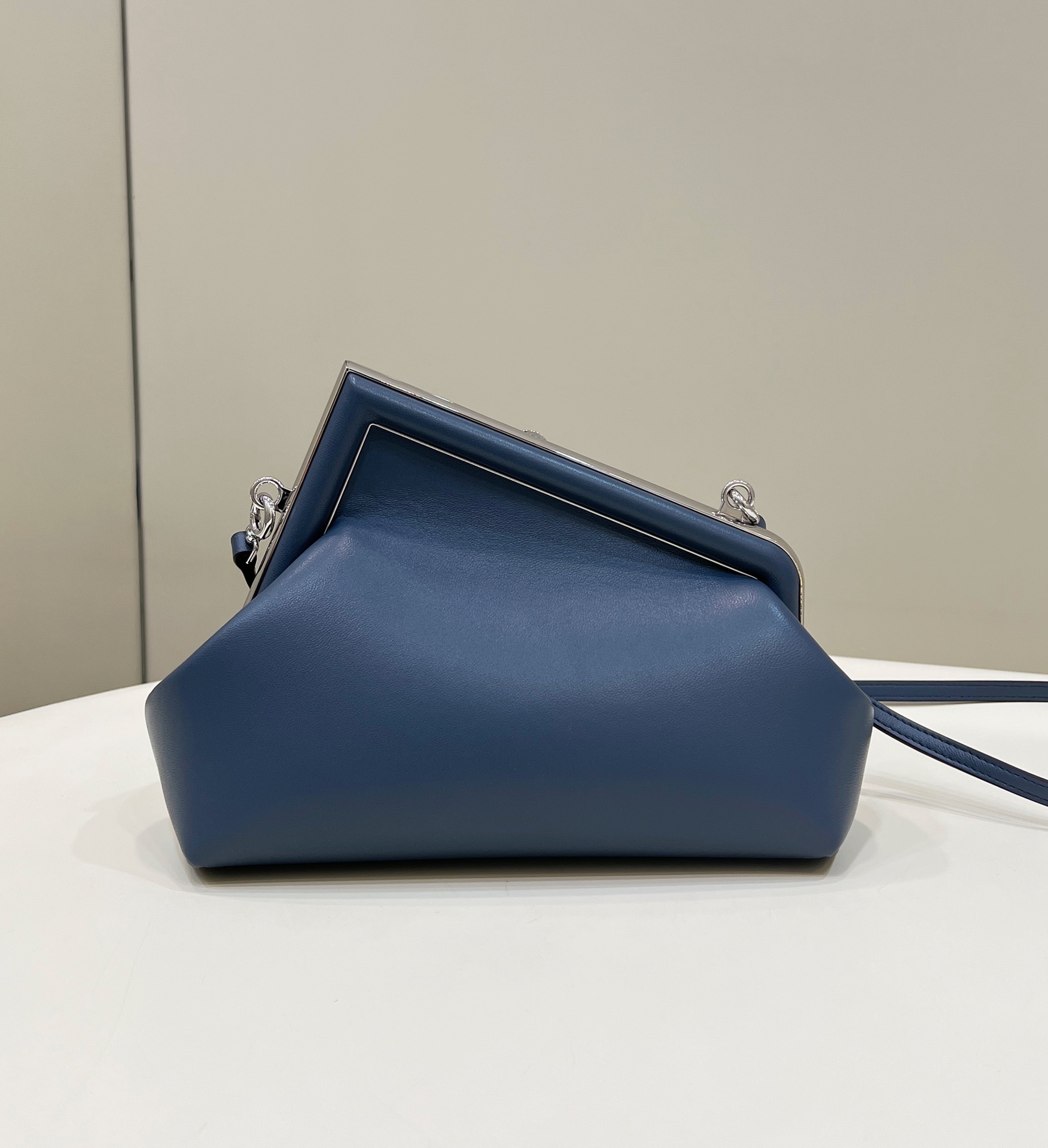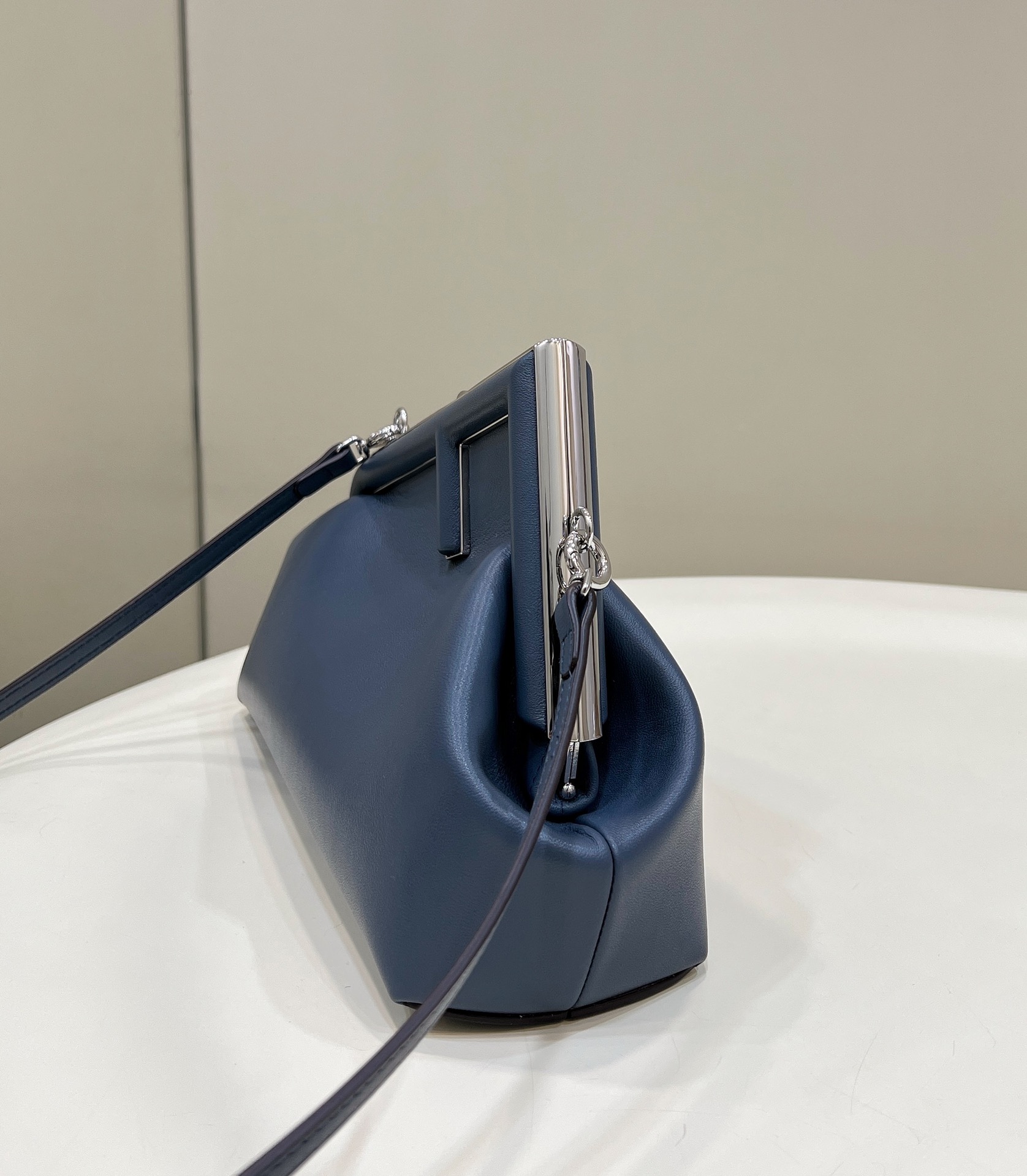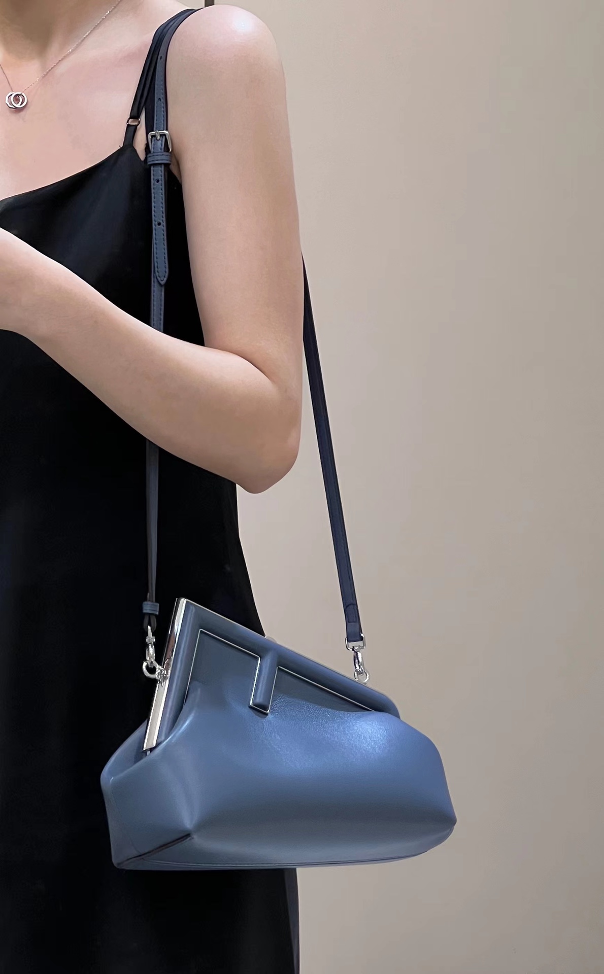 The Fendi First collection features the letter "F" as a prominent design element, with slanting frame contours that create a unique and innovative appearance. The asymmetrical bag shapes are fashionable and sleek, designed to be used as handbags with the option of a detachable shoulder strap for use as a shoulder bag. The hand-held style is perfect, and the multi-functional design allows for versatile use. The supple leather offers a luxurious feel, and this bag has been recommended by many celebrities.