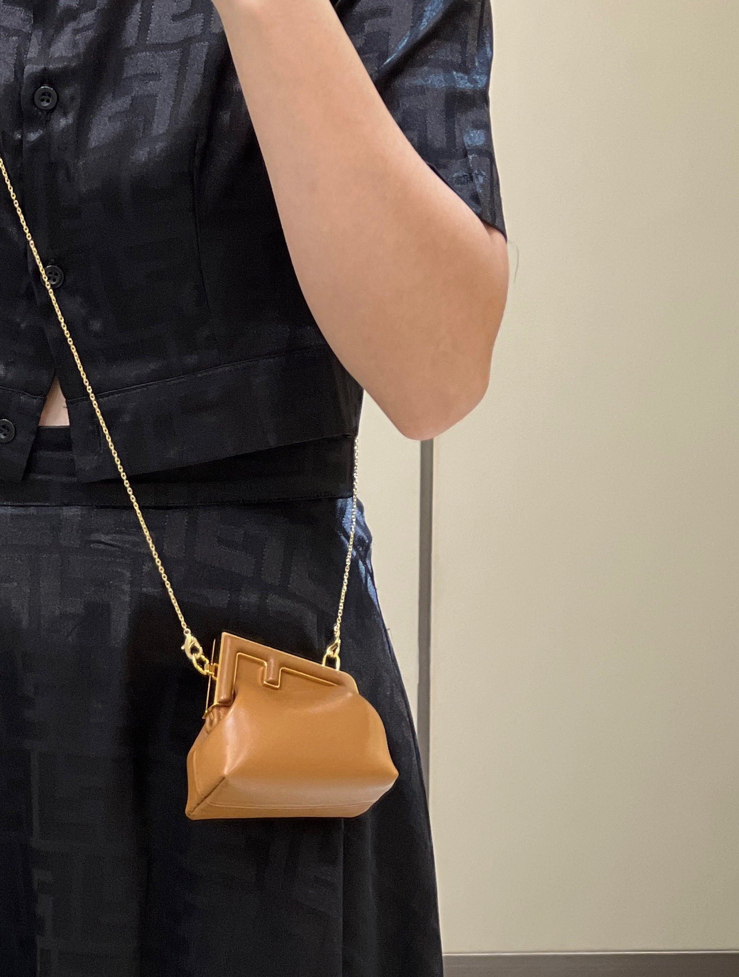 The Fendi First Collection features the letter "F" as a design highlight, with slanted frame outlines and unique asymmetrical bag shapes. The exterior design is chic and innovative, perfect for use as a handbag with a detachable shoulder strap that can also be used as a shoulder bag. The handheld option is flawless, with multi-functional use and soft leather that feels amazing to the touch. This bag has been recommended by numerous celebrities and is worth owning.