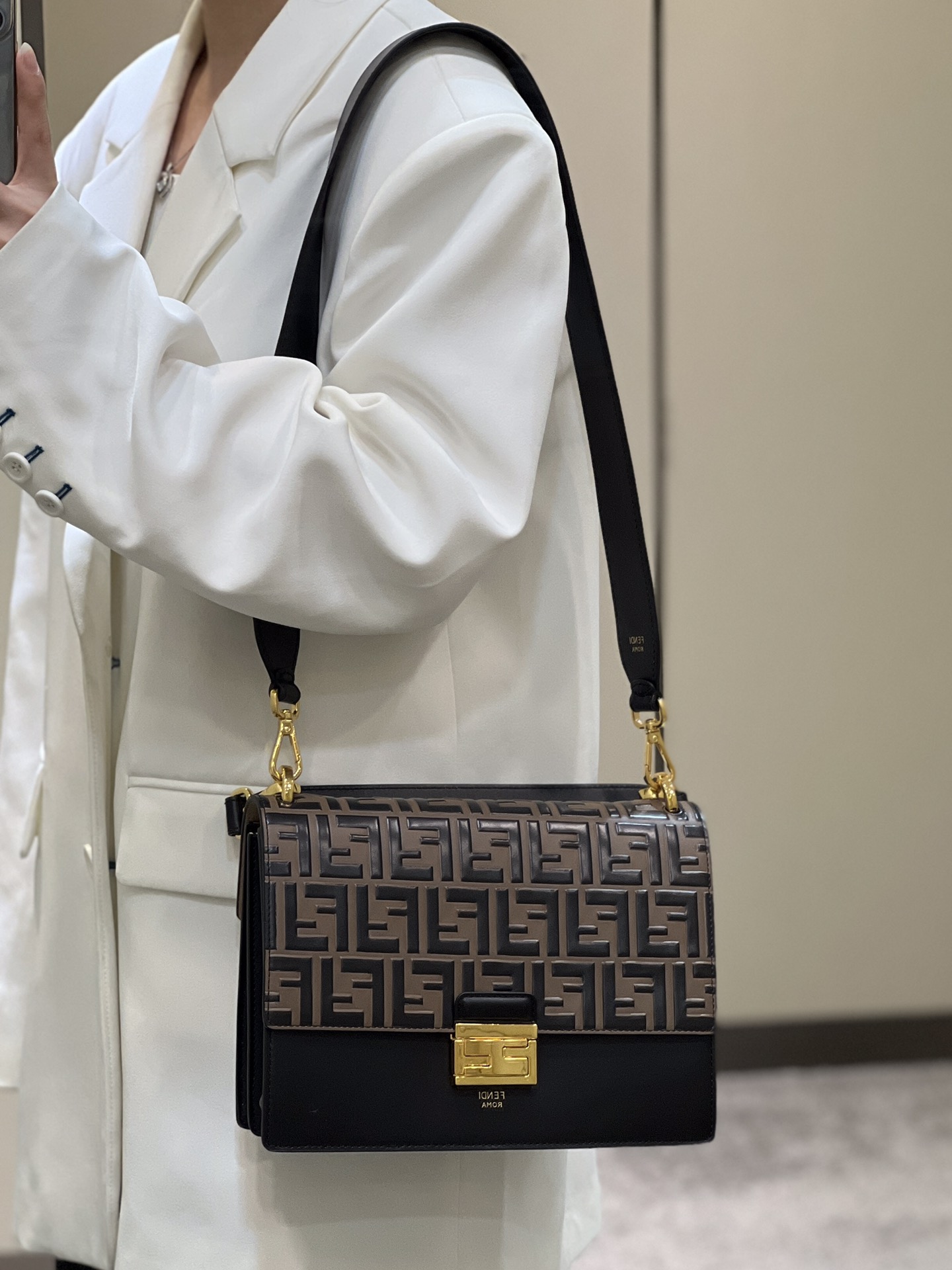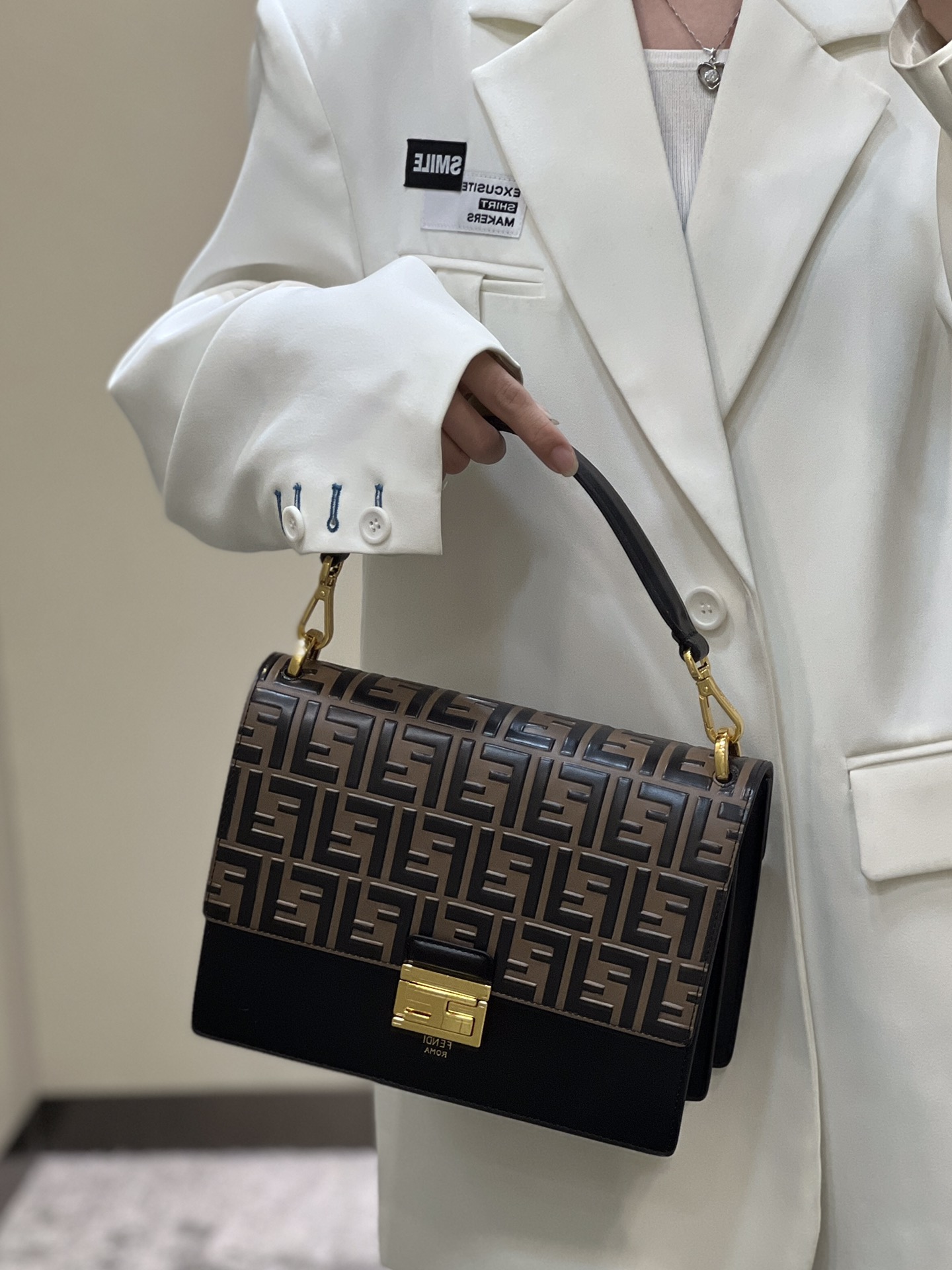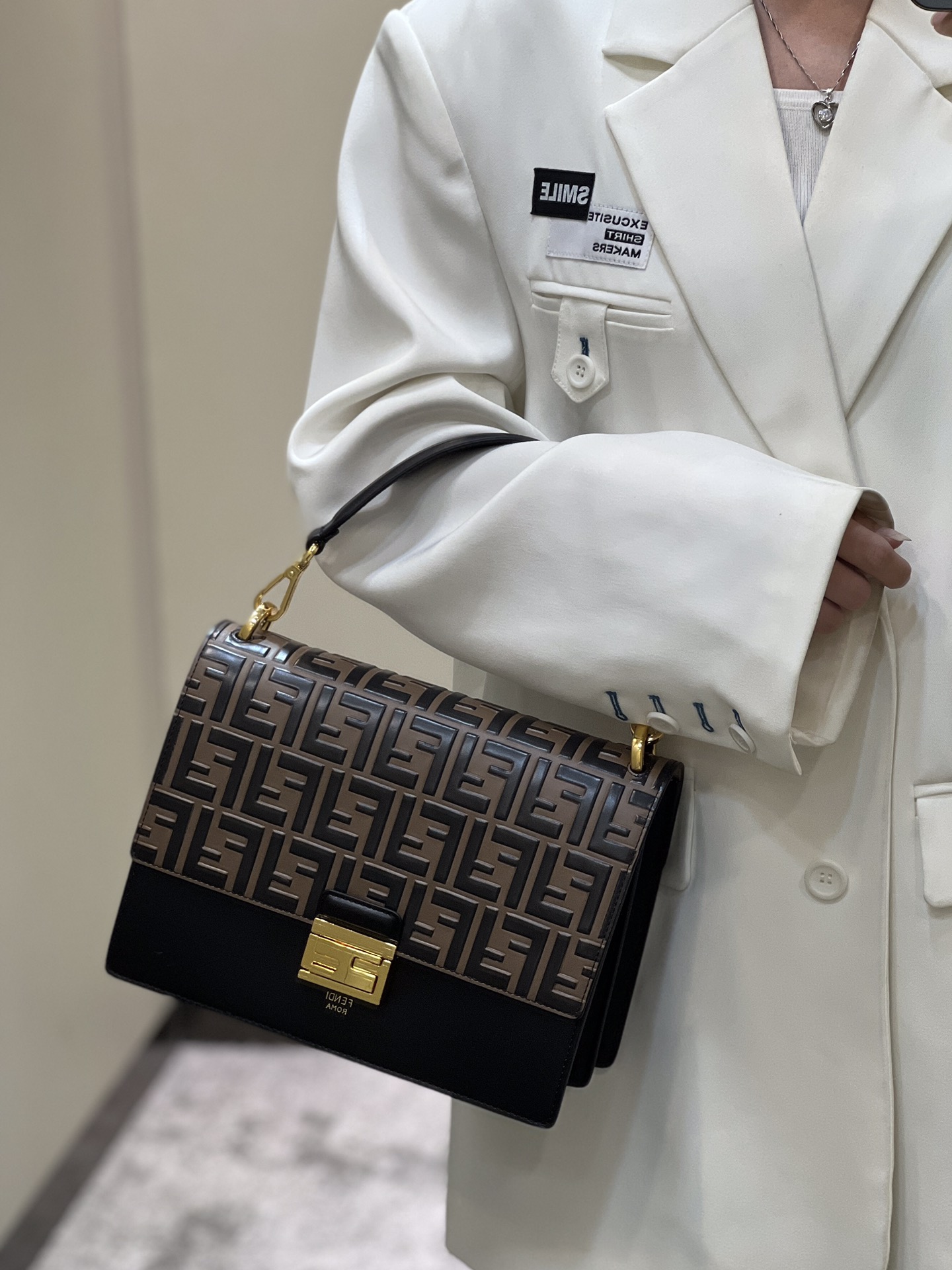 Fendi upgraded handbag, featuring the classic embossed logo pattern, flip-over design for practicality and convenience, adorned with exclusive custom hardware logo, can be carried by hand or worn as a crossbody.