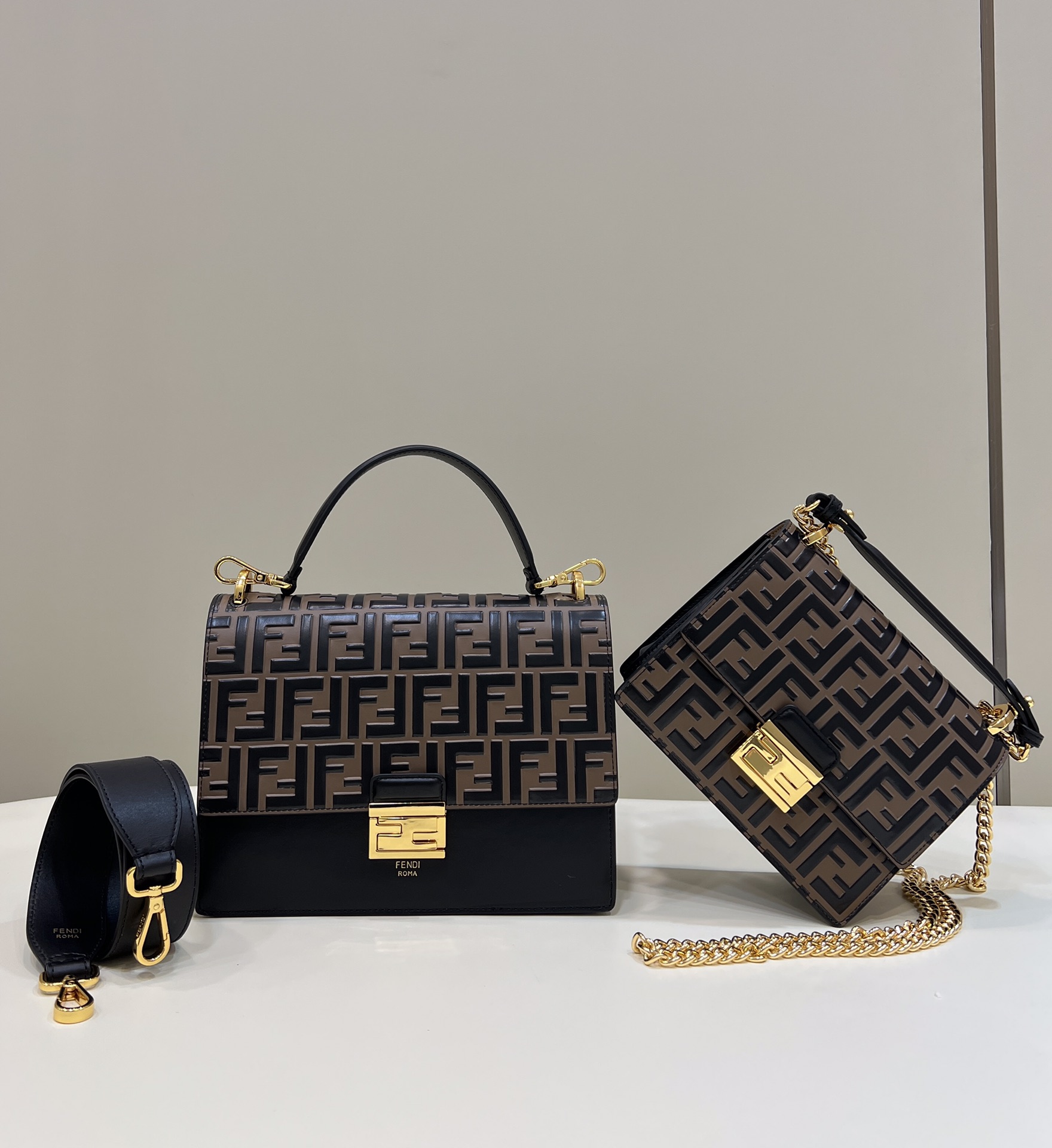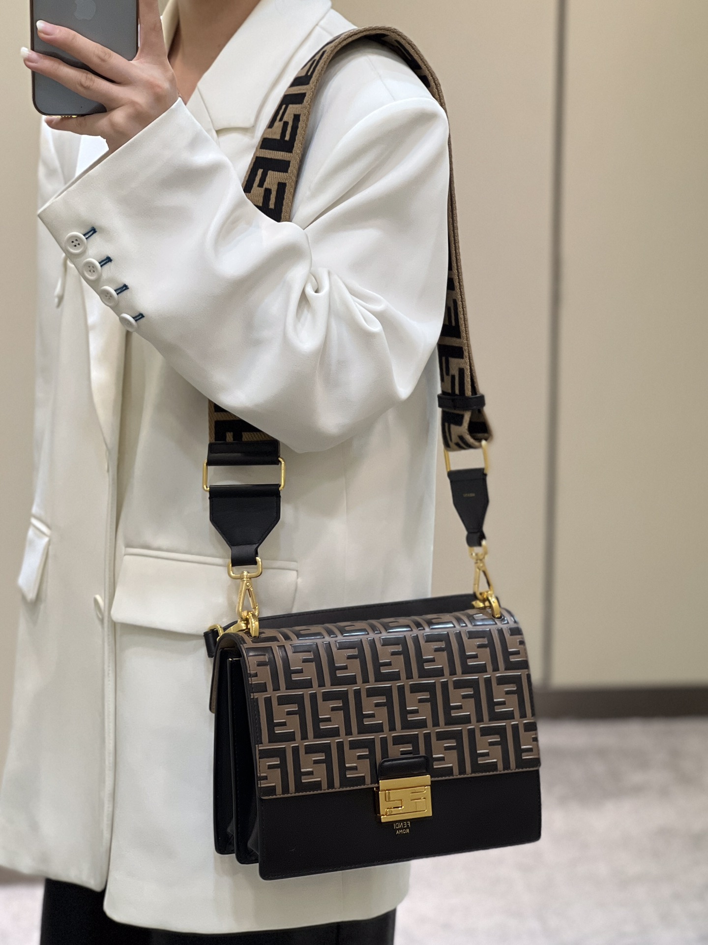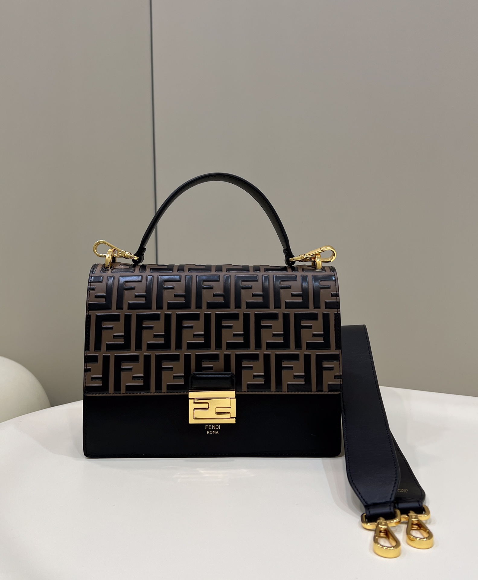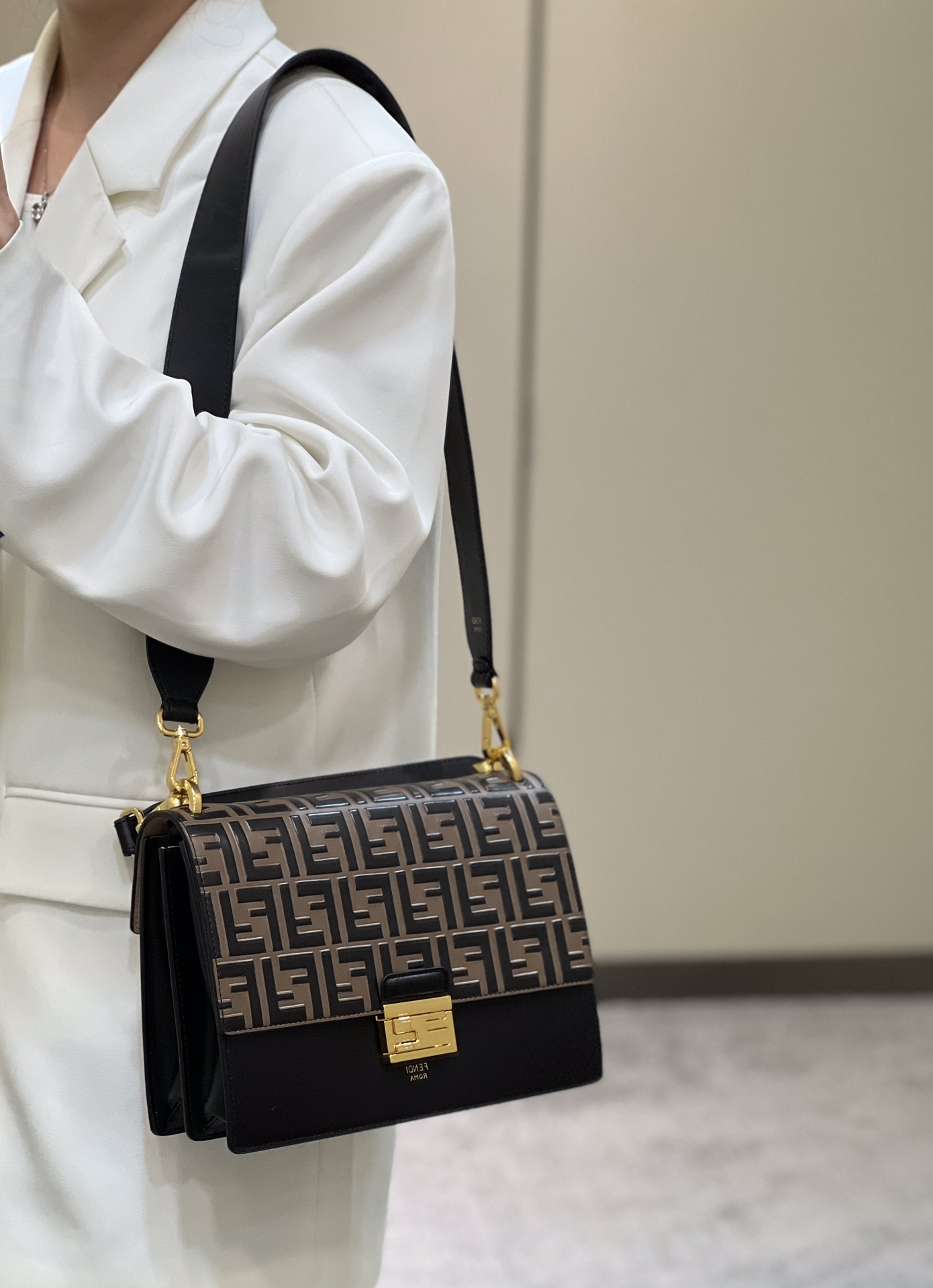 Fendi upgraded handbag, featuring the classic embossed logo pattern, flip-over design for practicality and convenience, adorned with exclusive custom hardware logo, can be carried by hand or worn as a crossbody.