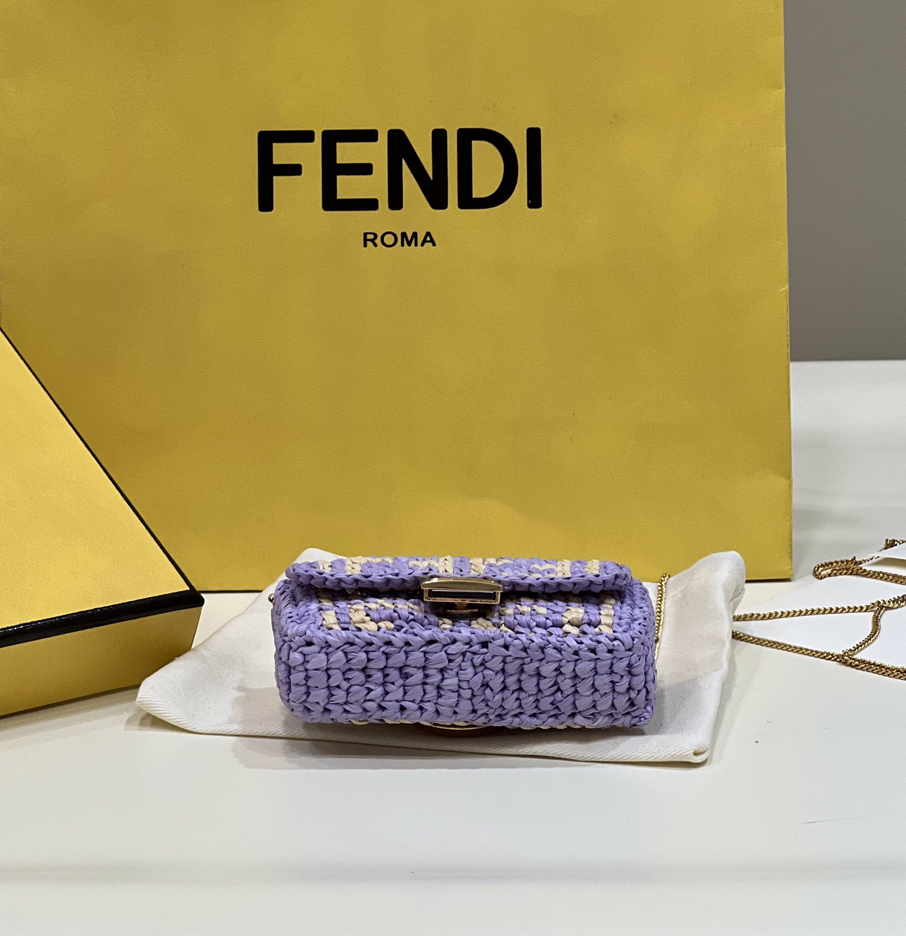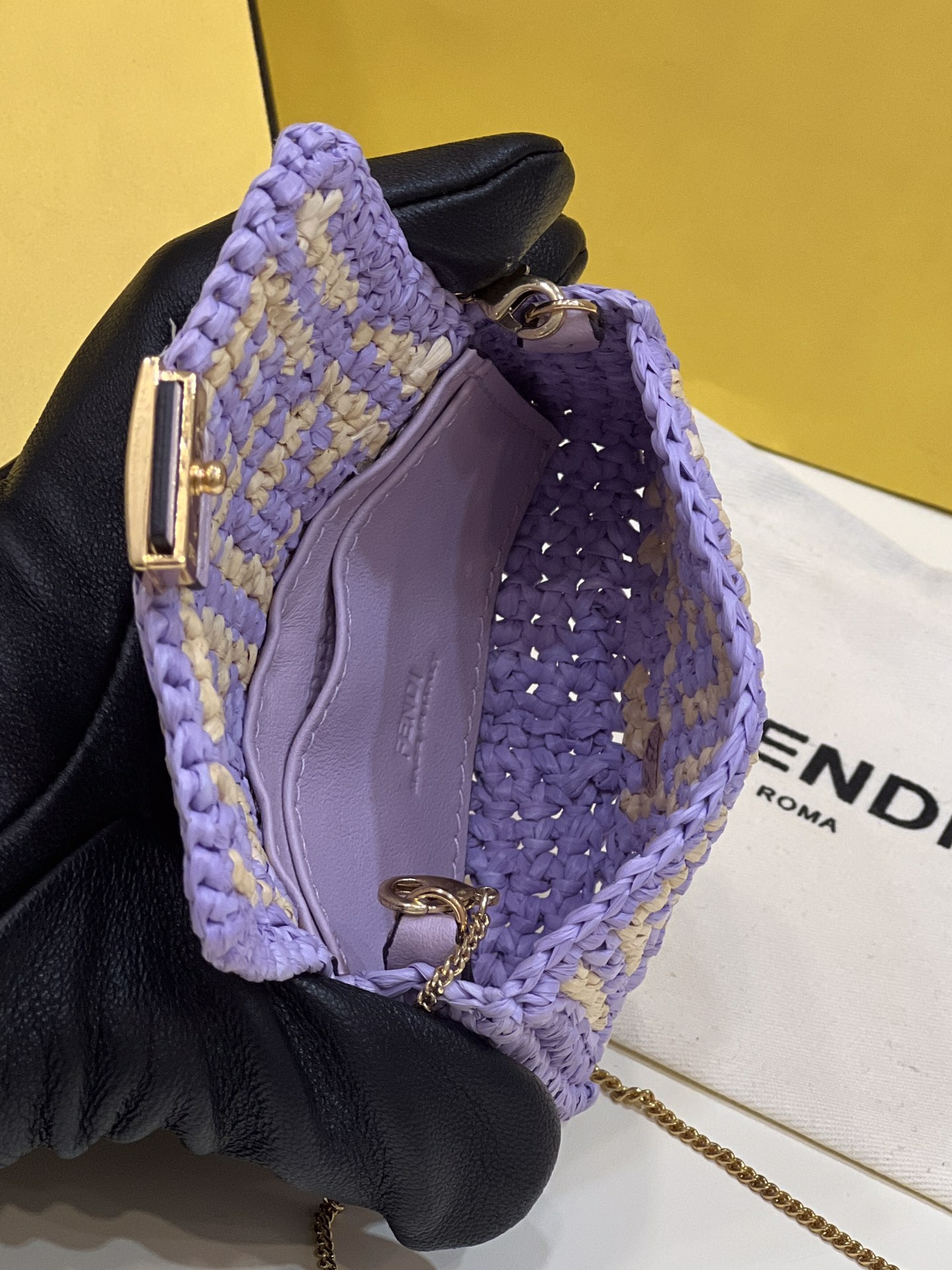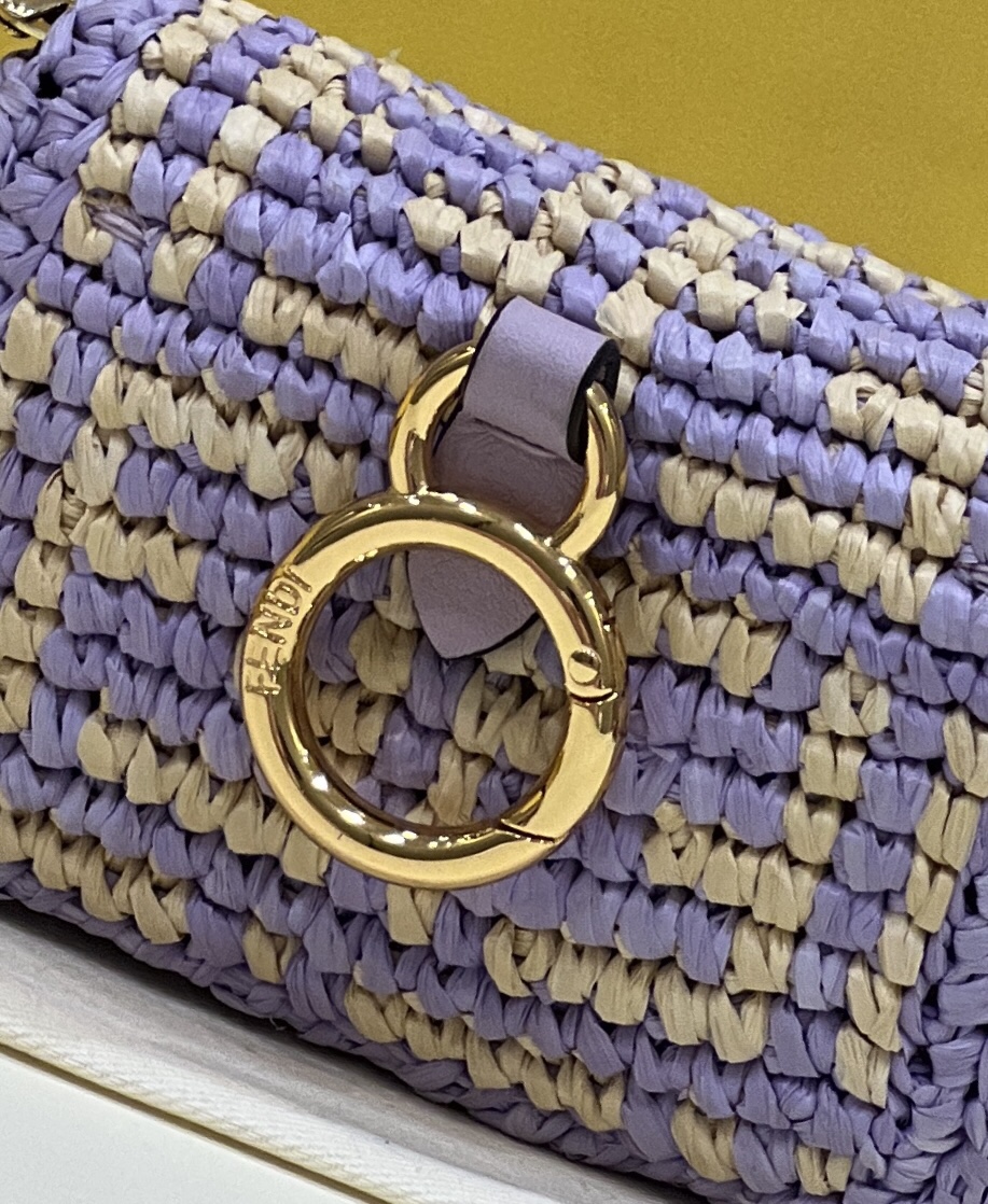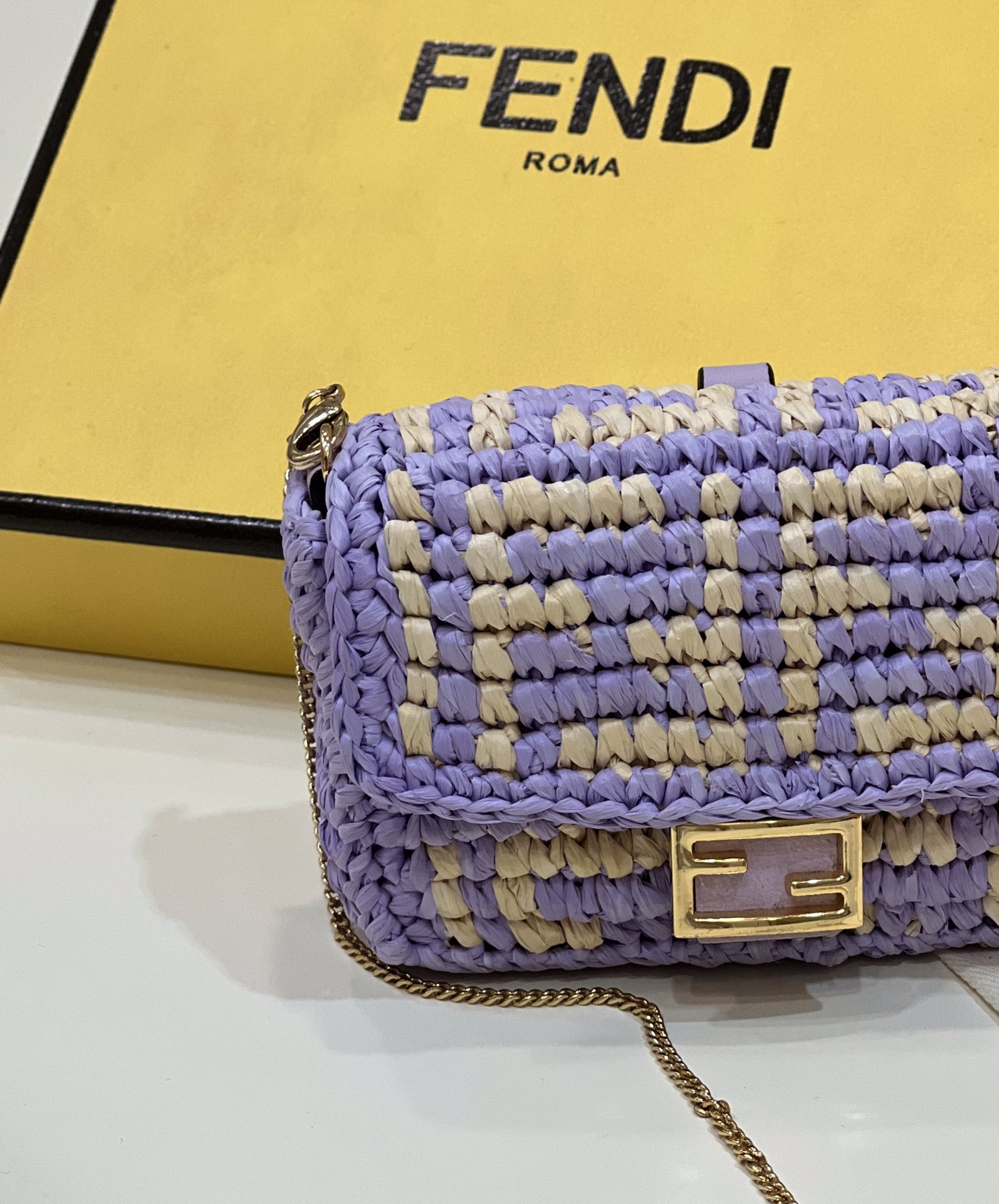 Introducing the FENDI Raffia Woven Mini Baguette, a cute and trendy handwoven mini baguette in soft pastel colors that's incredibly popular. It can be paired with various outfits and is perfect for any occasion.