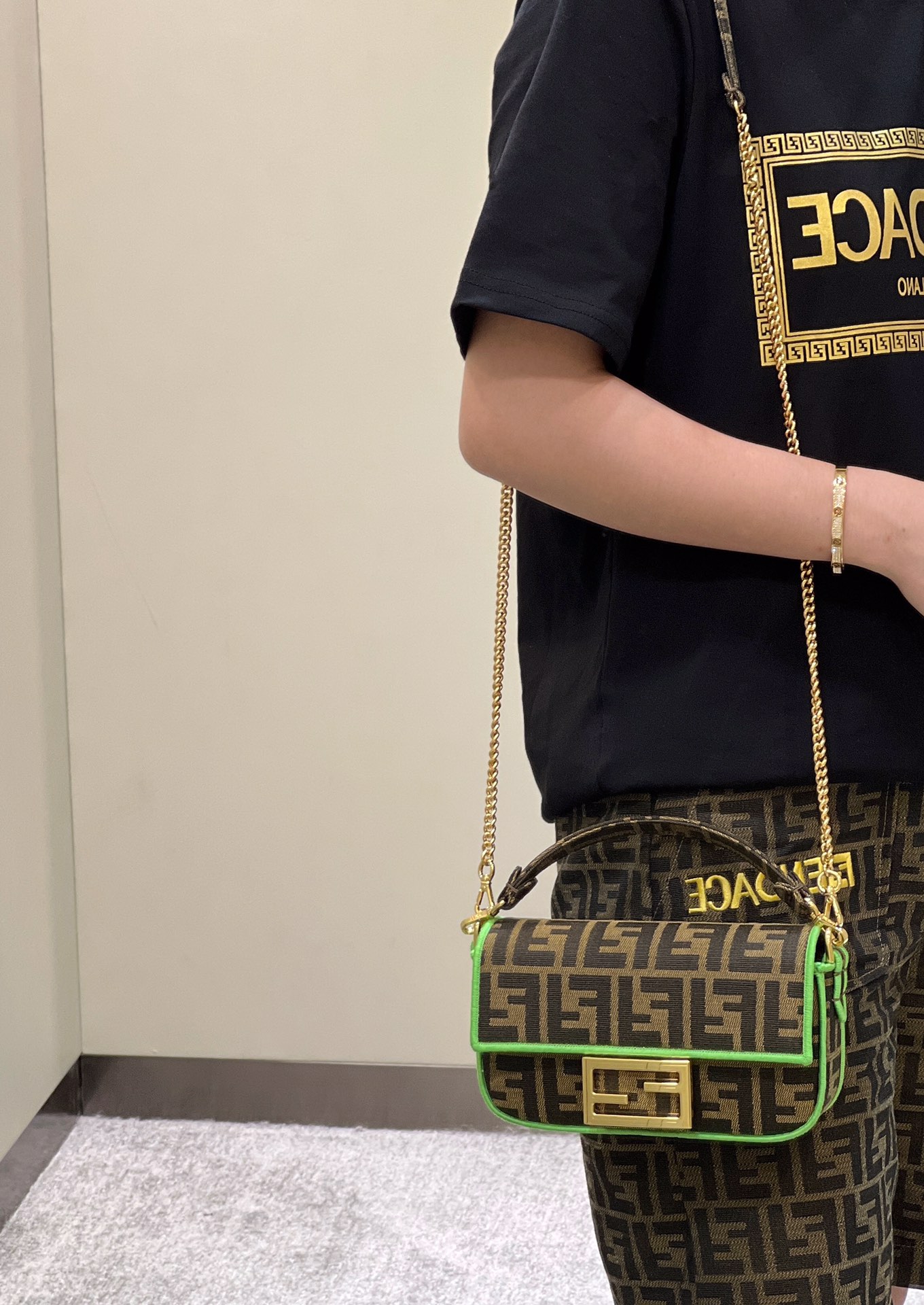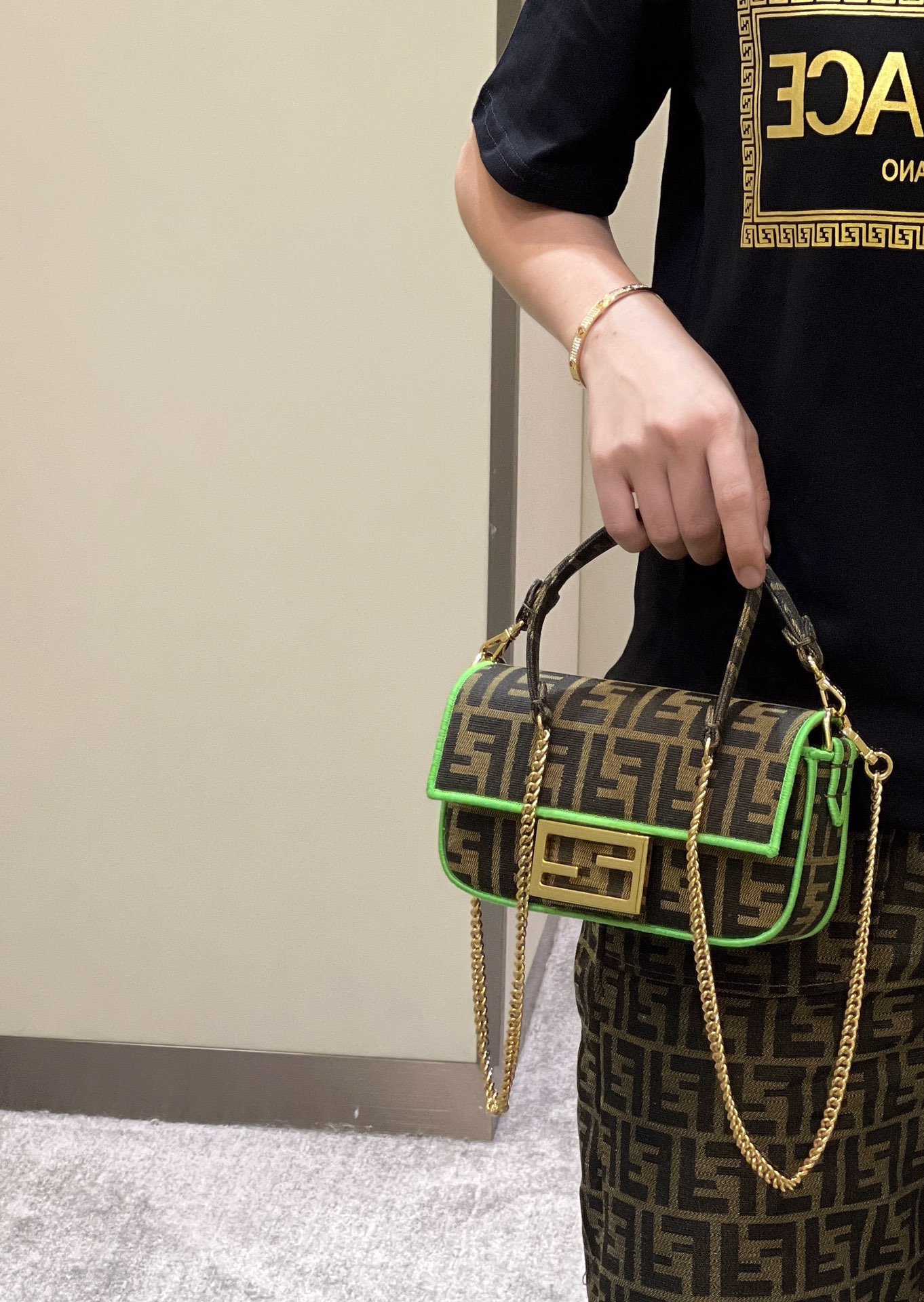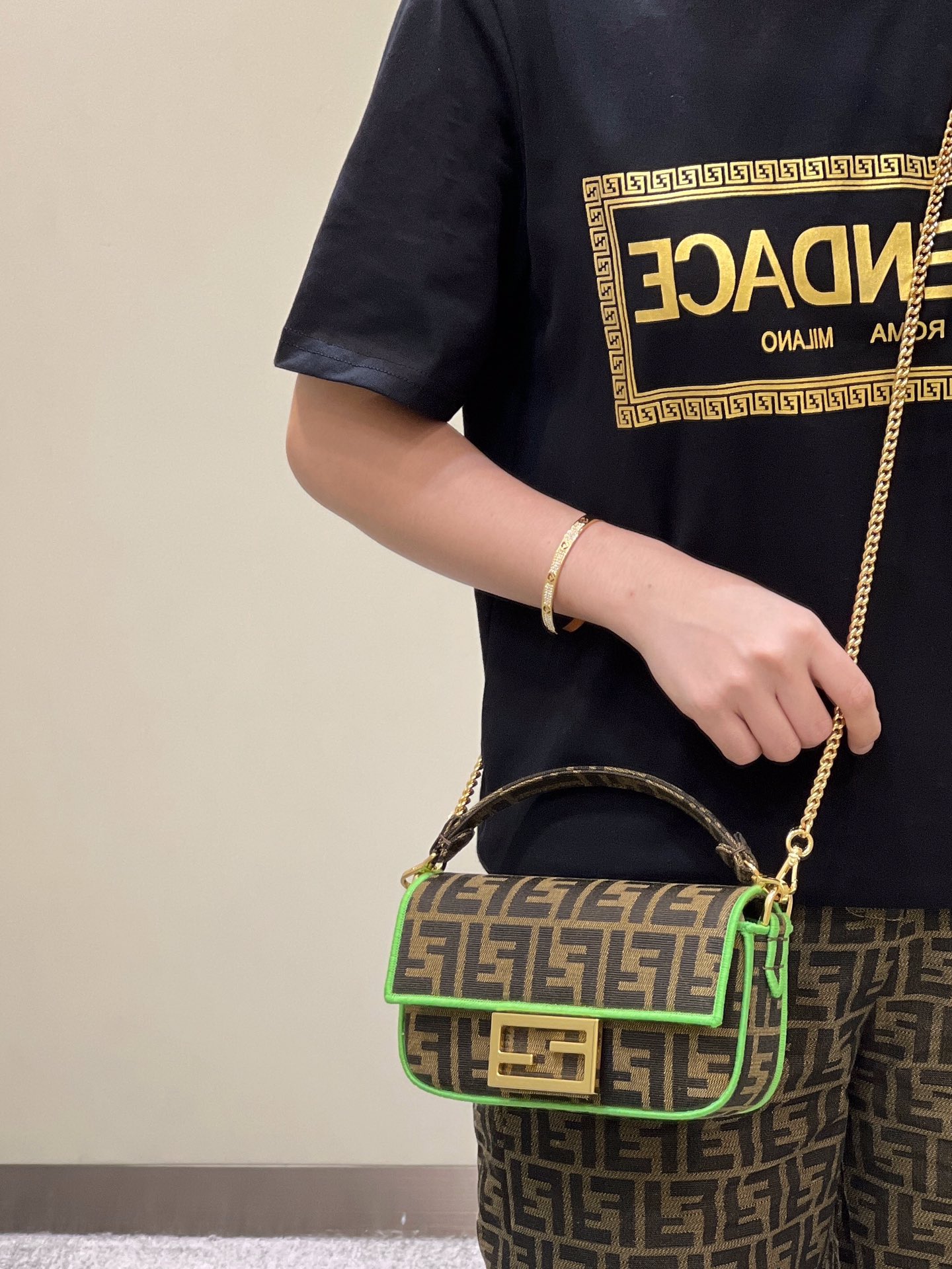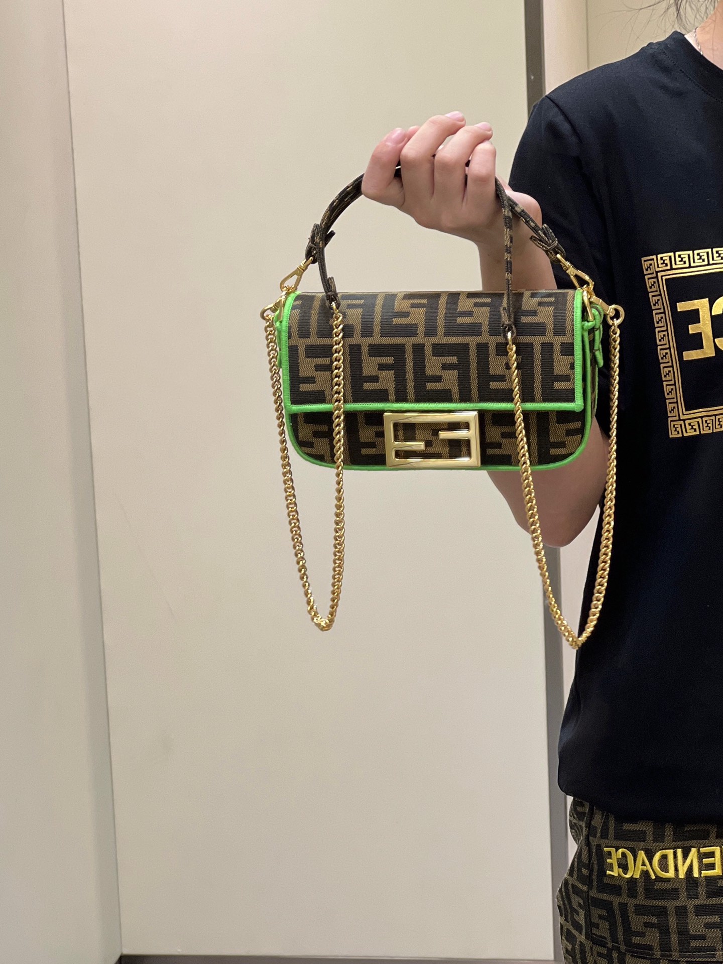Baguette-style bag, classic double F fabric, logo signature chain shoulder strap, lightweight and versatile.