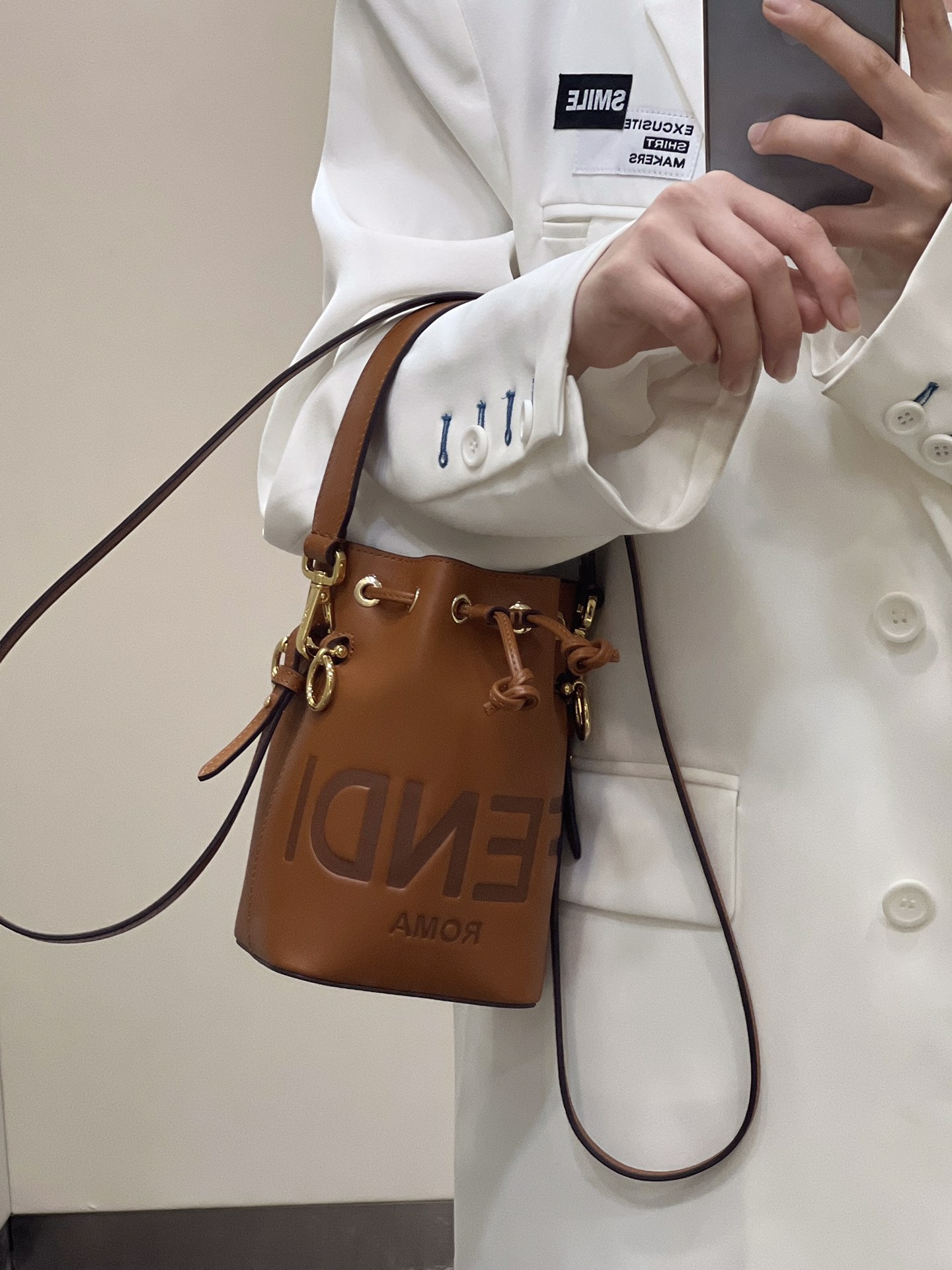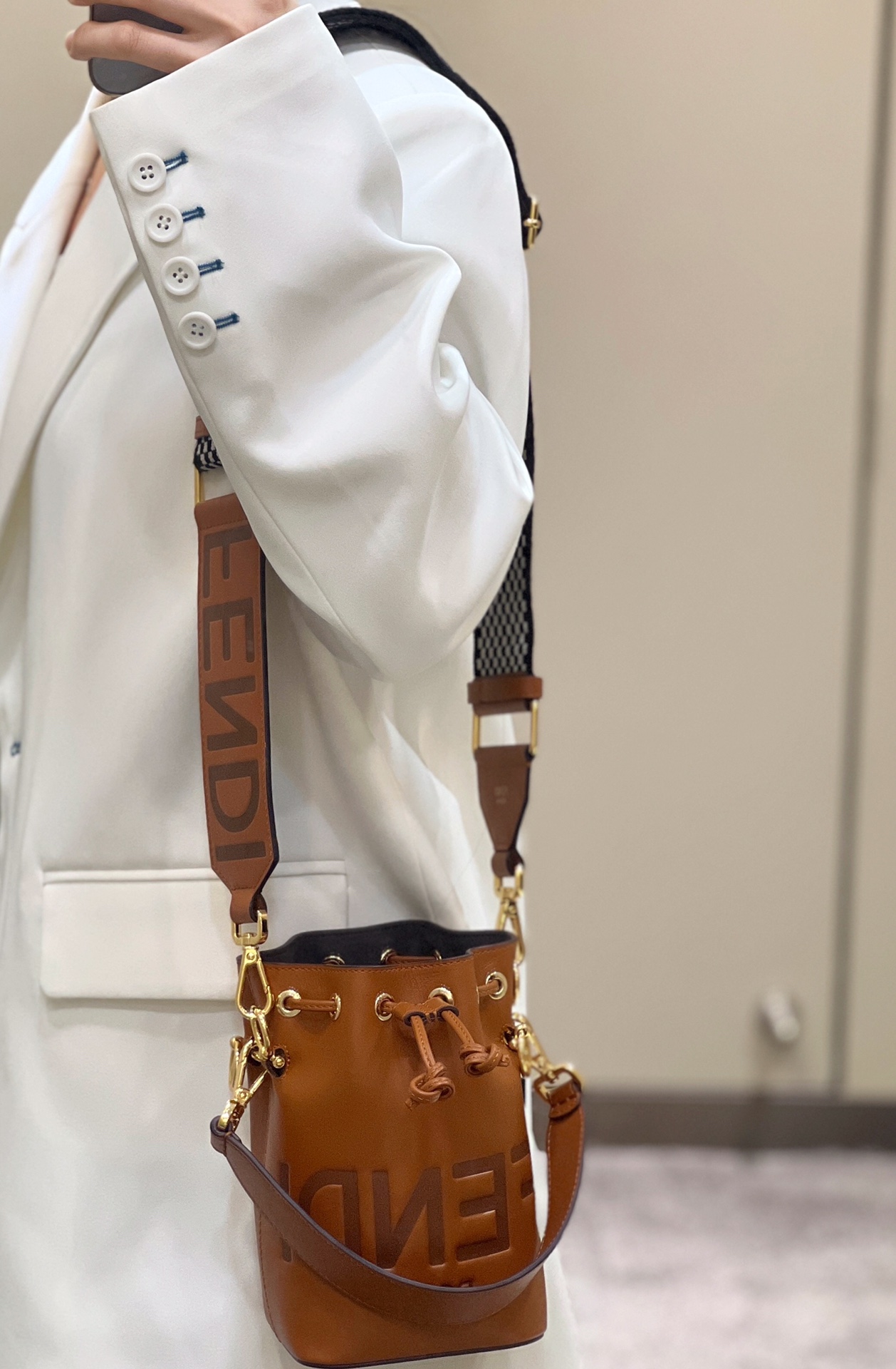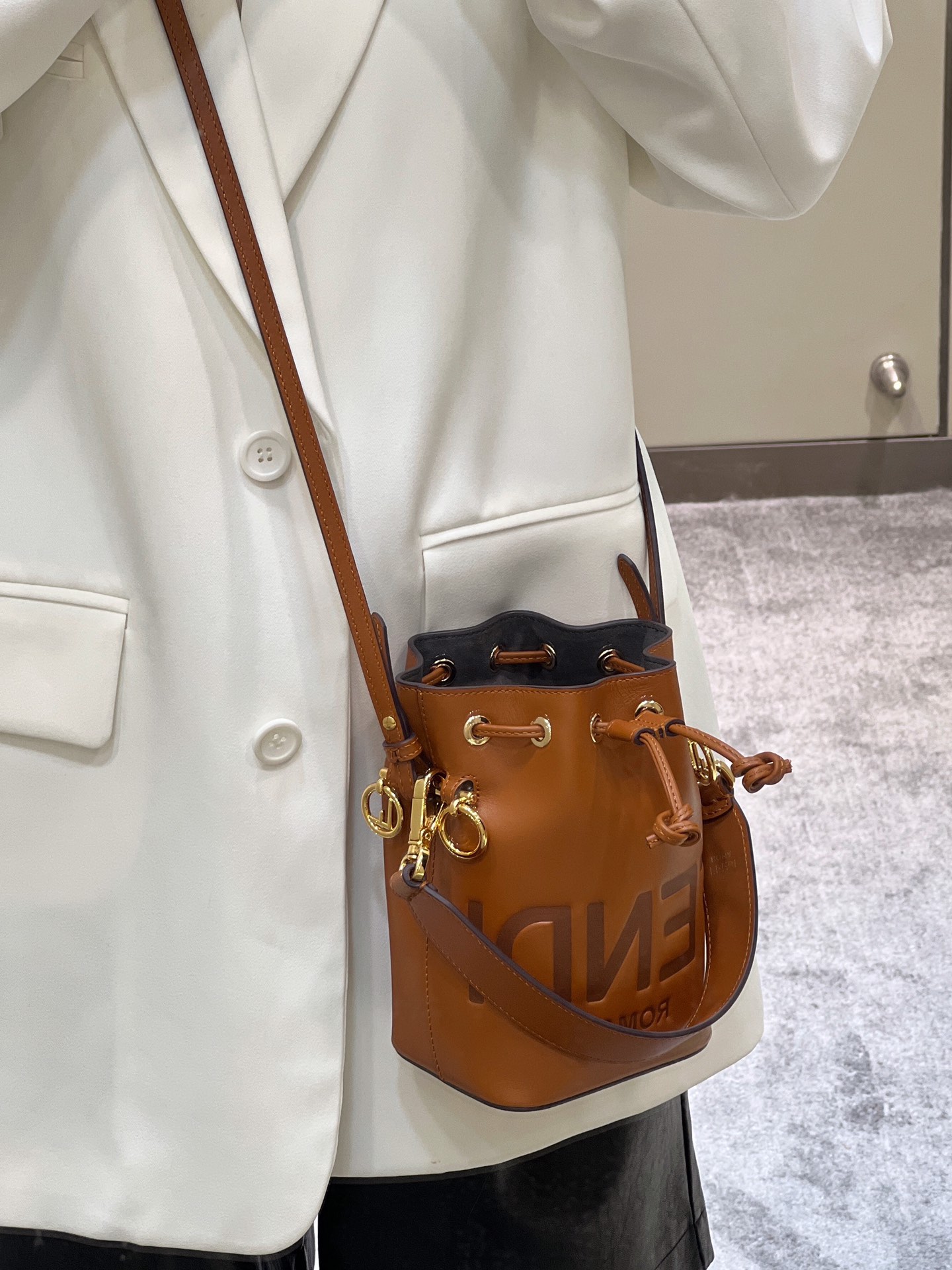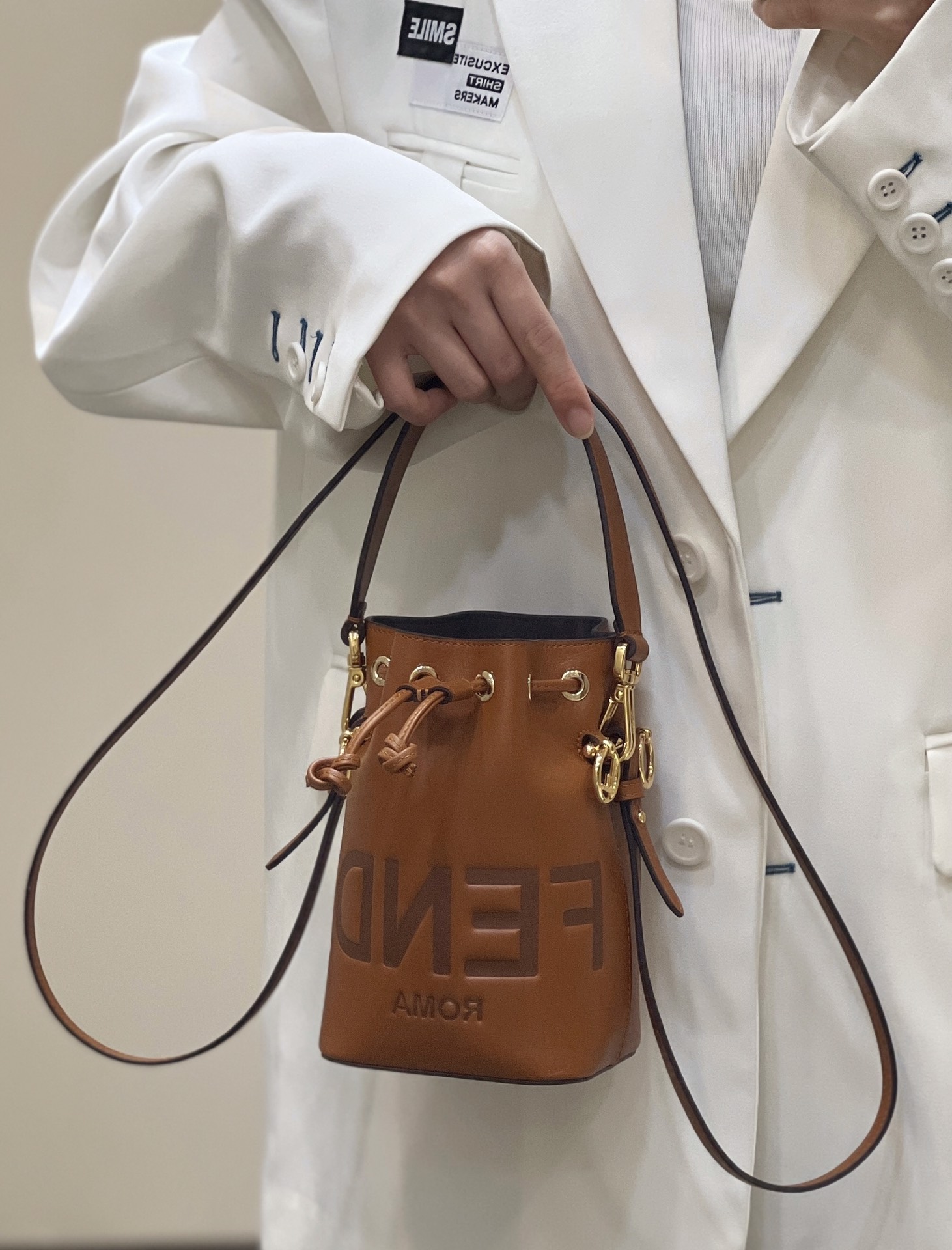 FENDI Mon Tresor Mini Bucket Bag, made of Italian calf leather, features the iconic "FENDI ROMA" letter pattern embossed on it. It has a drawstring closure design and comes with both a long and a short shoulder strap. Despite its compact size, it has ample storage capacity.
