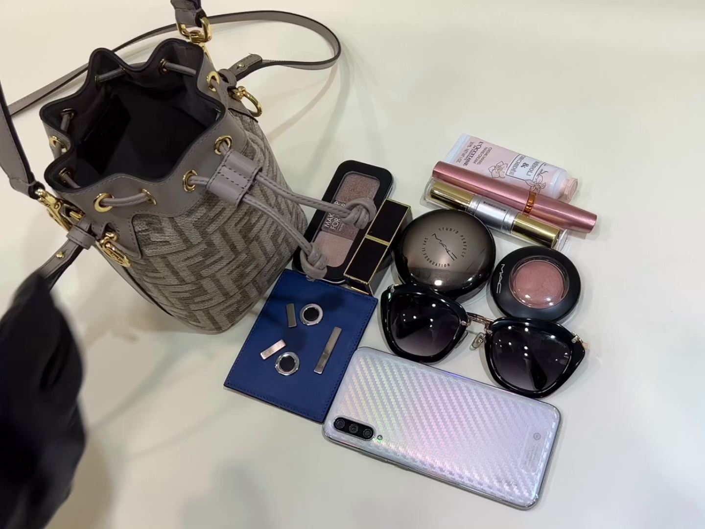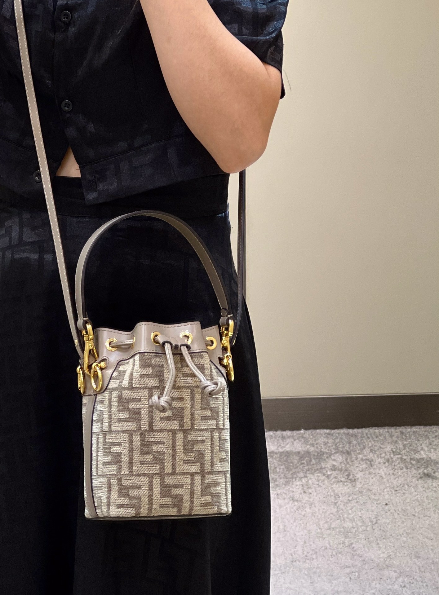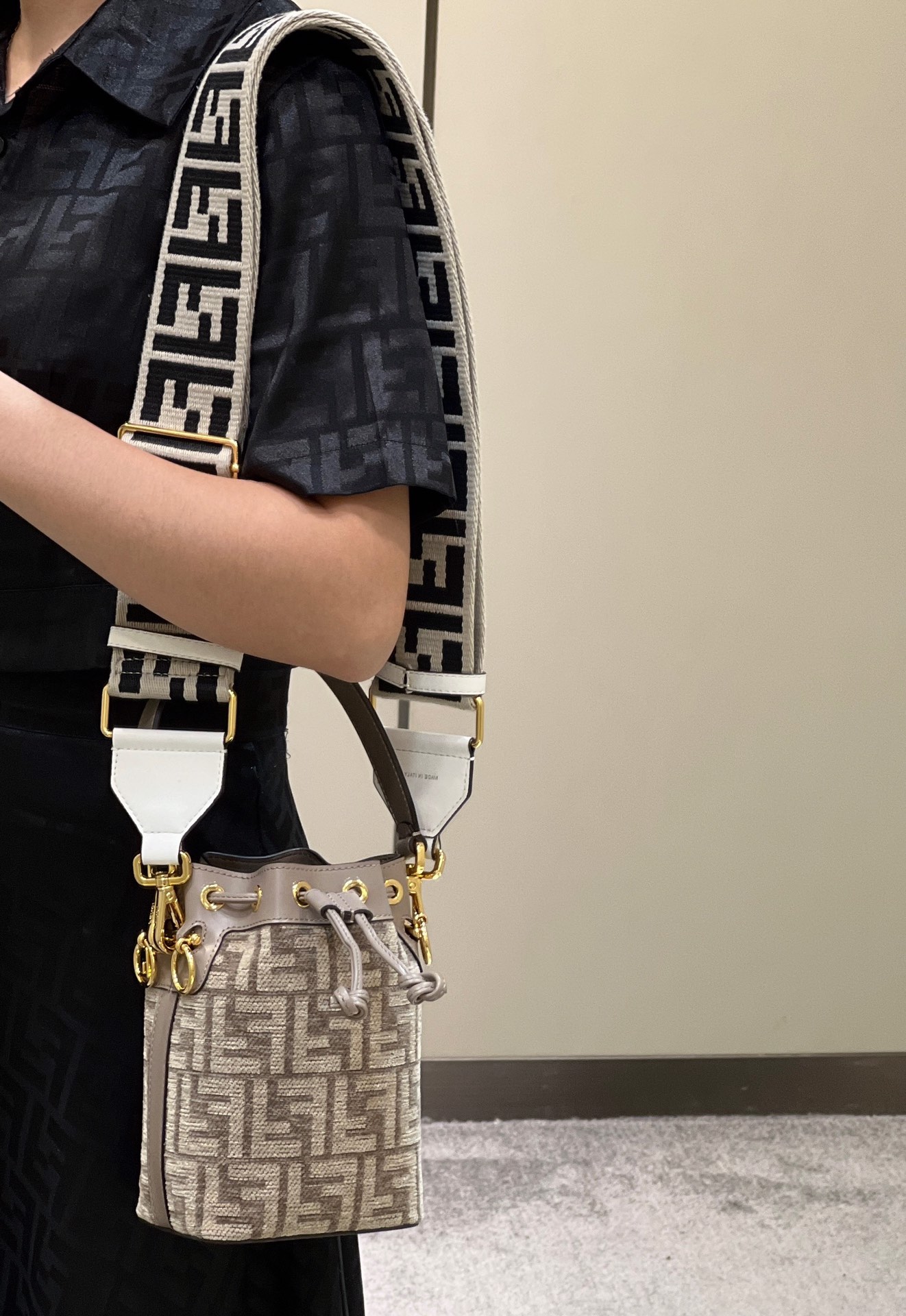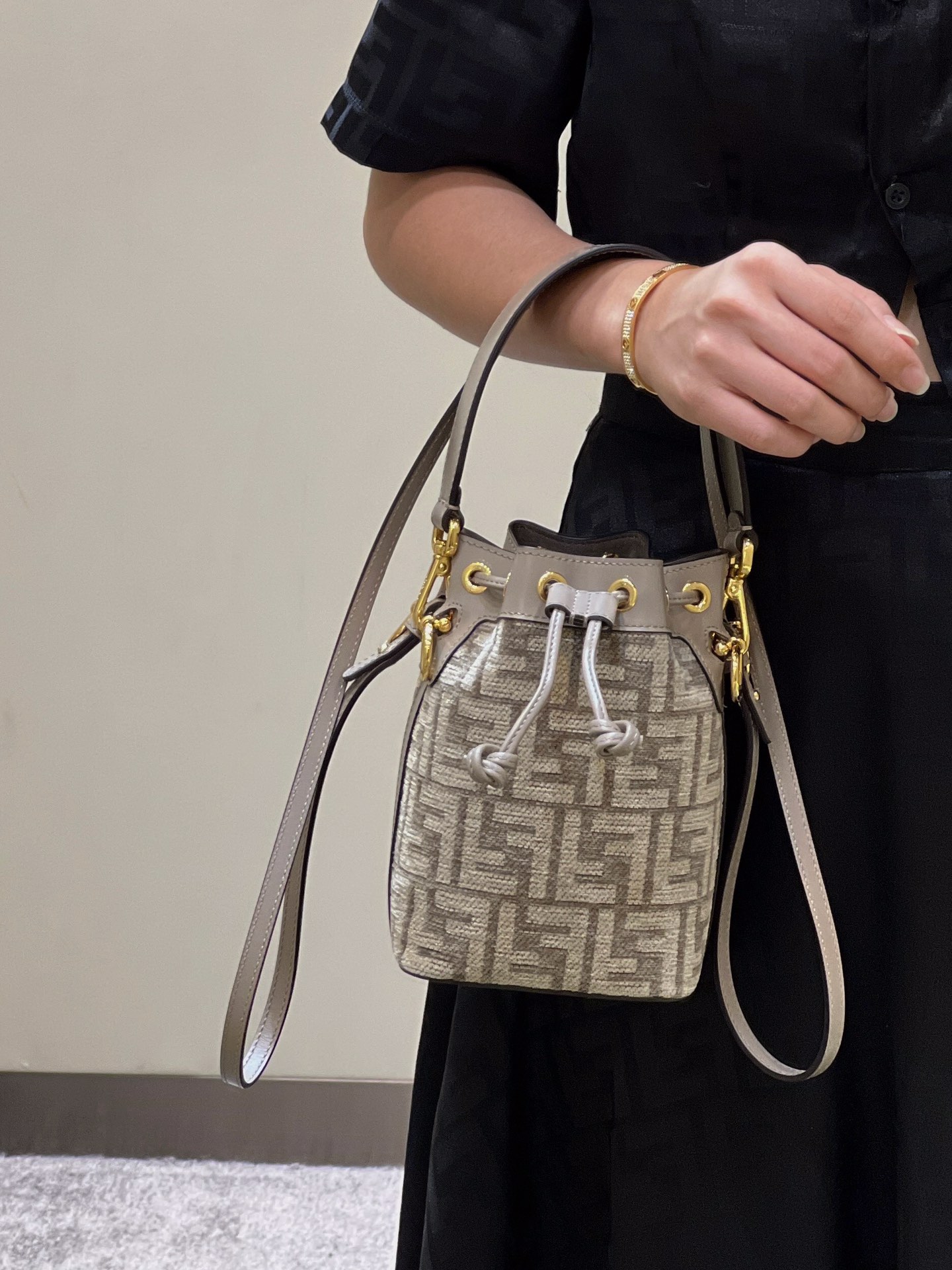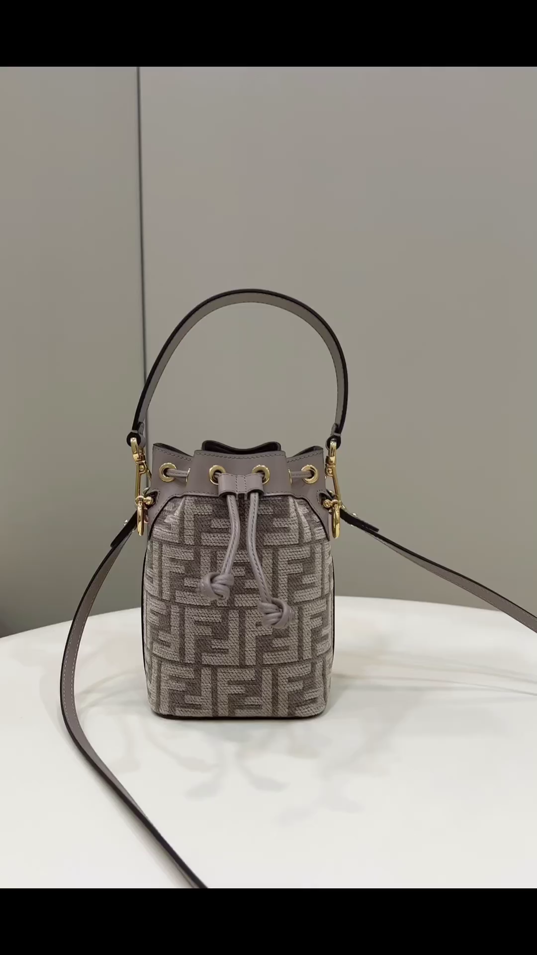 The same style MON TRÉSOR bucket bag with the iconic FF logo in dove grey, can be worn as a shoulder bag or carried by hand, making it incredibly practical.