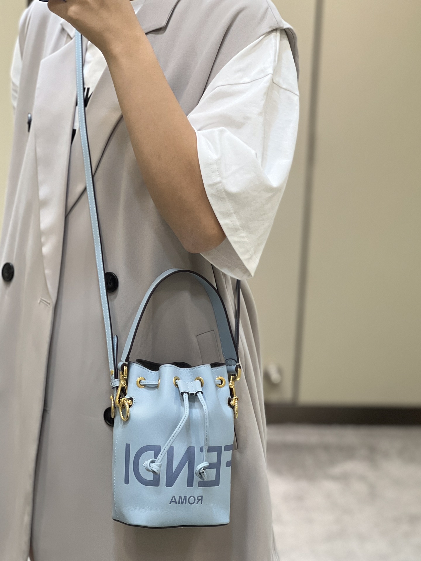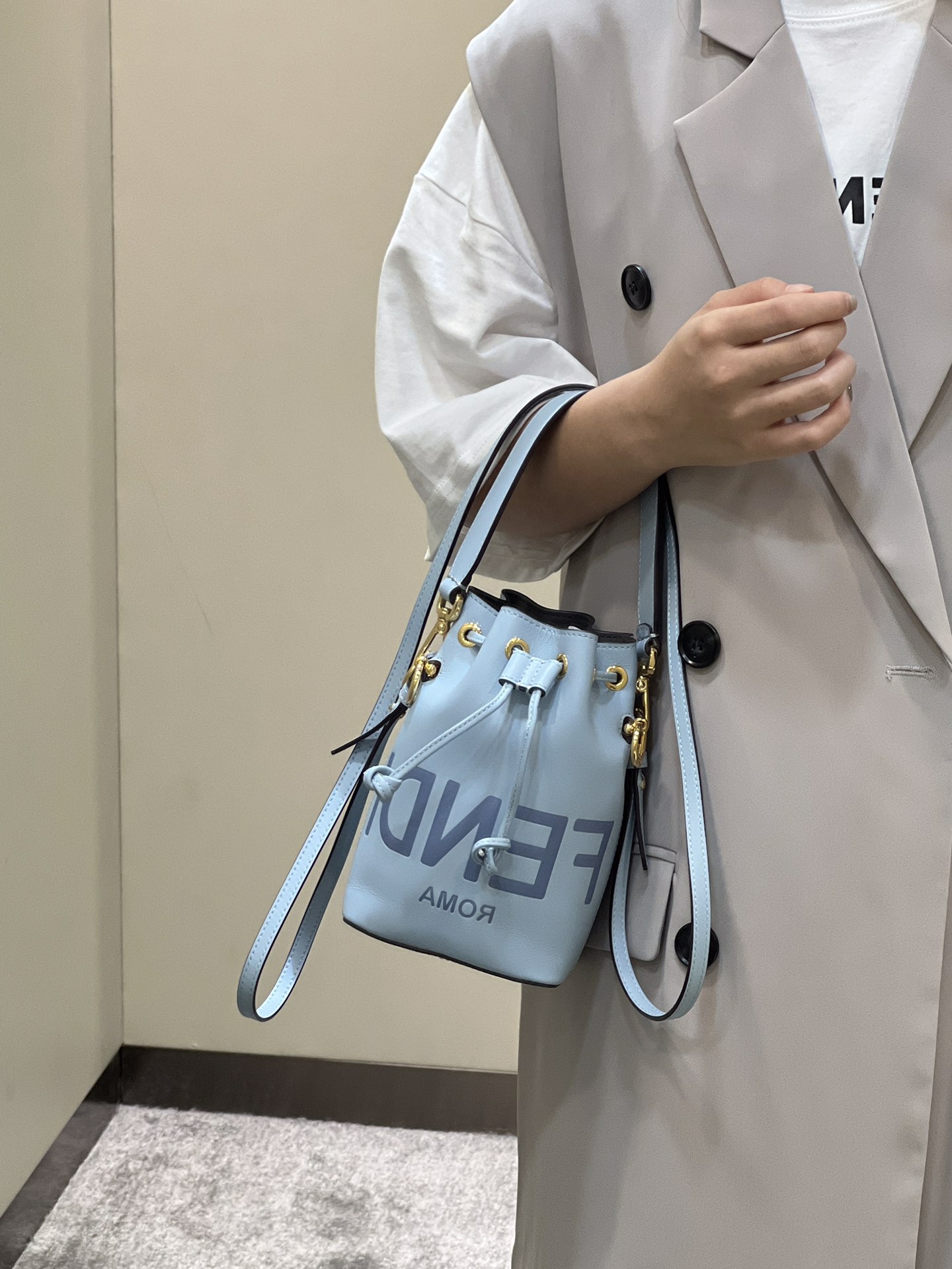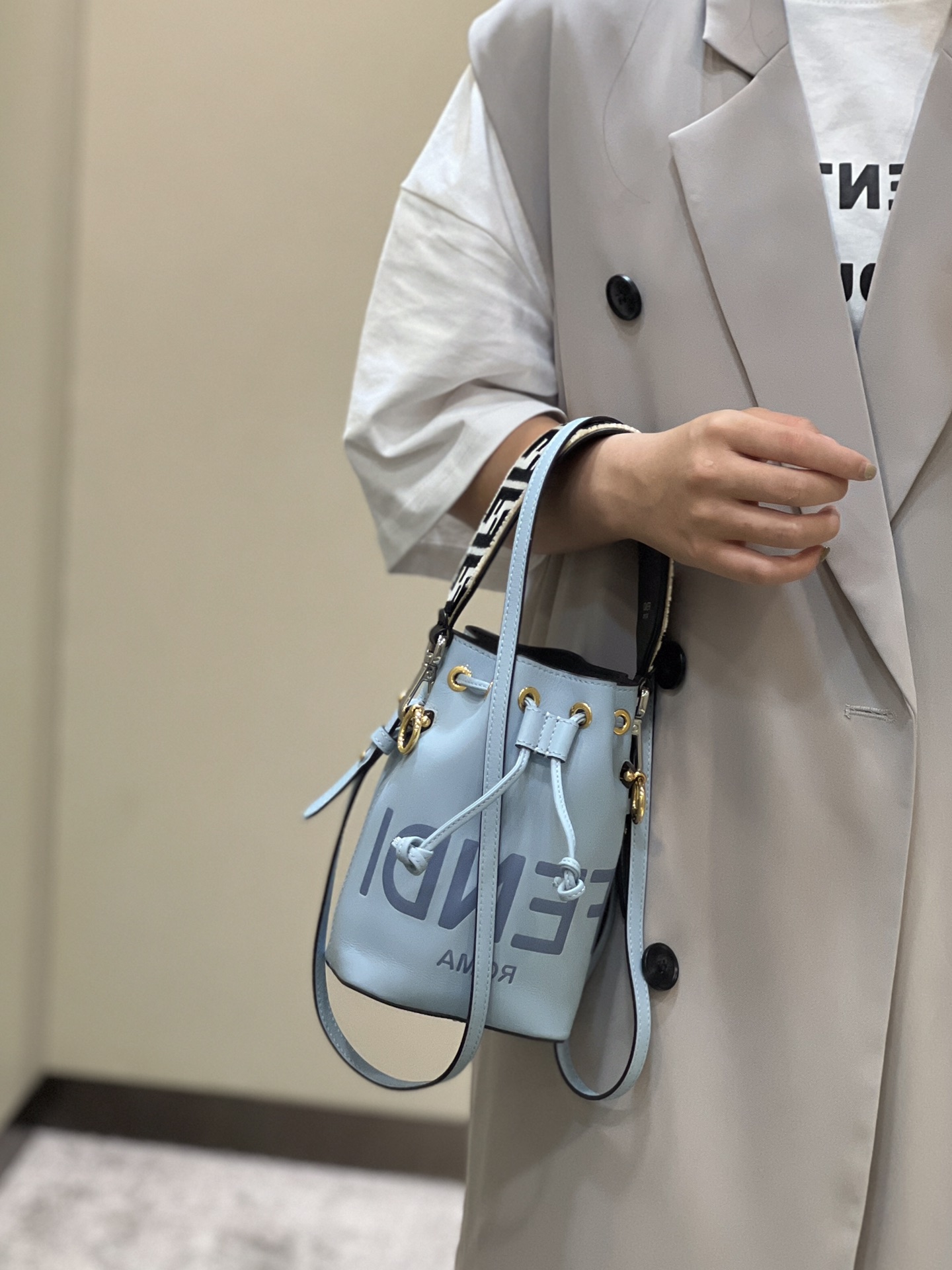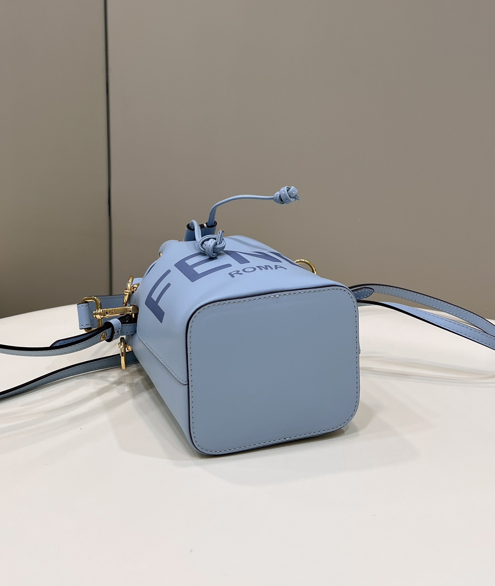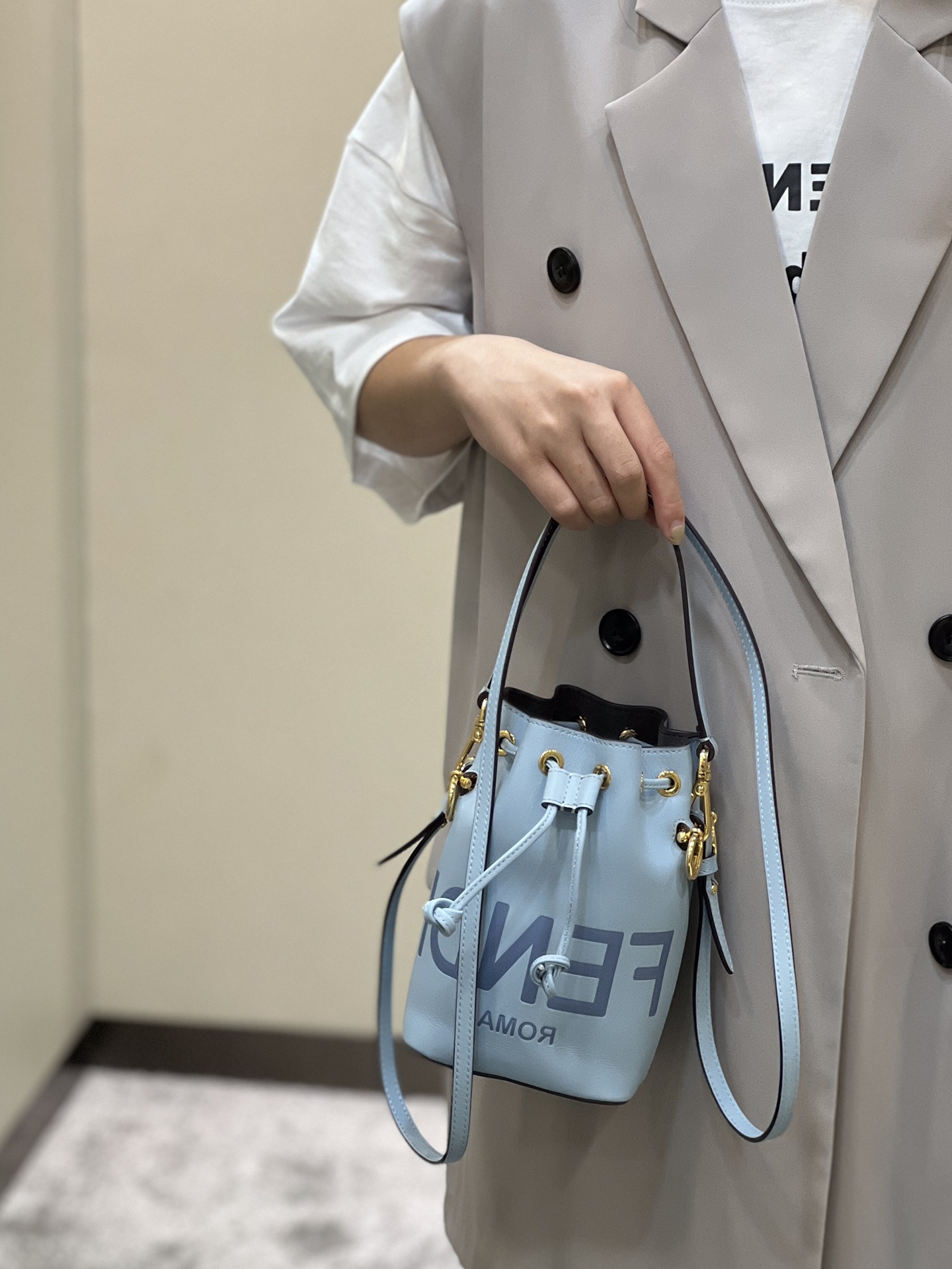 FENDI Mon Tresor Mini Bucket Bag, made of Italian calf leather, features the iconic "FENDI ROMA" letter pattern embossed on it. It has a drawstring closure design and comes with both a long and a short shoulder strap. Despite its compact size, it has ample storage capacity.