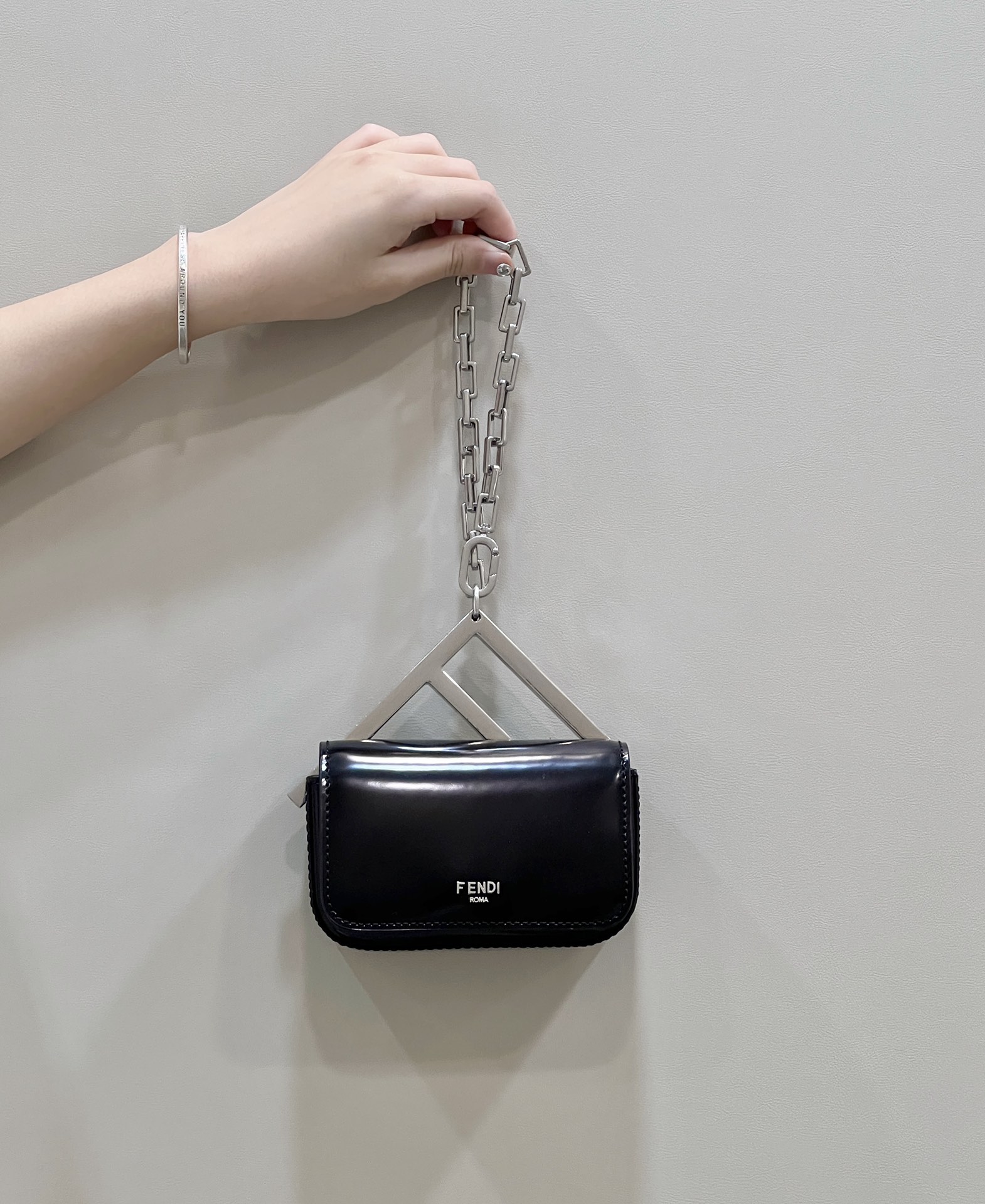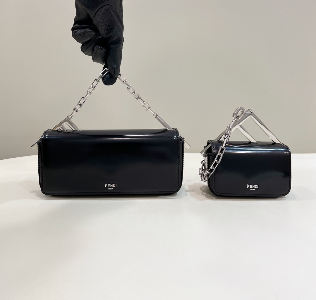 FENDI Nano Bag F handbag is made entirely of leather, adorned with large F pattern metal embellishments and chains, featuring matching toned leather lining, with interior pockets for convenience. It is complemented with vintage silver metal hardware, short chain handle for hand carry or clutch style, making it versatile and timeless.