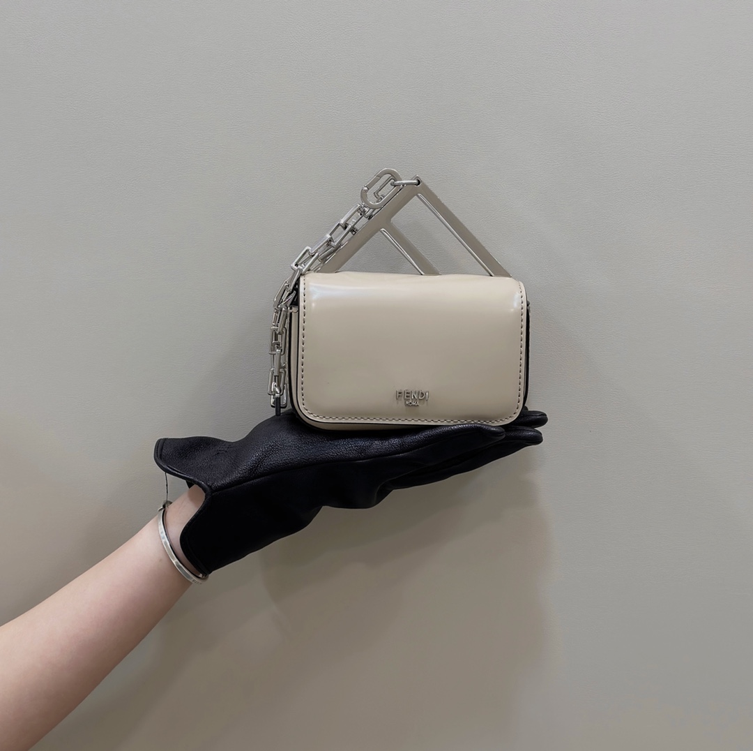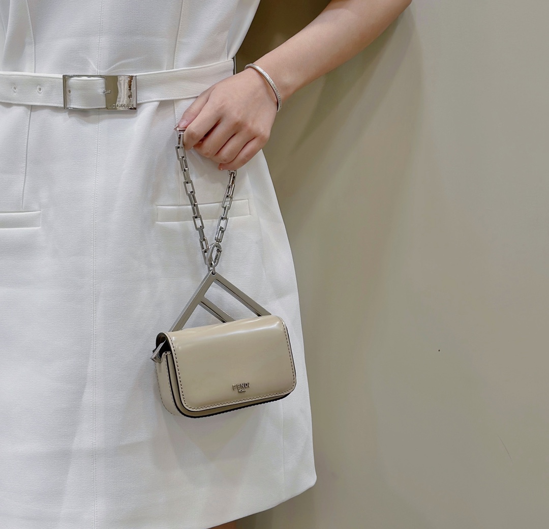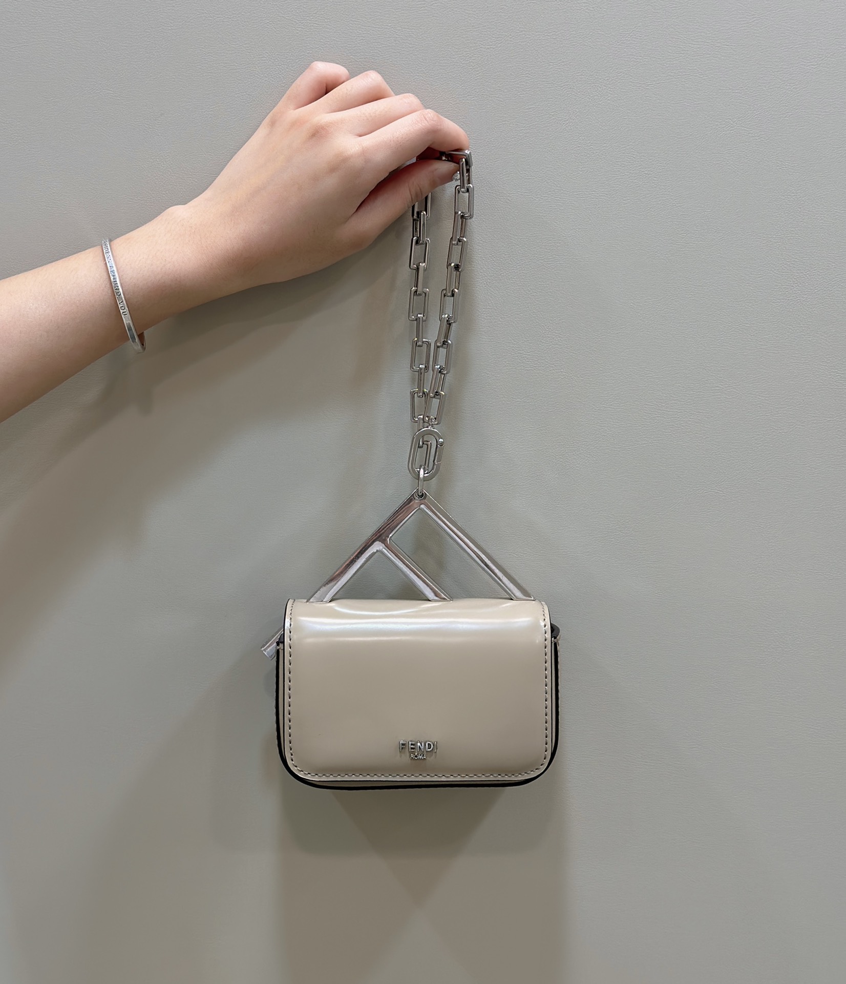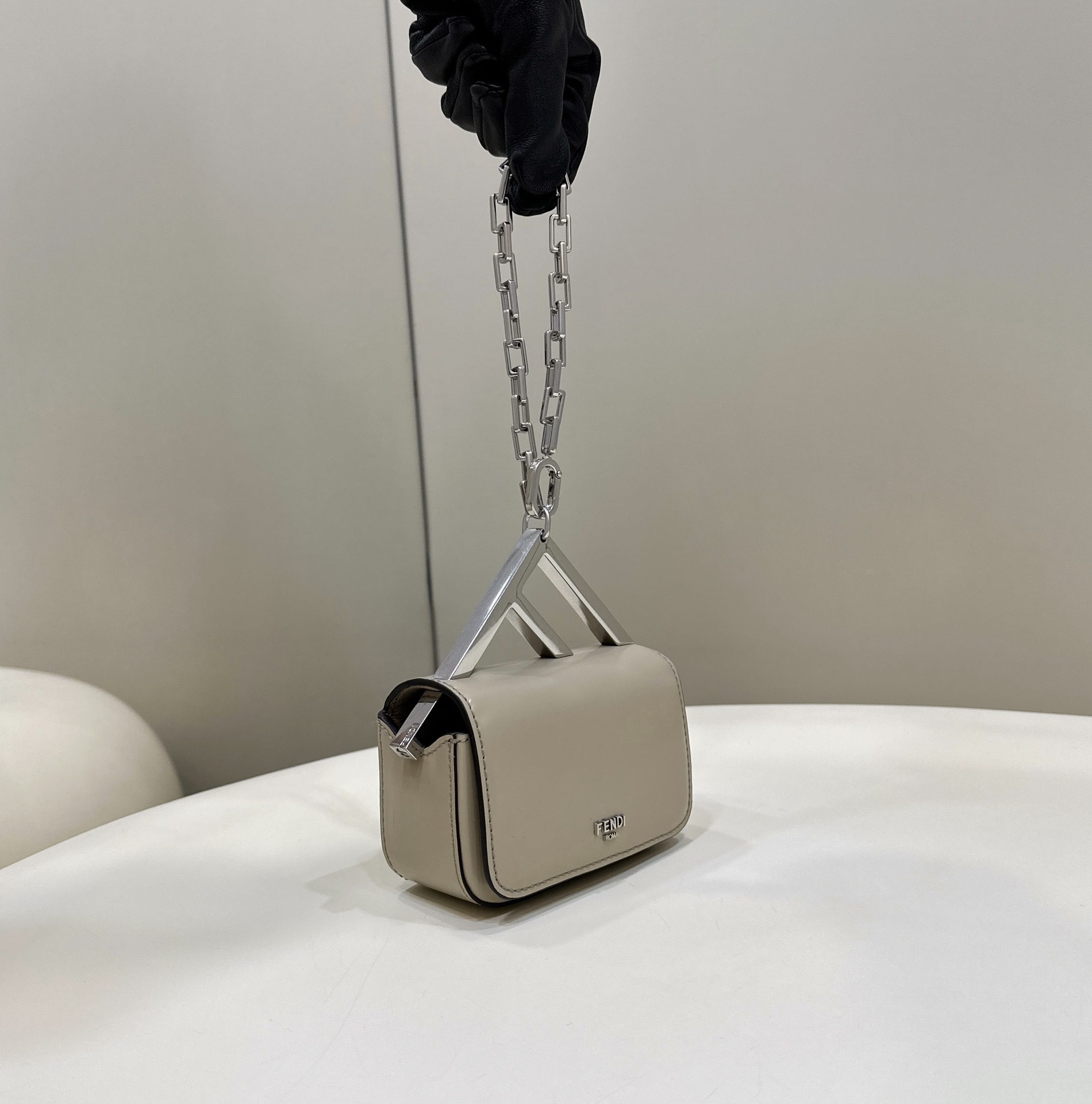 FENDI Nano Bag F handbag is made entirely of leather, adorned with large F pattern metal embellishments and chains, featuring matching toned leather lining, with interior pockets for convenience. It is complemented with vintage silver metal hardware, short chain handle for hand carry or clutch style, making it versatile and timeless.