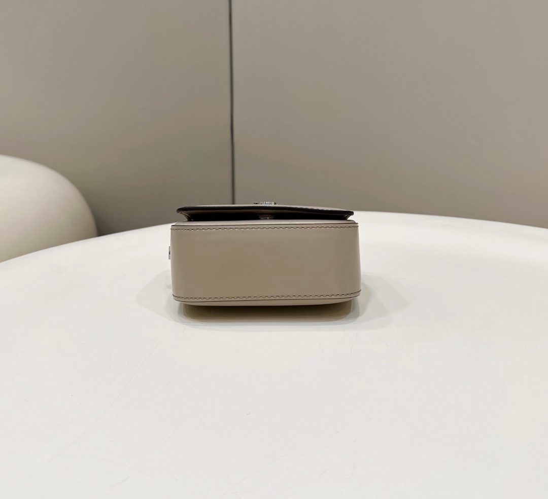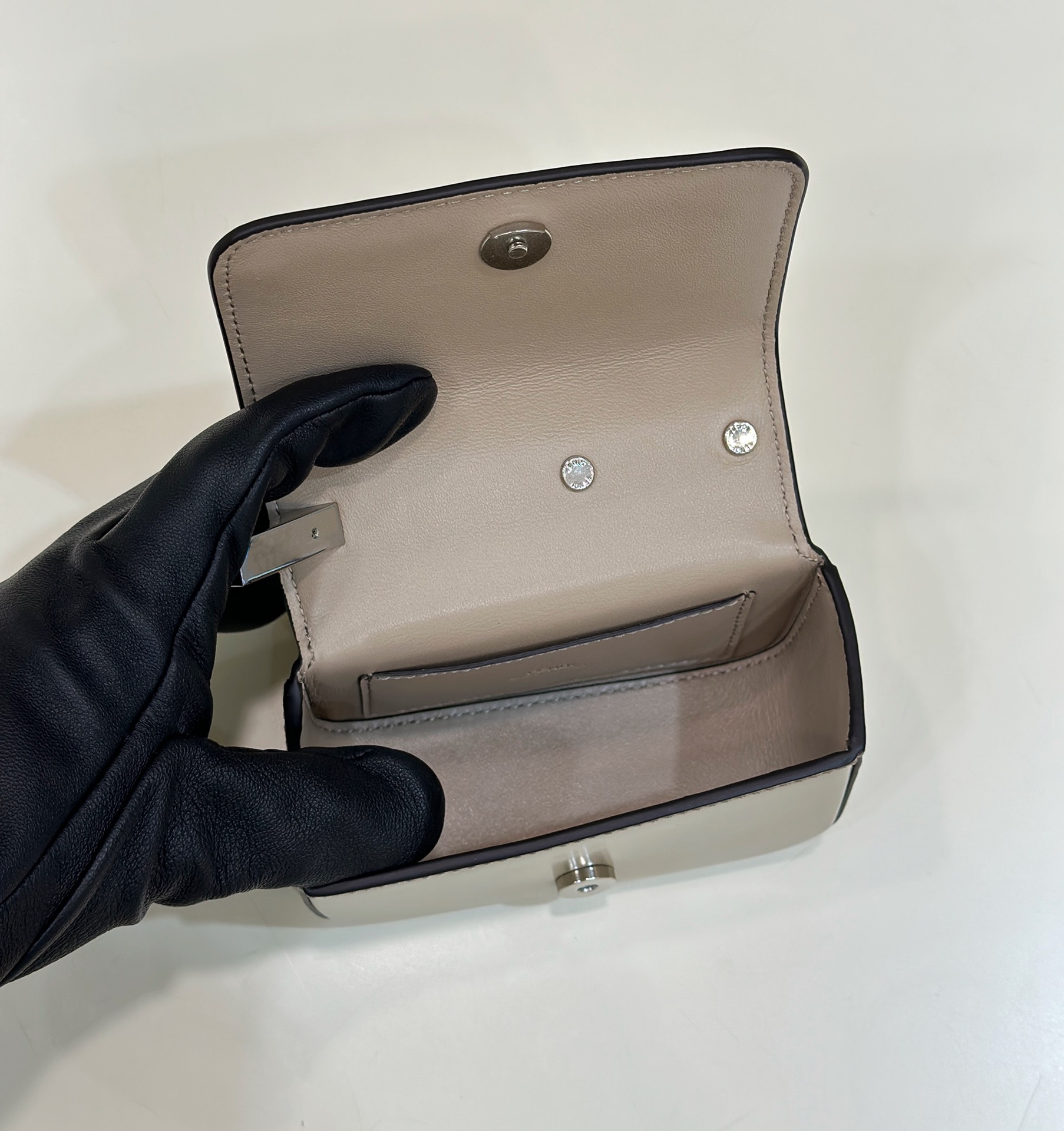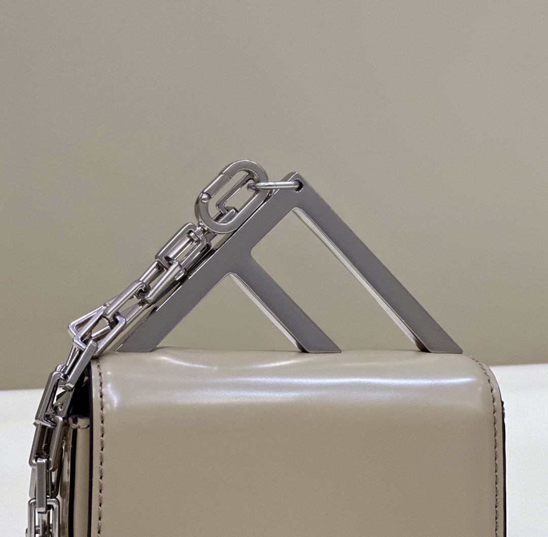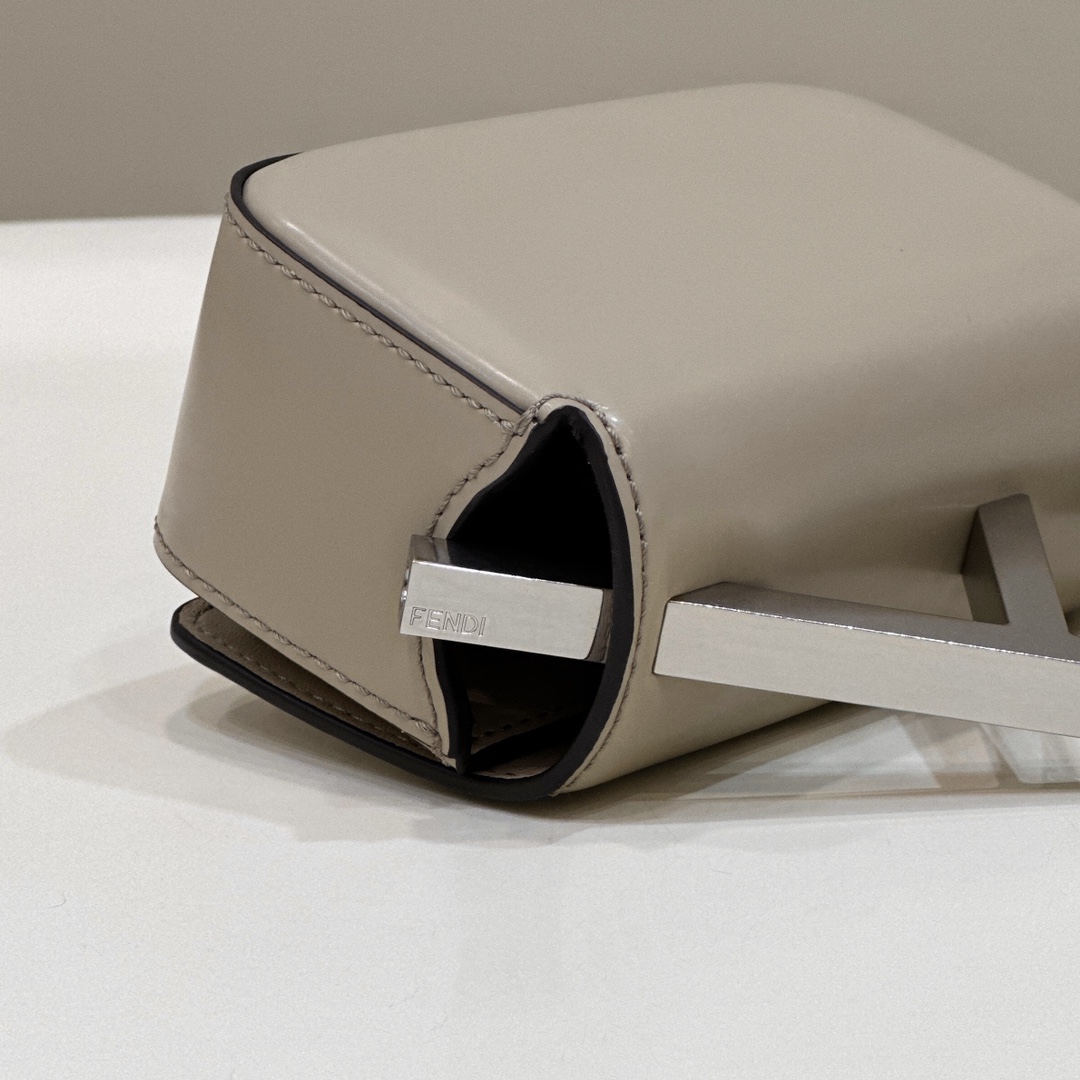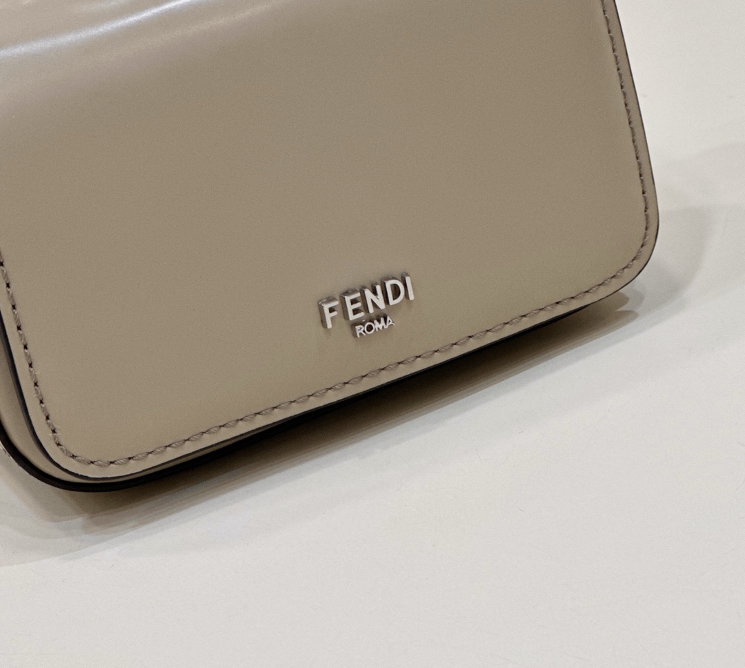 FENDI Nano Bag F handbag is made entirely of leather, adorned with large F pattern metal embellishments and chains, featuring matching toned leather lining, with interior pockets for convenience. It is complemented with vintage silver metal hardware, short chain handle for hand carry or clutch style, making it versatile and timeless.