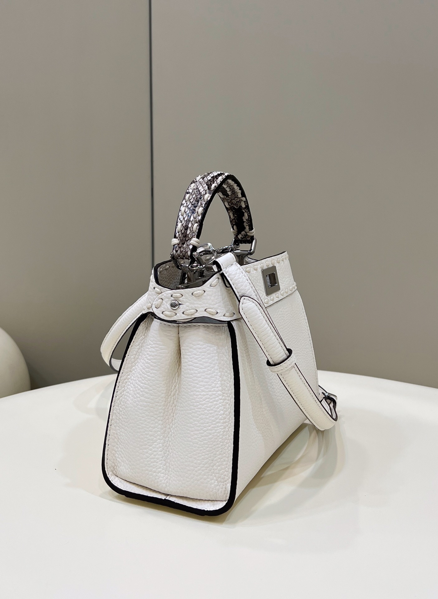 A super suitable commuter bag, Peekaboo, with hand-stitched exterior seams, made of genuine leather and snake skin wrist strap for a unique touch. It exudes an elegant and timeless sense of style when worn, showcasing a refined sense of sophistication.
