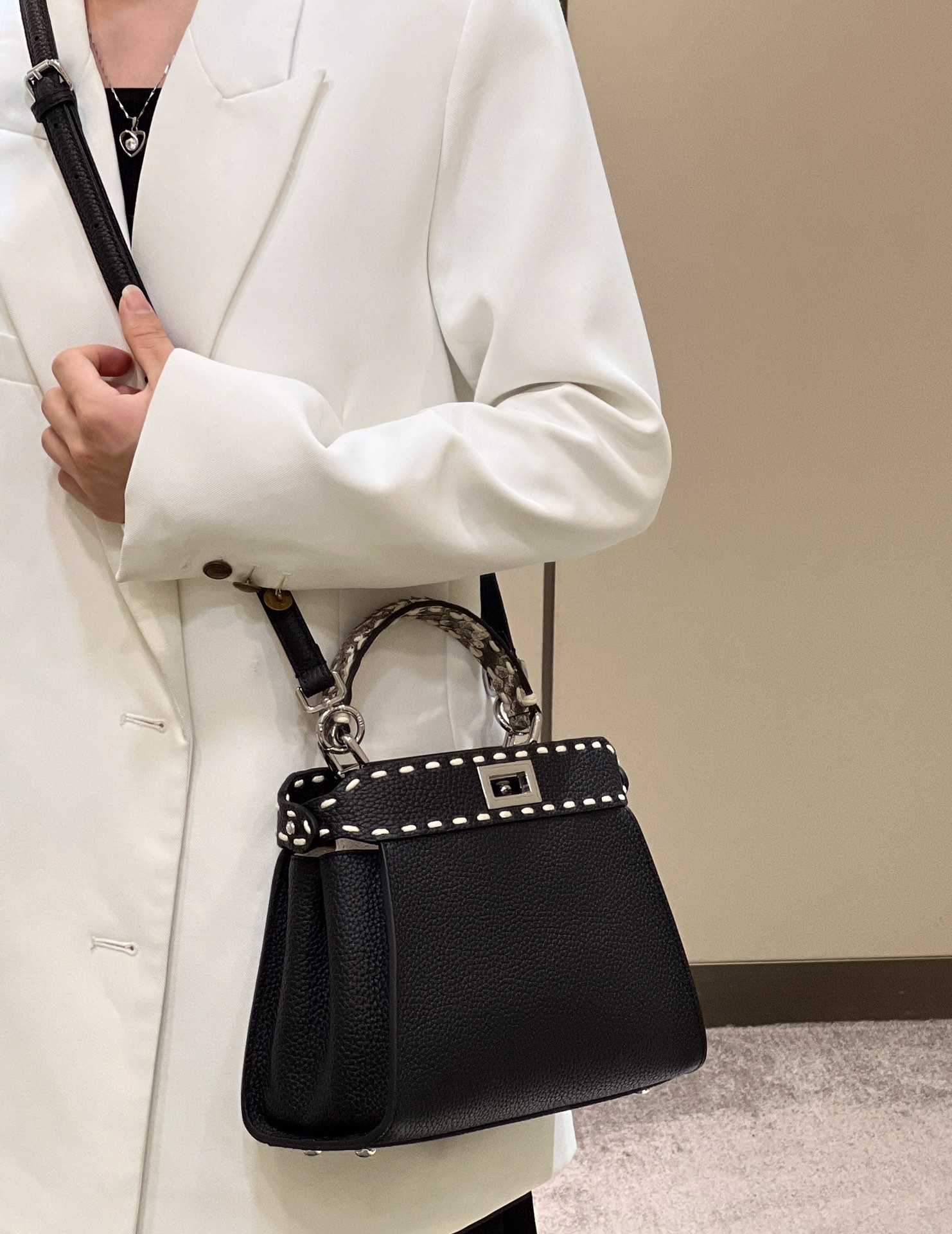 A super suitable commuter bag, Peekaboo, with hand-stitched exterior seams, made of genuine leather and snake skin wrist strap for a unique touch. It exudes an elegant and timeless sense of style when worn, showcasing a refined sense of sophistication.