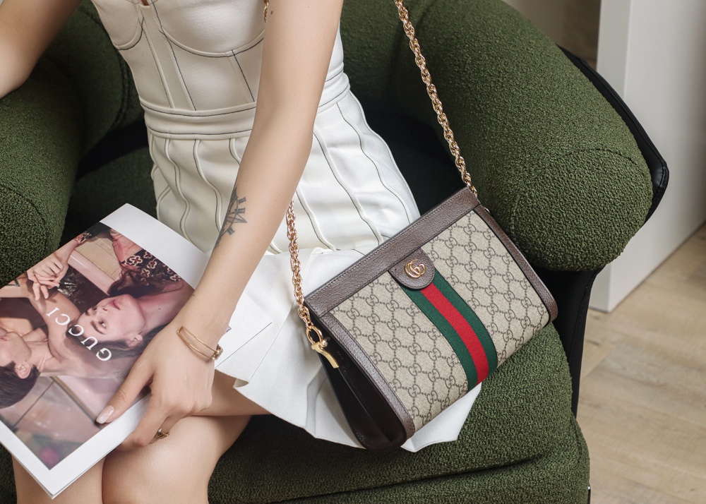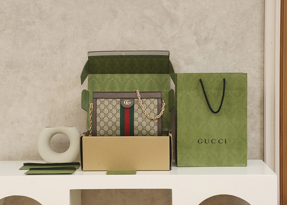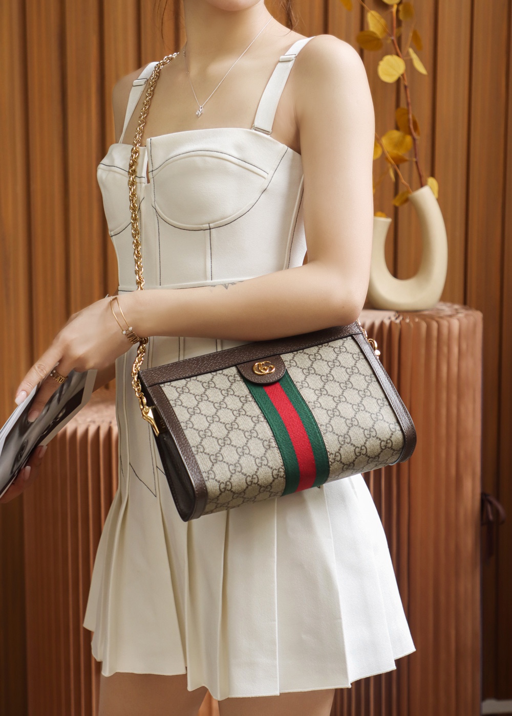 • Gucci GG Supreme Monogram Web Small Ophidia Chain Shoulder Bag Brown