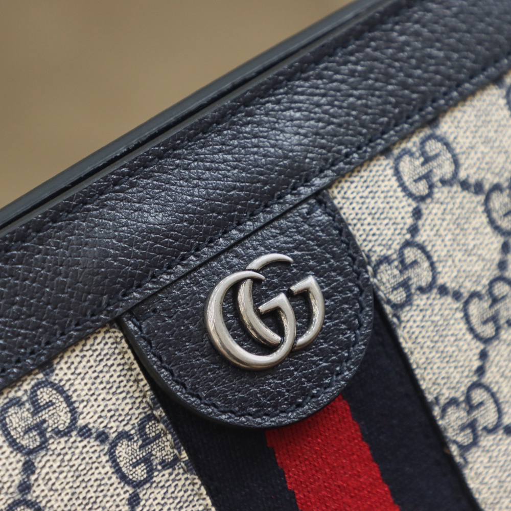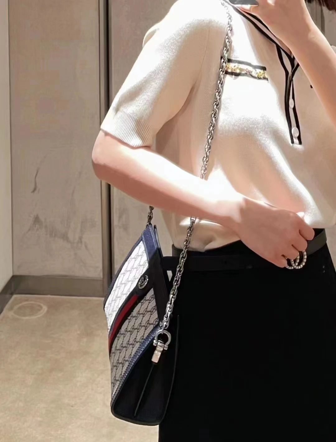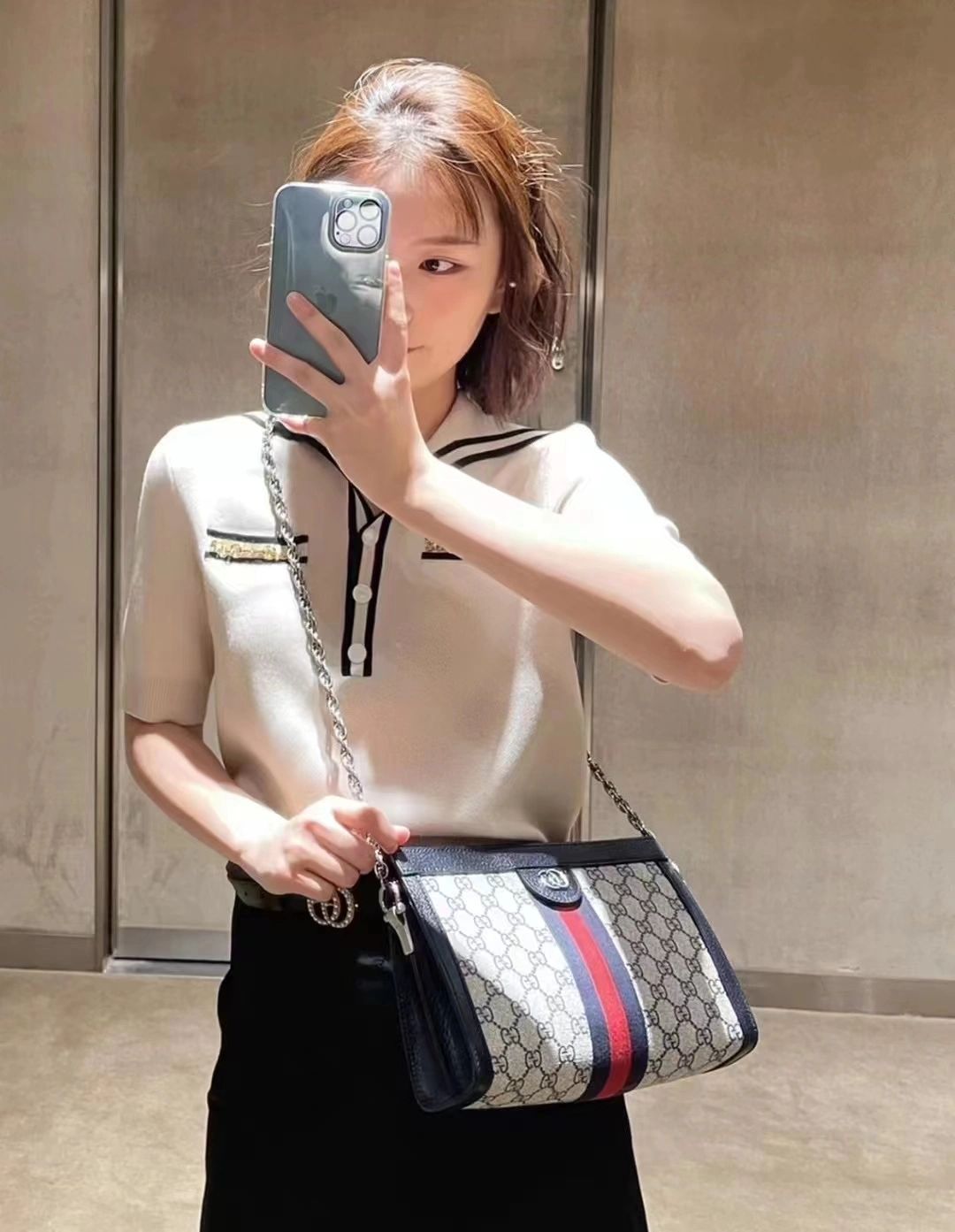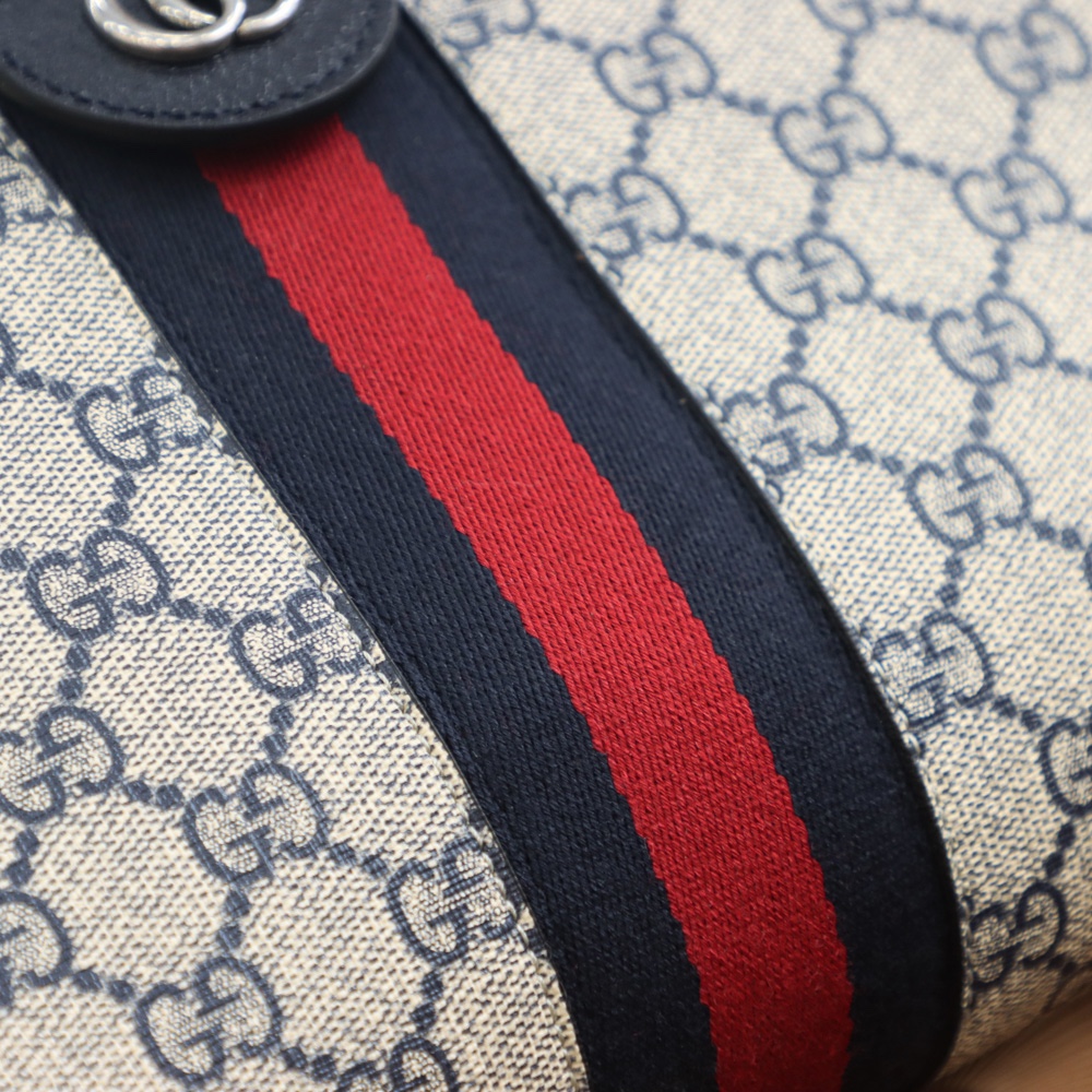 • Gucci GG Supreme Monogram Web Small Ophidia GG Chain Shoulder Bag Brown navy blue and off white