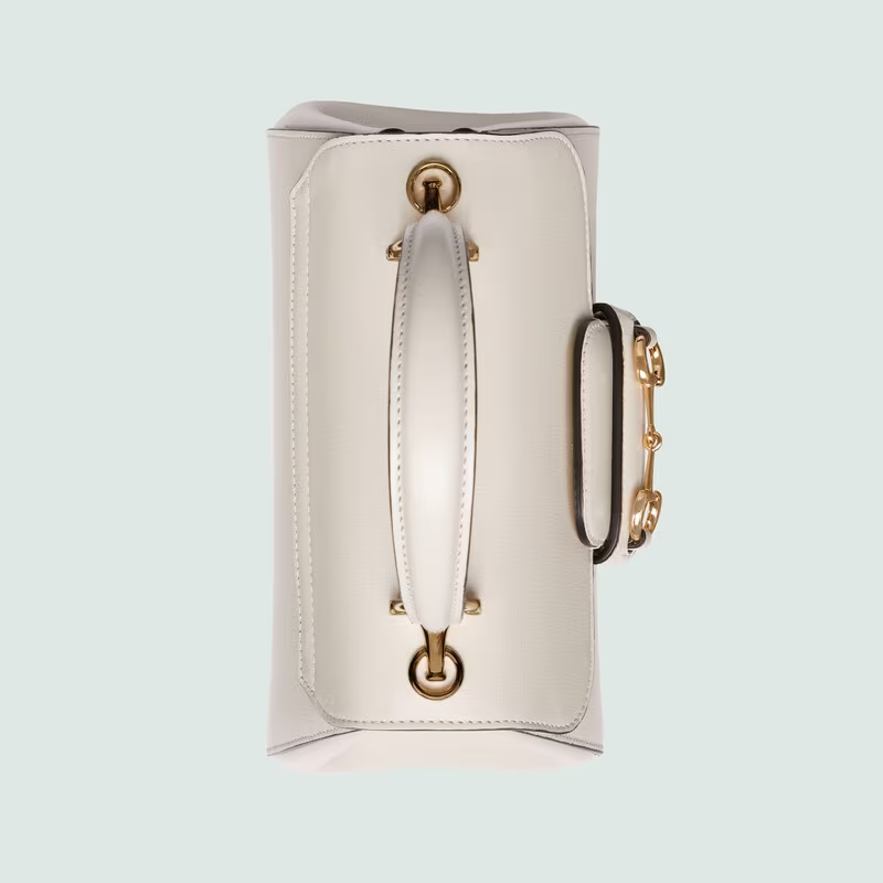 The Gucci Horsebit 1955 is presented as a top handle bag in white leather. The collection unifies details first introduced on the original bag that inspired the line from over six decades ago with a modern spirit, highlighting the Horsebit. Part of Gucci’s genetic code, the double ring and bar design has been established as one of the most distinctive elements among the House symbols borrowed from the equestrian world.
