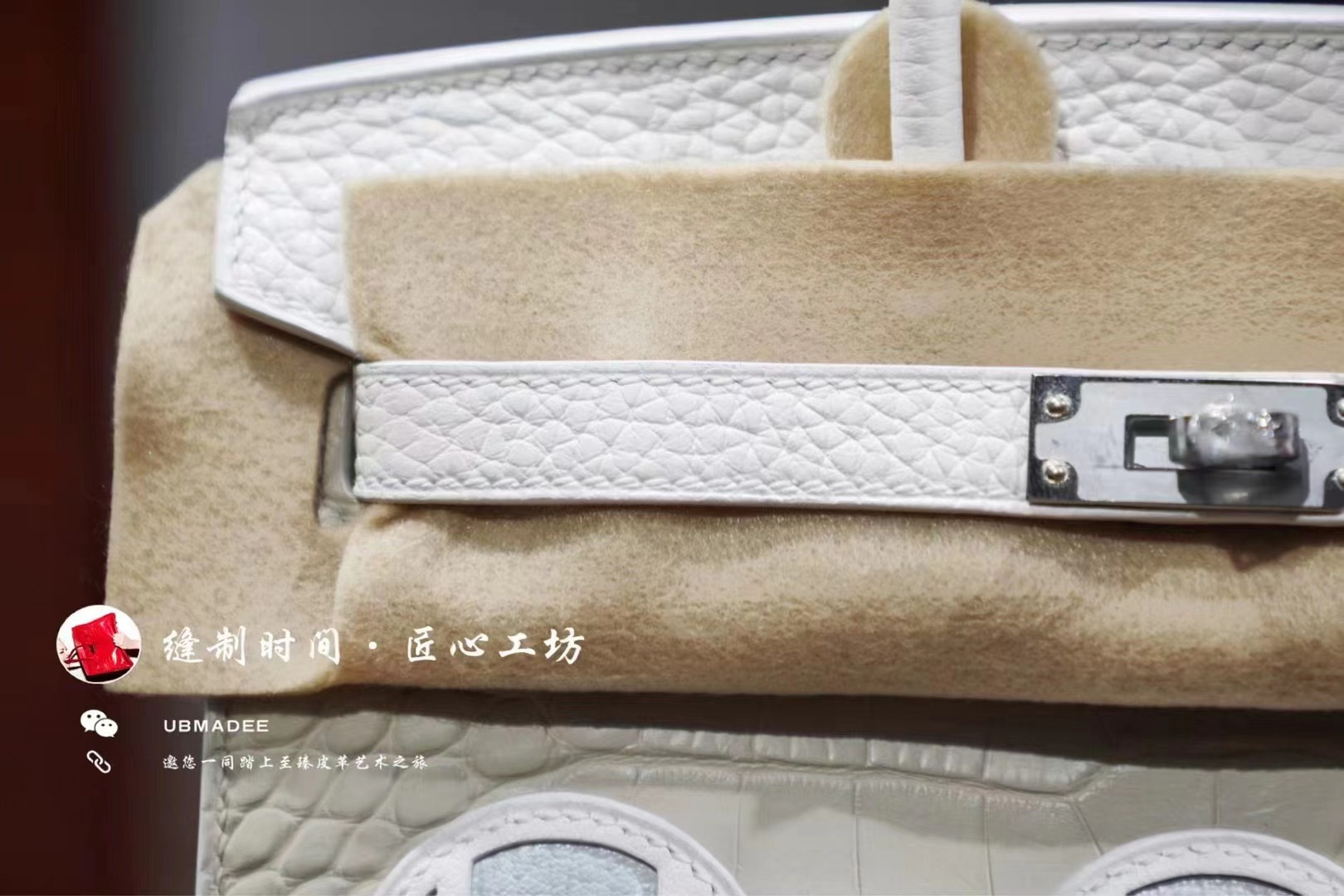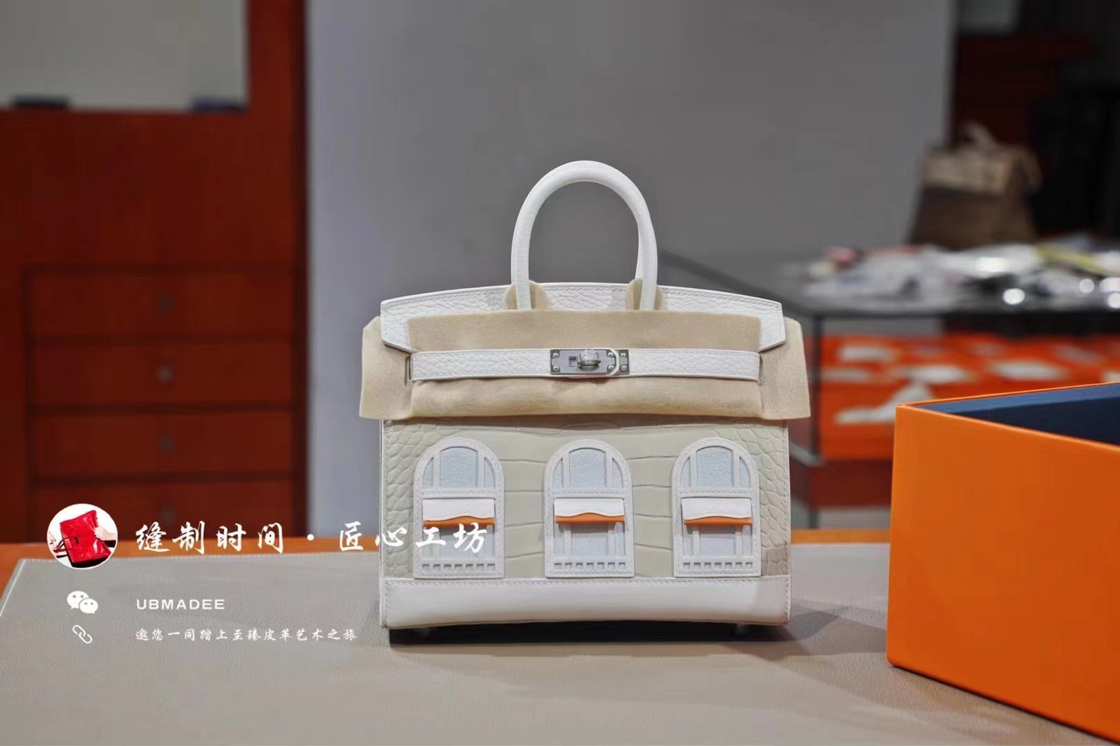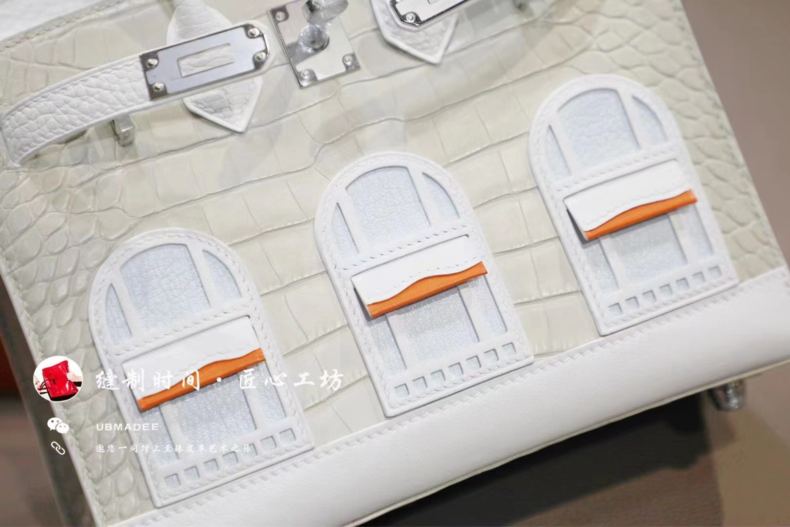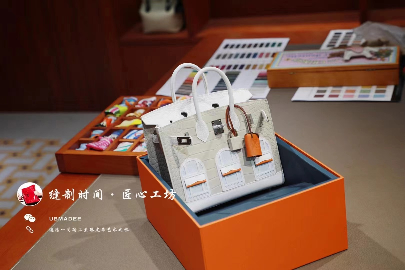 • Hermes Birkin 20 Sellier Neige (Snow) White Faubourg House Alligator 8L Beton+blanc+T0 Bleu Brume Bag