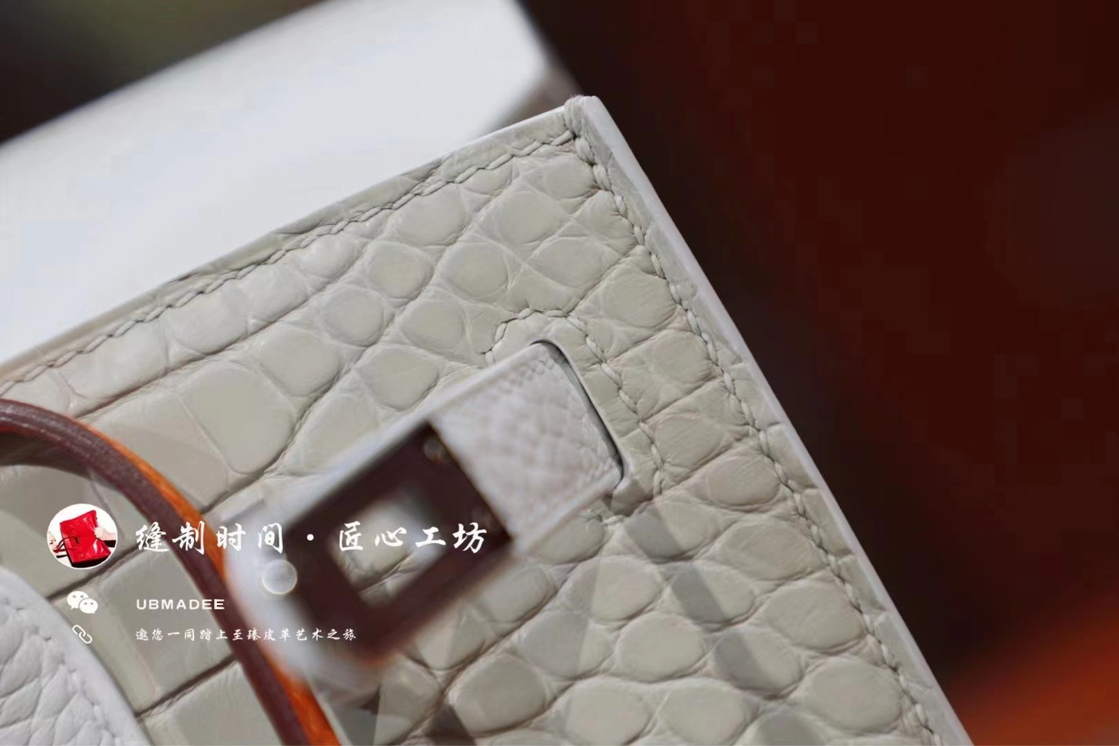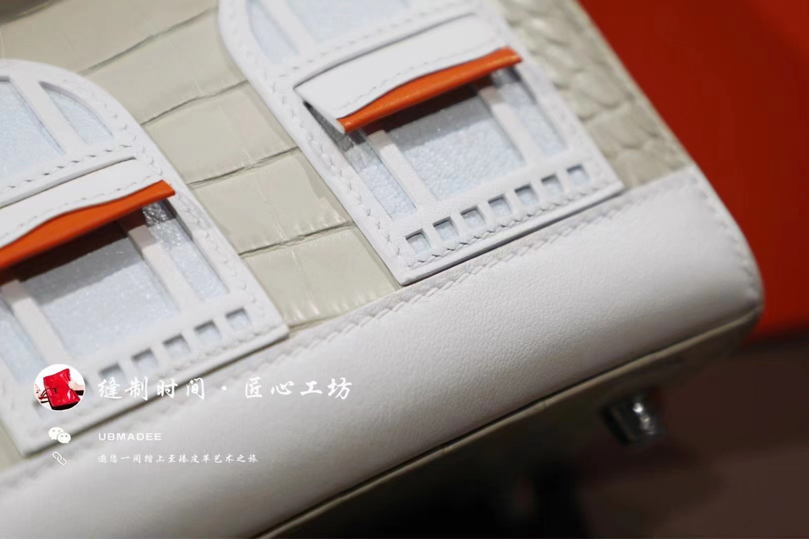 Hermes Birkin 20 Sellier Neige (Snow) White Faubourg House Alligator 8L Beton+blanc+T0 Bleu Brume Bag