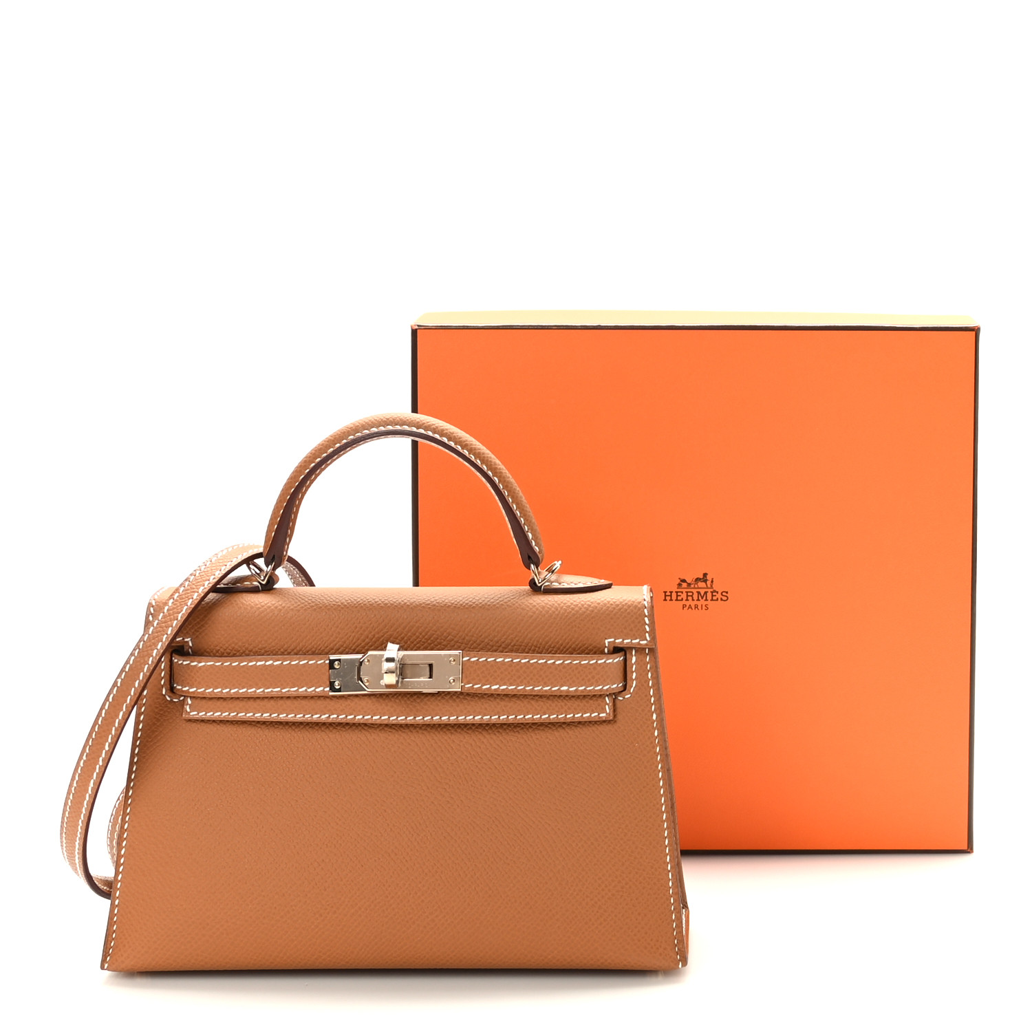 This is an authentic Epsom Horseshoe Mini Kelly Sellier 20 Gold Nata. This handbag is beautifully crafted in stamped epsom calfskin leather in golden brown leather. A single rolled leather top handle is secured with permabrass gold hardware and an optional leather shoulder strap. The traditional Kelly turn lock secures the small flap, which opens to a chevre goatskin leather with a flat pocket.