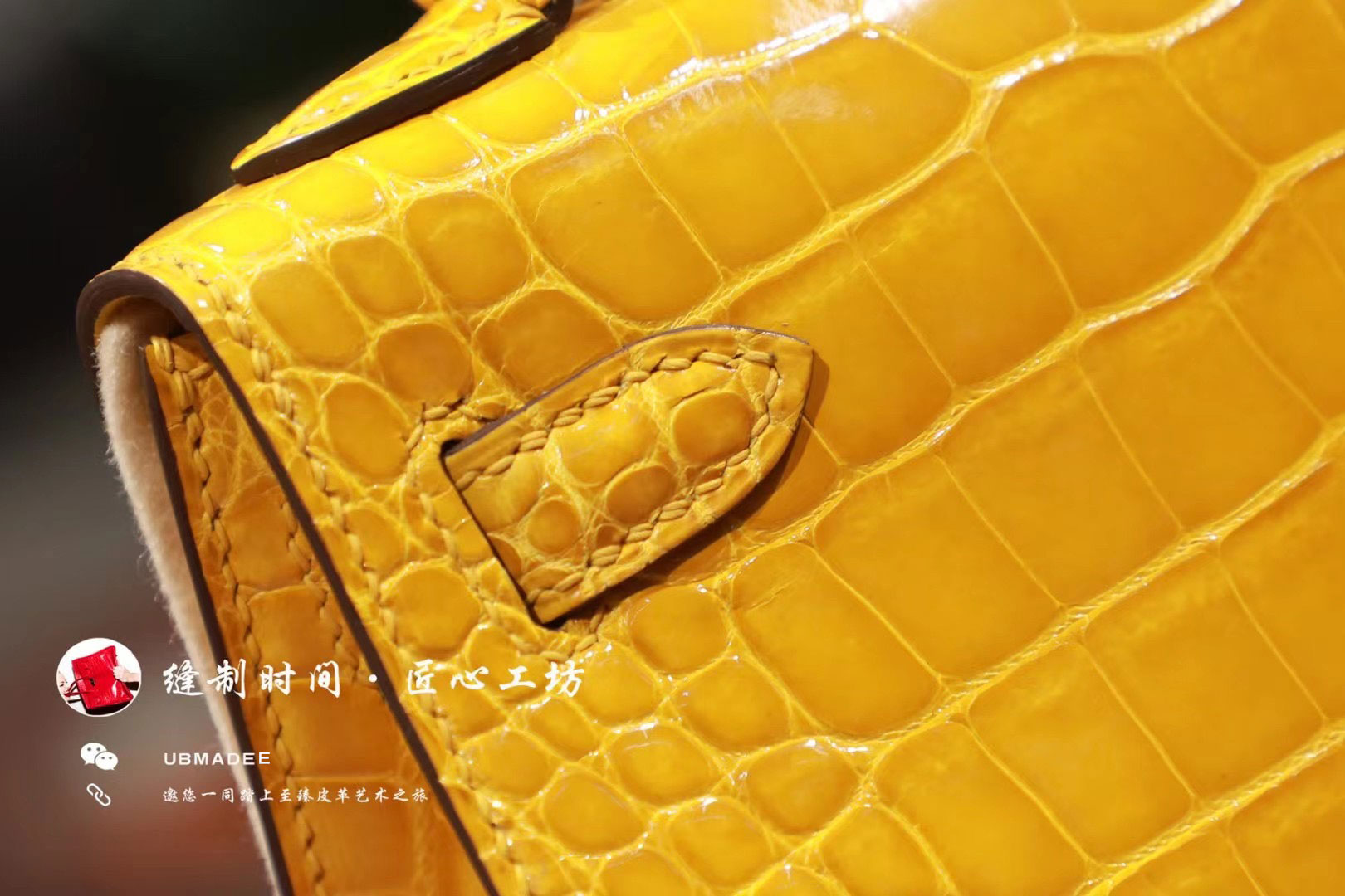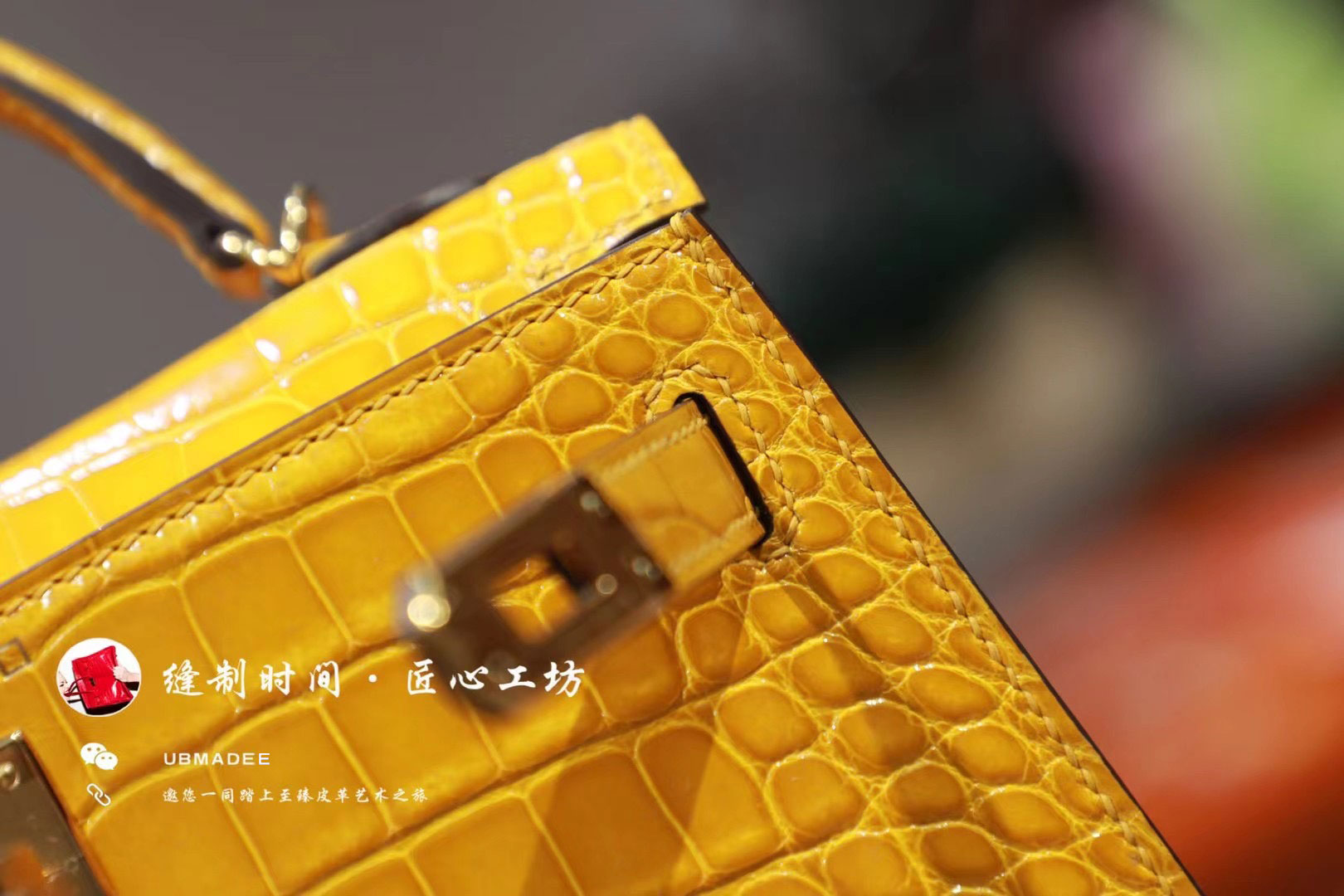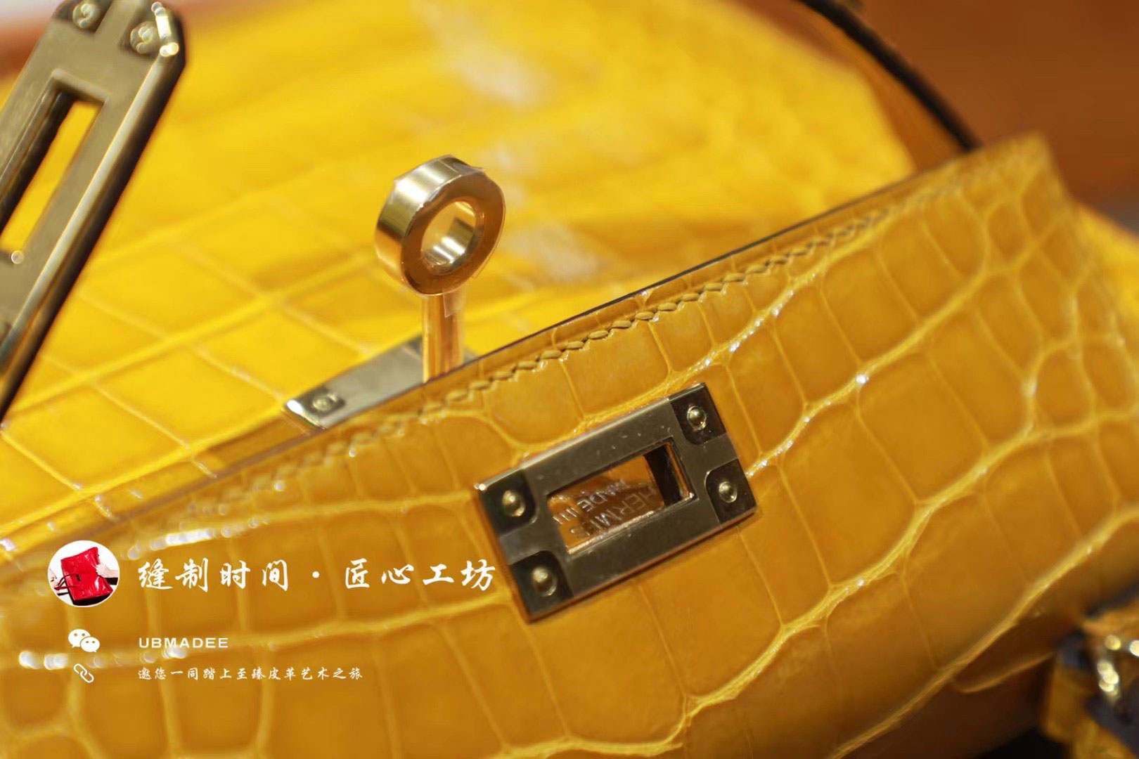 Hermes Mini Kelly 20 II Bag in 9D Miel Scheherazade american catfish Croc gold buckle