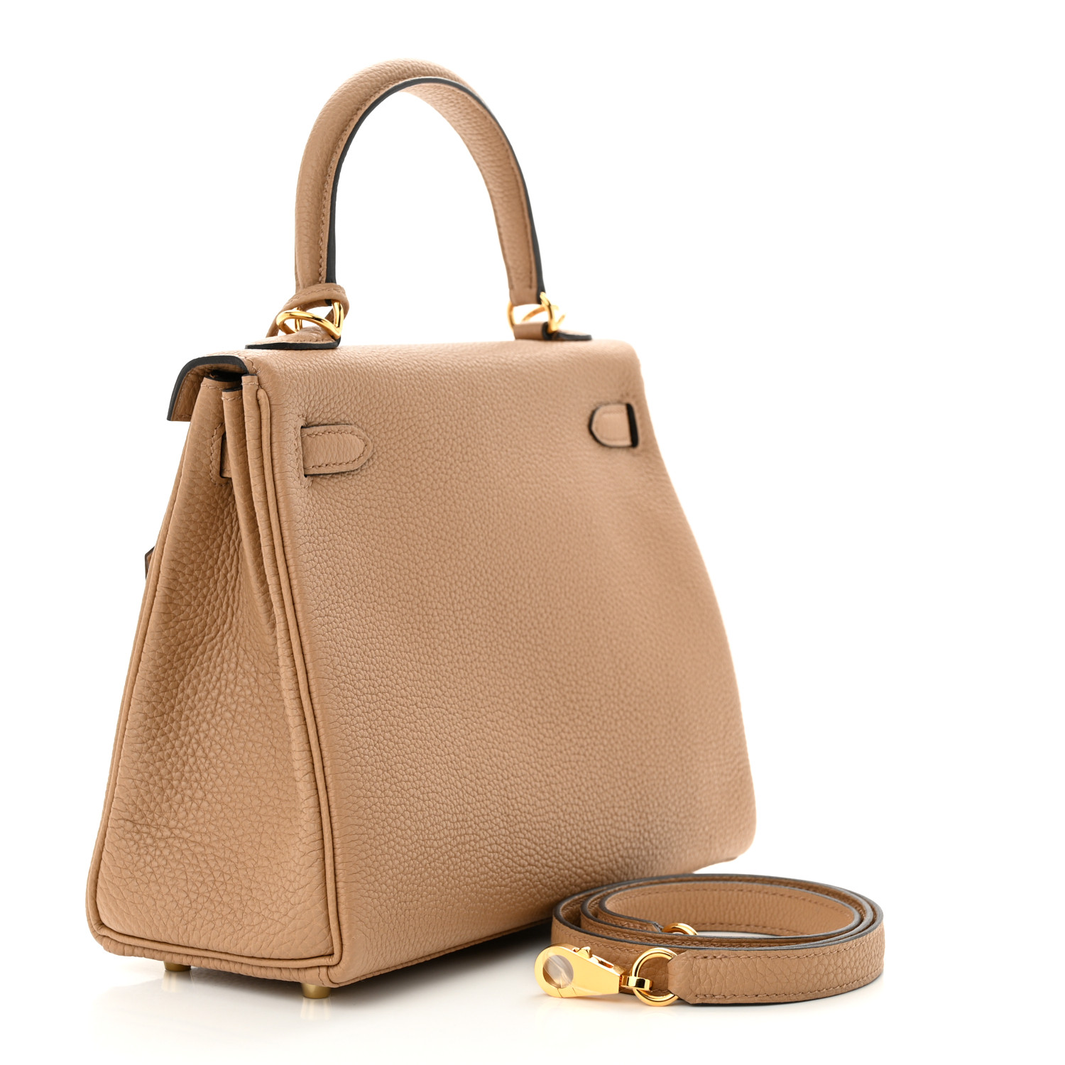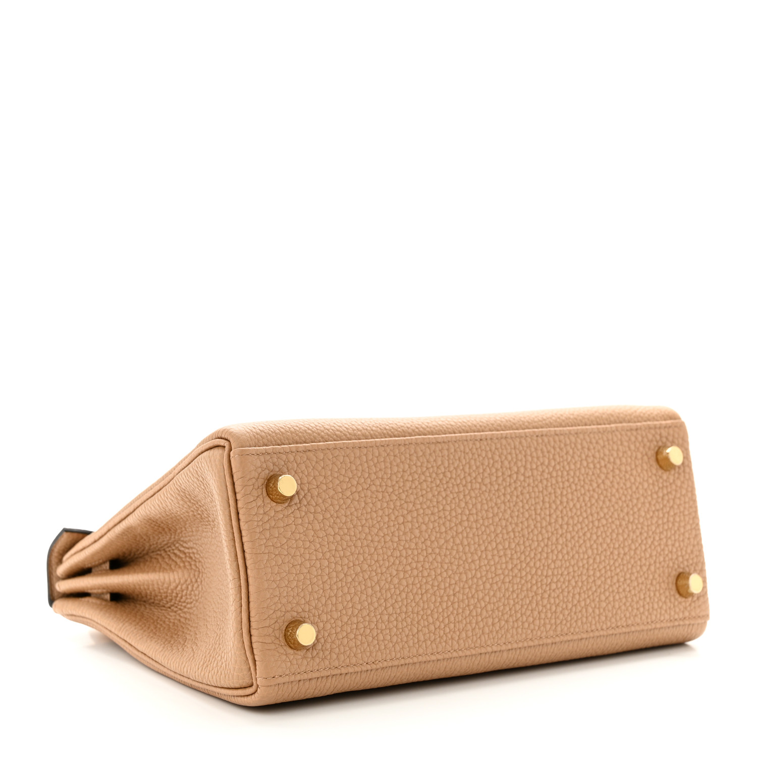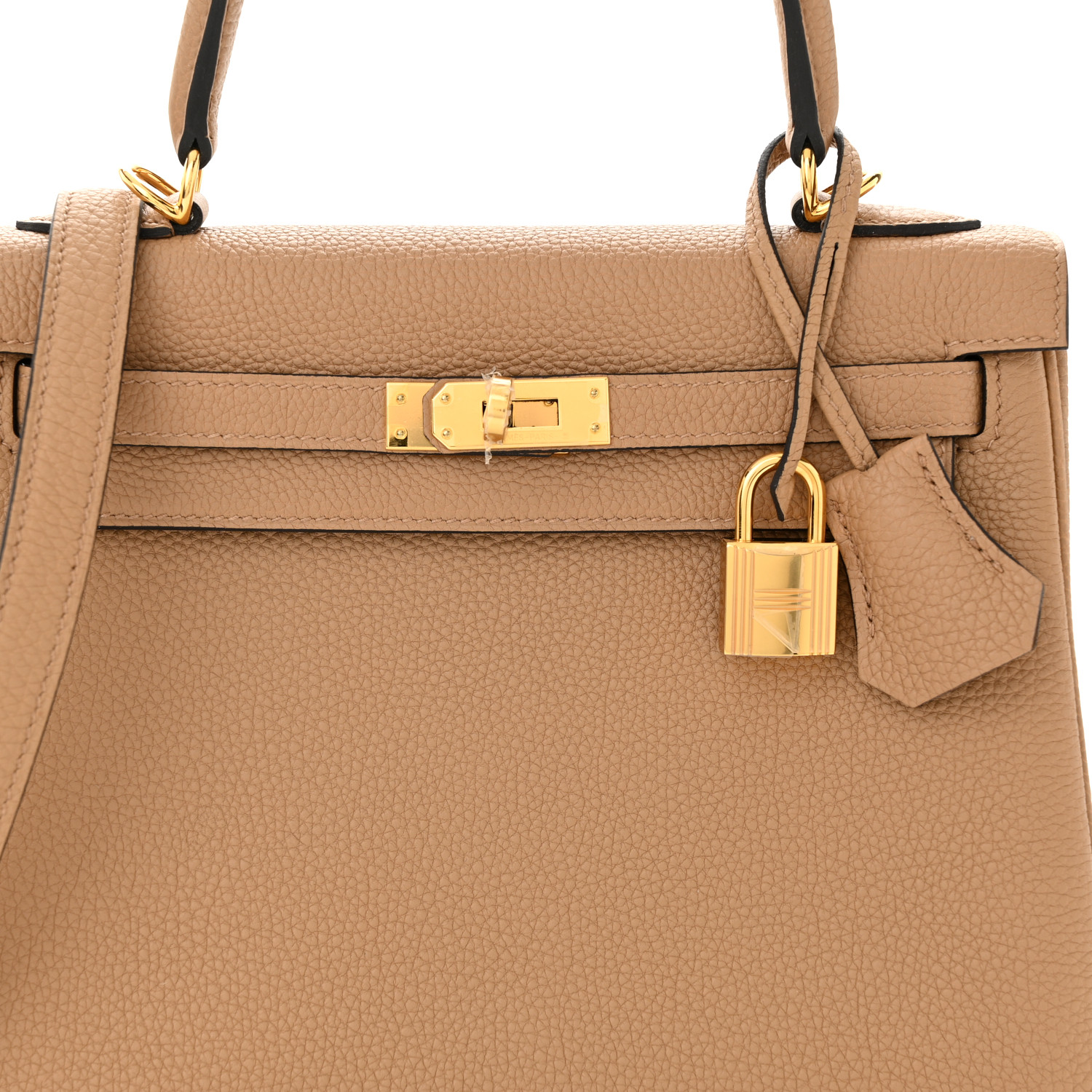 This is an authentic HERMES Togo Kelly Retourne 25 in Chai. This chic and iconic handbag is expertly handcrafted of grained light brown calfskin leather. The bag features a rolled leather top handle, a short front flap with a strap closure with polished gold plated hardware including a padlock and clochette with keys, as well as an optional shoulder strap. The top flap opens to a matching goatskin leather interior with zipper and patch pockets.