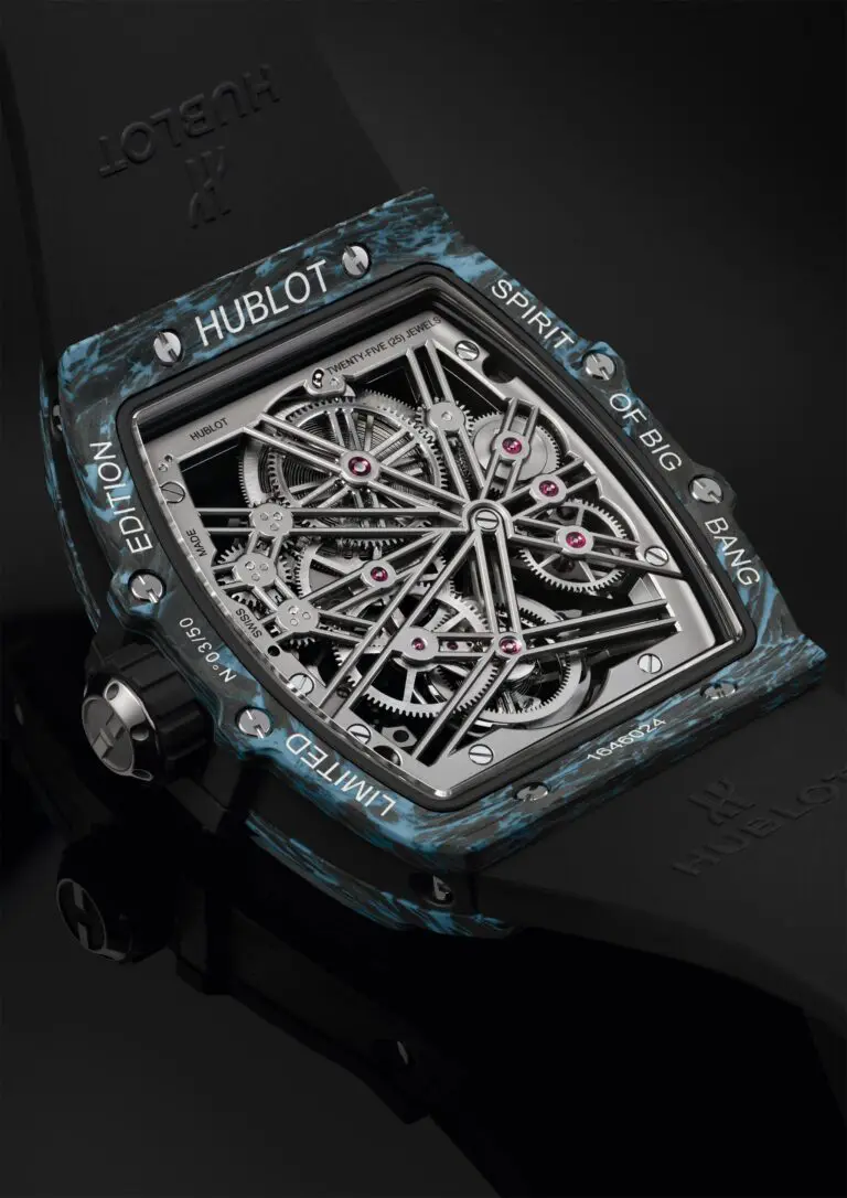 645.QL.5117.RX Competition material on the wrist. Introducing the Spirit of Big Bang Tourbillon Carbon Sky Blue – a testament to innovation and style. Its carbon fibre case, intricately woven with sky blue micro-glass fibres, exudes unparalleled tech