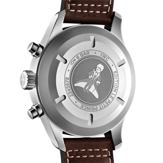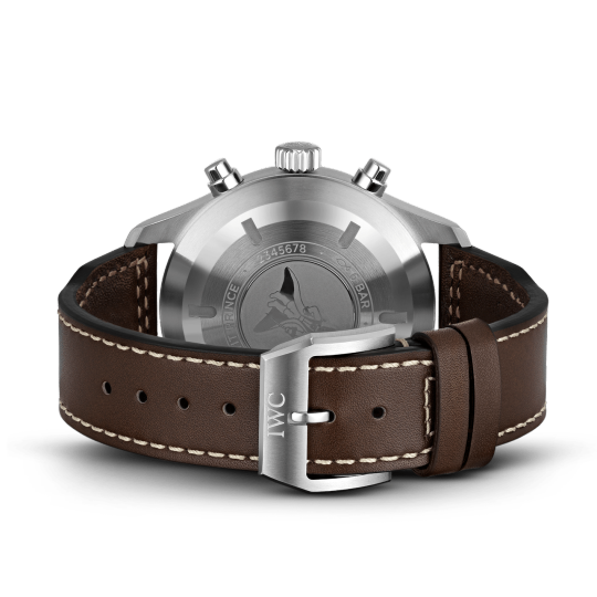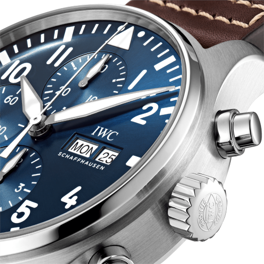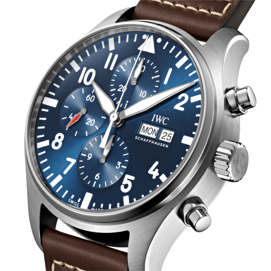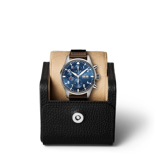 Equipped with a sturdy brown leather strap and pin buckle for added security, this timepiece features an automatic movement with date and chronograph complications, a polished steel case and a sapphire crystal protecting the blue Arabic numerals dial, whether on land or not. On the fly, this watch performs well in or out of the air.