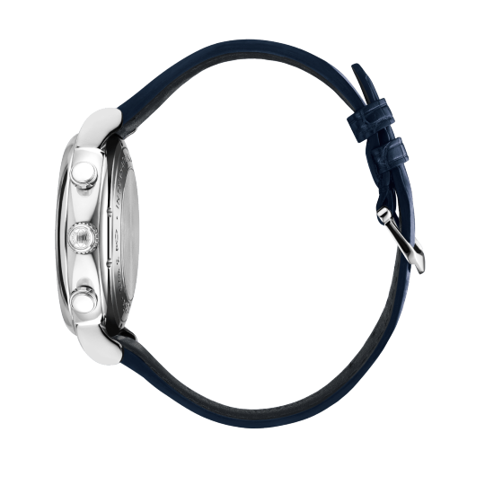 Stainless steel case with blue (alligator) leather strap. Fixed stainless steel bezel. White dial with blue hands and hour markers. Roman numerals appear at 6 and 12 o'clock. Arabic numeral minute markers in 5-minute intervals.