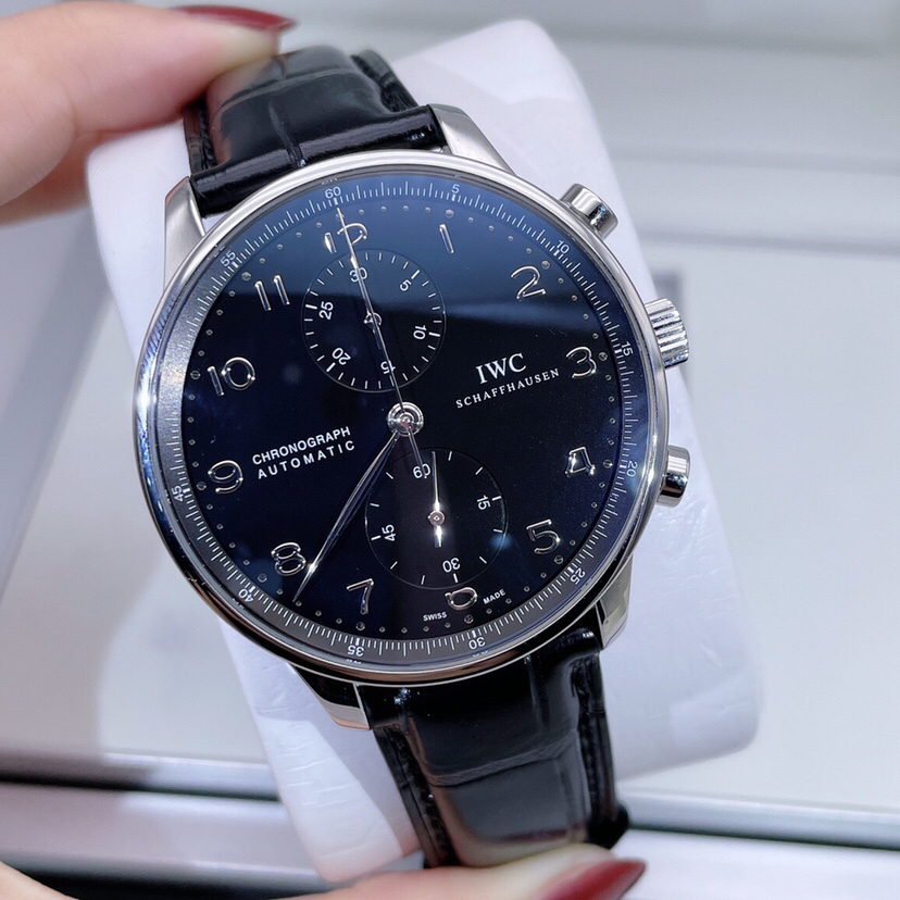 Silver-tone stainless steel case with black alligator leather strap. Fixed silver-tone stainless steel bezel. Black dial with silver-tone leaf-shaped hands and Arabic numerals. Minute markers around outer rim.