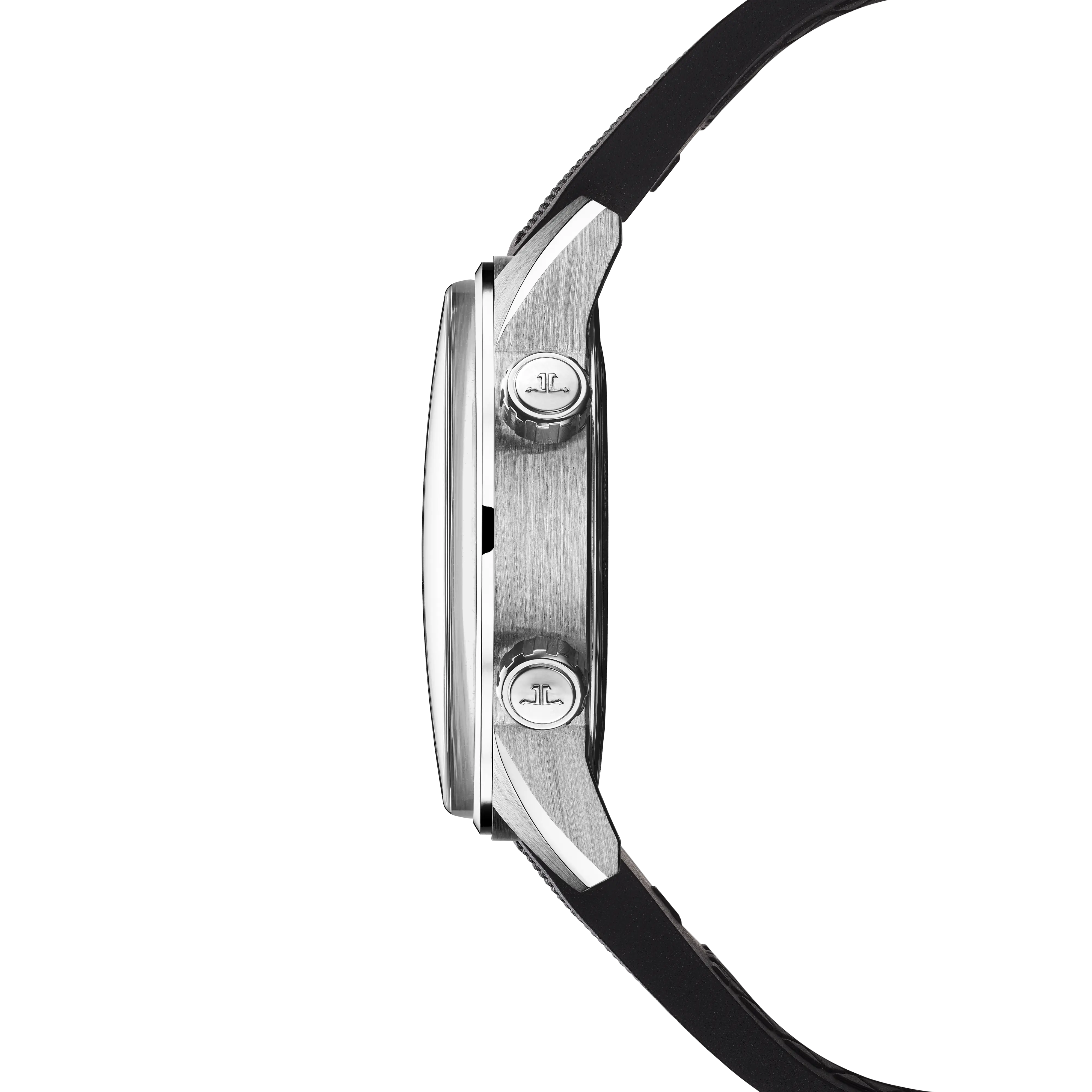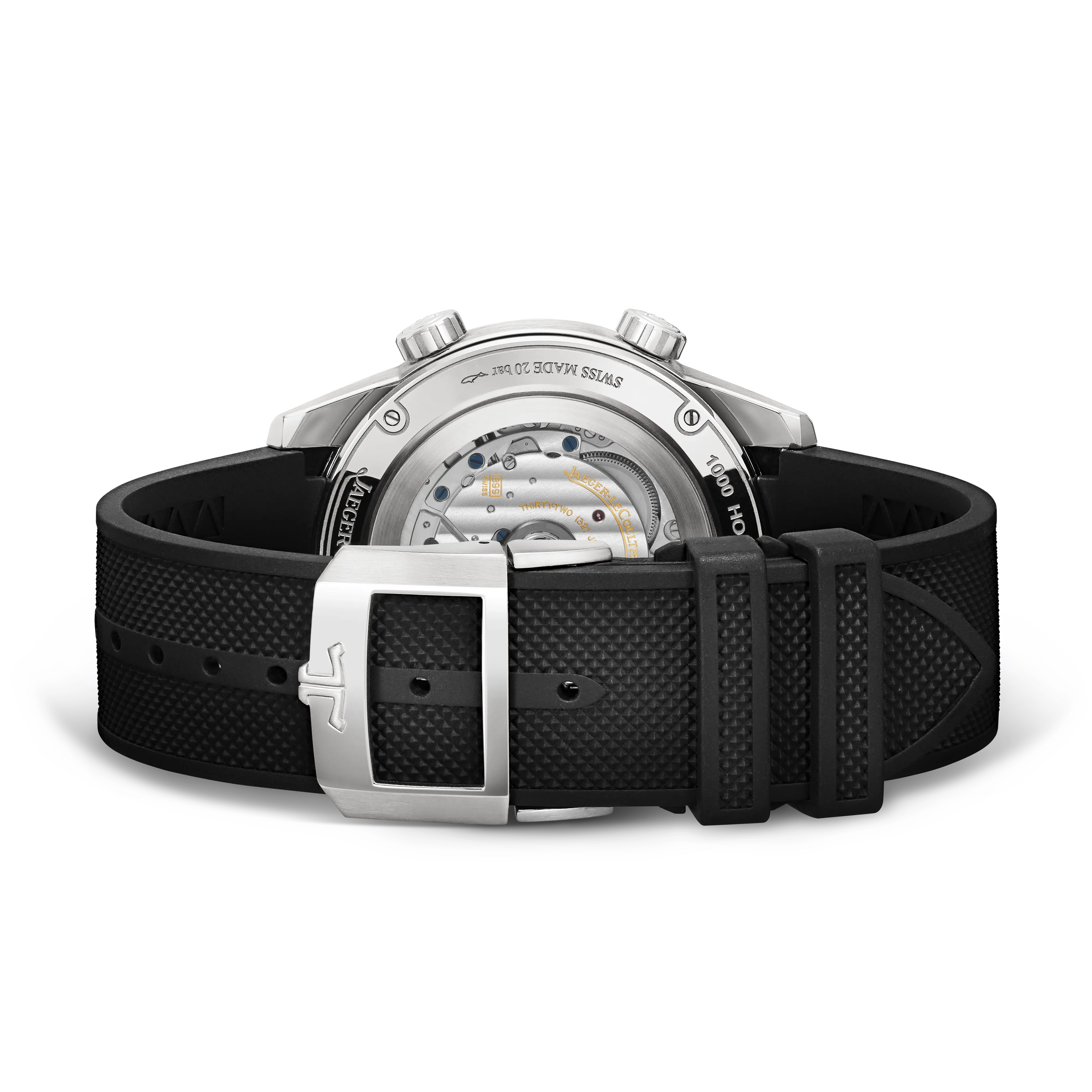 Equipped with the new generation Jaeger-LeCoultre Calibre 899, the Polaris Date watch is dressed in black and steel. Visible beneath the sapphire crystal case-back, this reference movement - entirely designed, decorated and assembled at the Manufacture - offers almost three days of power reserve (70 hours). With its contemporary design and vintage touch, this new Polaris Date recalls the signature codes of the 1968 Memovox Polaris. The triangle on the inner bezel, the indexes, the hour numerals and the hands are coated with a vanilla tint. In its 42 mm steel case, the dial has three levels of finishing that bring depth and contrast to the model: an internal bezel with an opaline finish, a grained circle for the hours and luminescent indexes, as well as a sunray-brushed center. Enhancing the adventurous spirit of the collection, the rubber strap with the “Clous de Paris” pattern can be easily changed in a single movement.