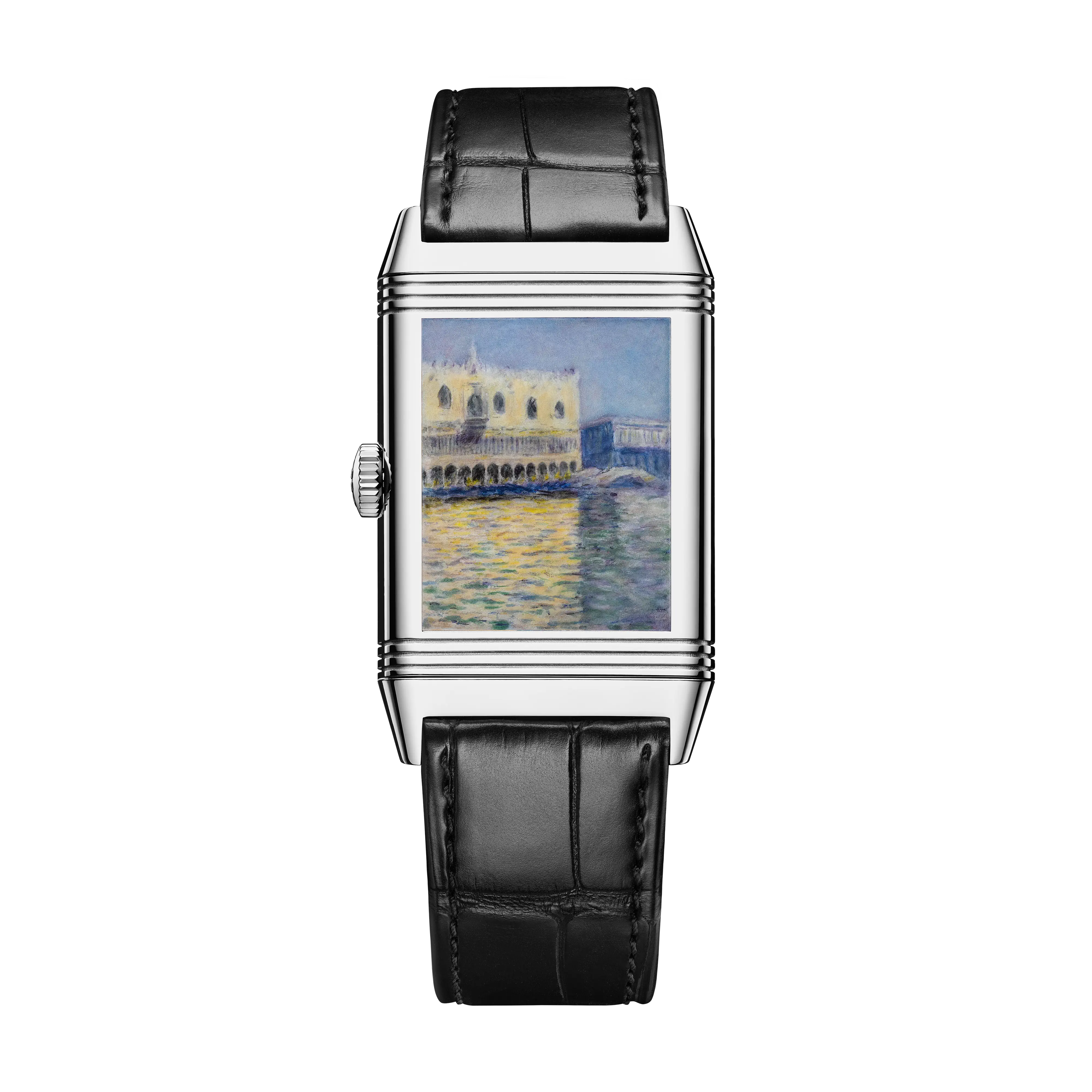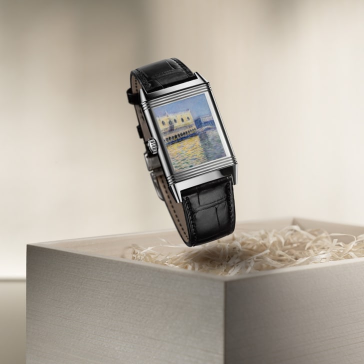 Diving in blue waters. On the Reverso Tribute Enamel watch reproducing the Doge’s Palace, one of Claude Monet’s most well-known paintings, shades of blue in Grand Feu enamel evoke Venice at dawn. The front of the watch features a guilloché dial in an intricate lozenge pattern. To achieve this translucent luminosity, 4,905 guilloché lines were then enamelled in blue Grand Feu. The enamellers at our Atelier des Métiers Rares™ took nearly 70 hours to complete the miniature reproduction of the impressionist master’s original work on the reverse. The blues and golds of the sky and sea seem to reflect each other in perfect colour harmony.