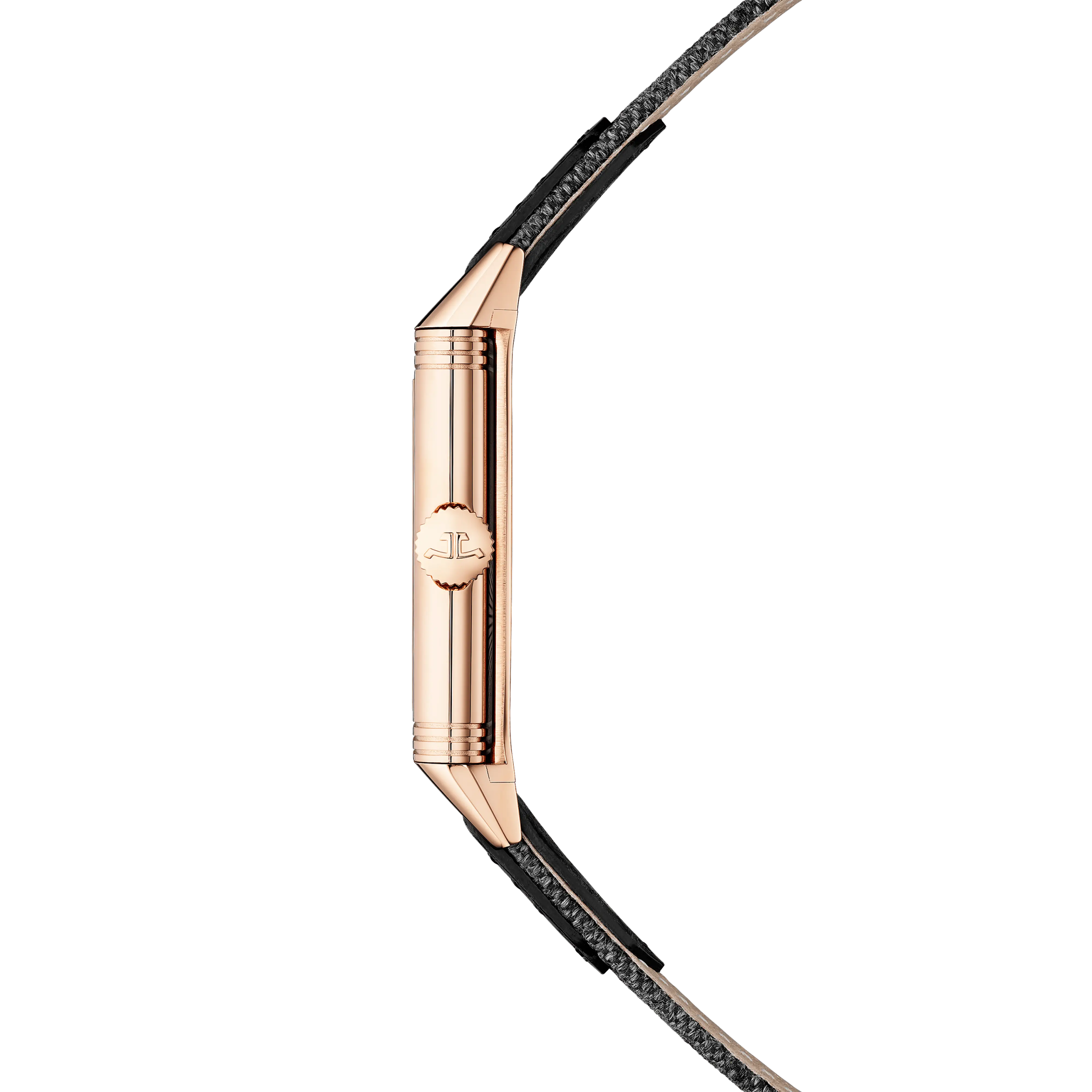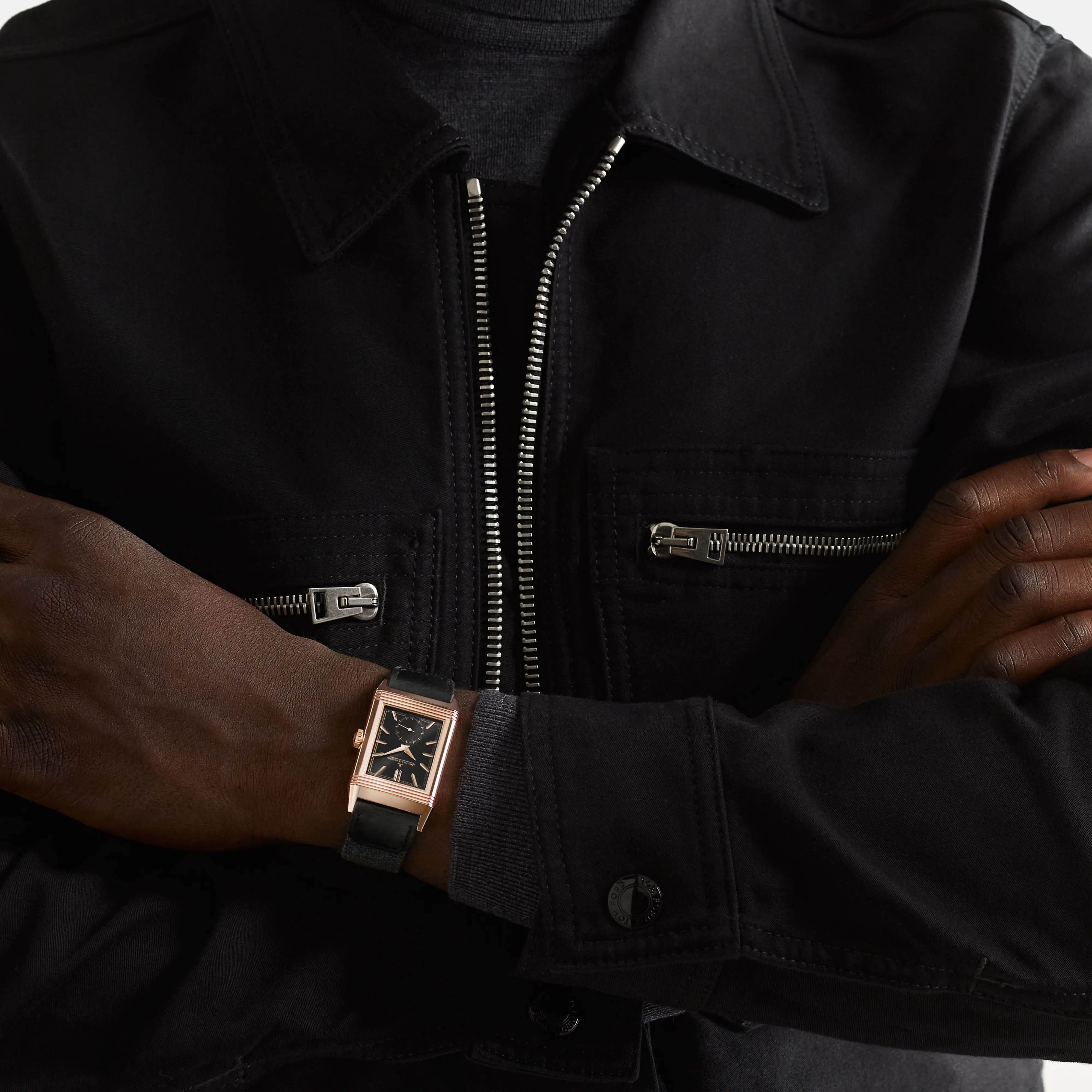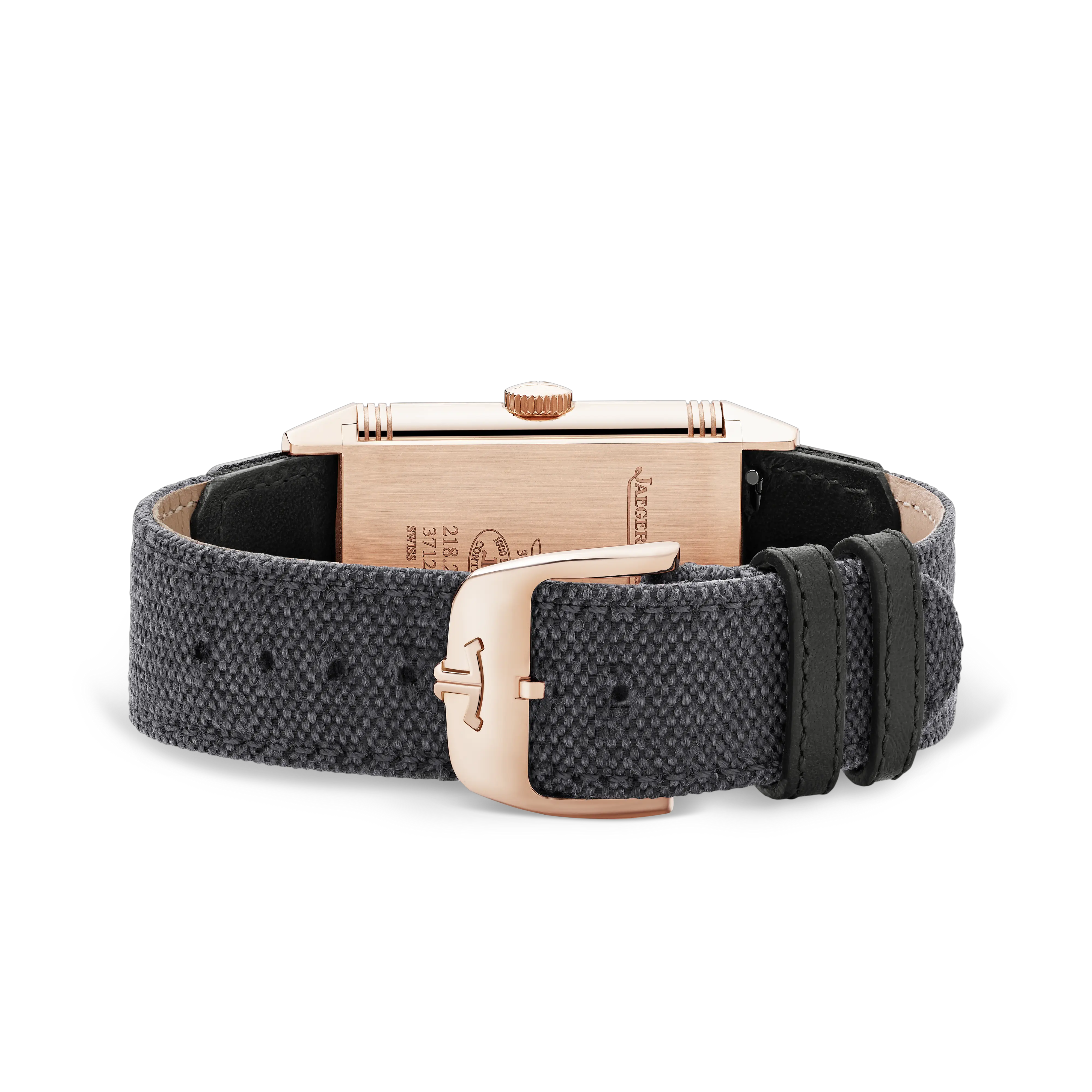 In line with the colored dials that were emblematic of the Reverso collection in its early days, the Reverso Tribute Small Seconds lets black play the leading role. A tribute to the avant-garde spirit of our Maison which, in the 1930s, was one of the only Manufactures to offer coloured dials at a time when white and silver dials were still the norm. On the black sunray dial, which changes under the play of light, every detail takes on relief and depth. This pink gold version with its ultra-thin case (7.56 mm) and customisable reverse comes with two interchangeable straps. A nod to the polo field atmosphere that embodies the Reverso spirit, the leather strap and the bi-material strap (leather/canvas) in the Casa Fagliano design invite the wearer to move from a casual to a more dressed-up style.