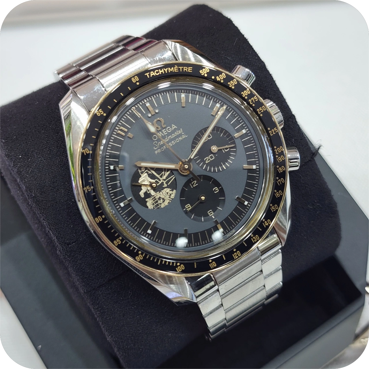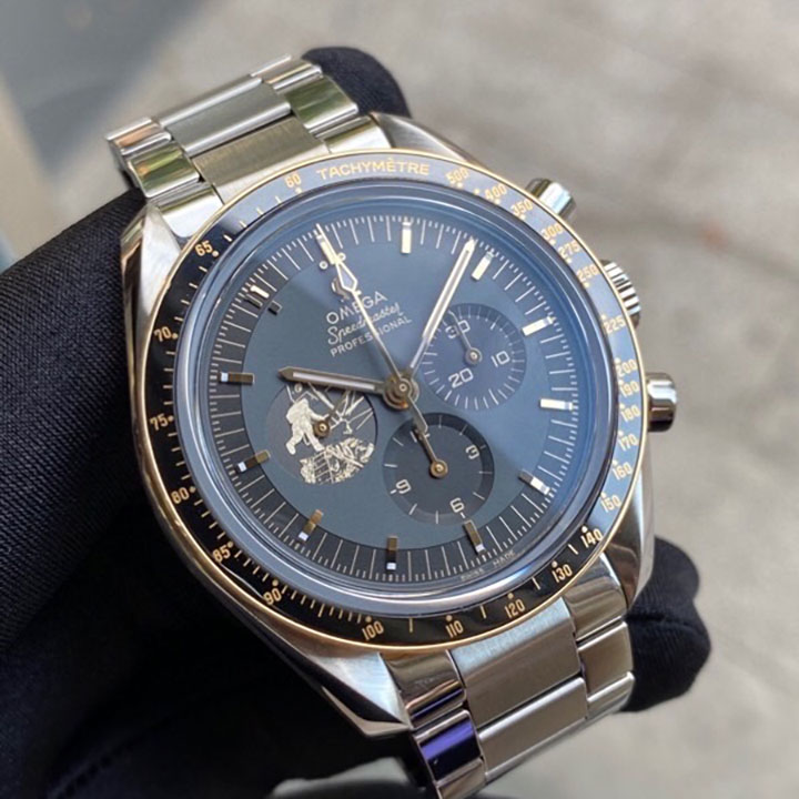 The watch includes a 42 mm case in stainless steel with a polished 18K Moonshine™ Gold bezel. The bezel ring is polished black ceramic [ZrO2] with an OMEGA Ceragold™ tachymeter scale. There is a varnished grey and black dial with all indexes and hands in 18K Moonshine™ Gold - except the central chronograph seconds hand, which is PVD-coated in Moonshine Gold. A unique hour marker is positioned at 11 o'clock, and there is a distinctive 9 o'clock subdial in 18K Moonshine™ Gold with a laser-engraved image of Buzz Aldrin climbing down onto the lunar surface.