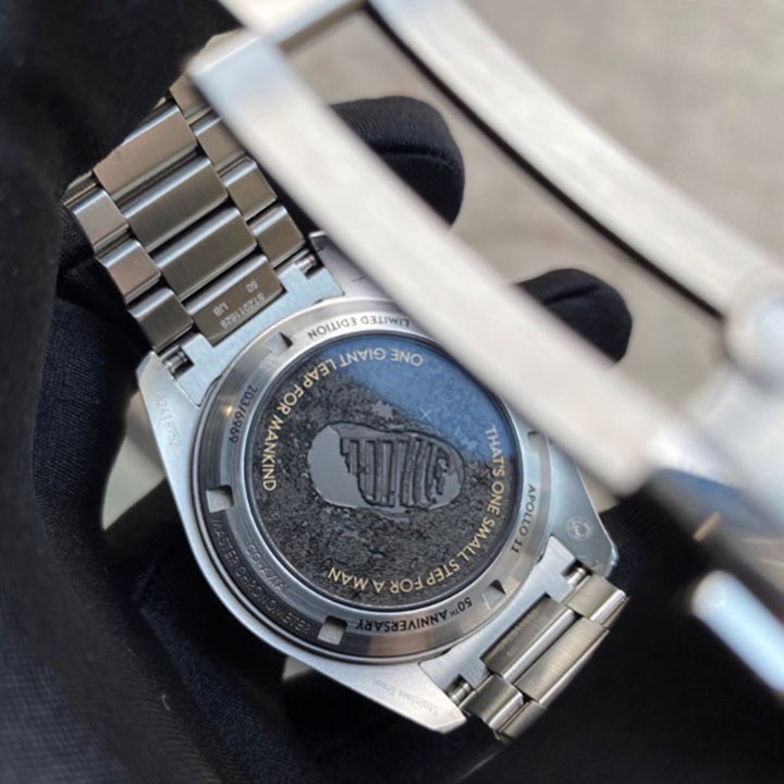 The NAIAD LOCK caseback reveals numerous engravings, while a laser-engraved image of Buzz Aldrin’s footprint is positioned on a medallion under the sapphire crystal. 18K Moonshine™ Gold-plated lettering includes the quote: "THAT’S ONE SMALL STEP FOR A MAN" and "ONE GIANT LEAP FOR MANKIND".