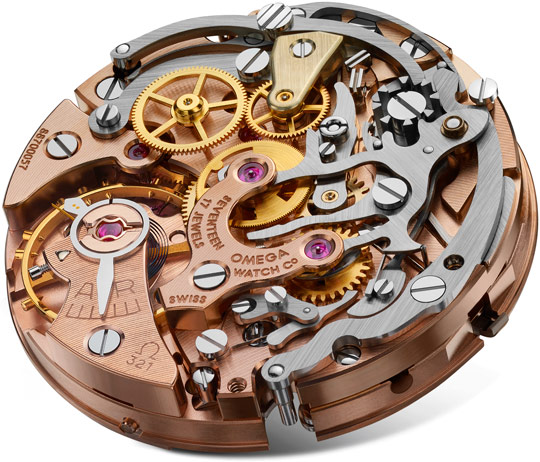 Famous manual-winding chronograph movement with column wheel mechanism, Breguet balance-spring and 18K SednaTM gold PVD coated finish. The calibre that was worn on the Moon.