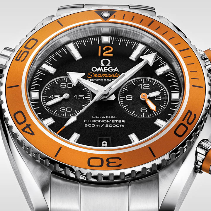 This model, with its scratch-resistant sapphire crystal, features a black dial with a small seconds dial, a date window and a central chronograph hand. Sixty-minute and 12-hour counters are found on the same dial at the 3 o’clock position, allowing for intuitive reading of the elapsed time. The orange unidirectional rotating divers’ bezel is mounted on a 45.5 mm stainless steel case on a stainless steel bracelet.