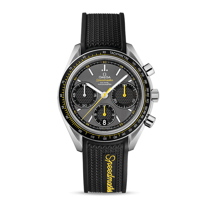 The bezel, with its matt black aluminium tachymetric ring, is mounted on a 40 mm stainless steel case and is presented on a black rubber strap. Powering this timepiece is the Co-Axial calibre 3330.