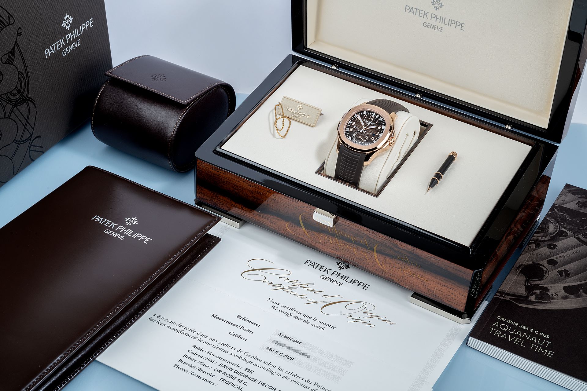 As a sibling to the steel version, the Aquanaut Travel Time is now coming back onstage with the gentle warmth of rose gold and a brown dial. This exceptionally convenient traveler’s companion is endowed with a self-winding movement. The two buttons in the left-hand case flank can be used to move the local-time hour hand forward or backward in one-hour increments. The date is coupled with the local time indication.