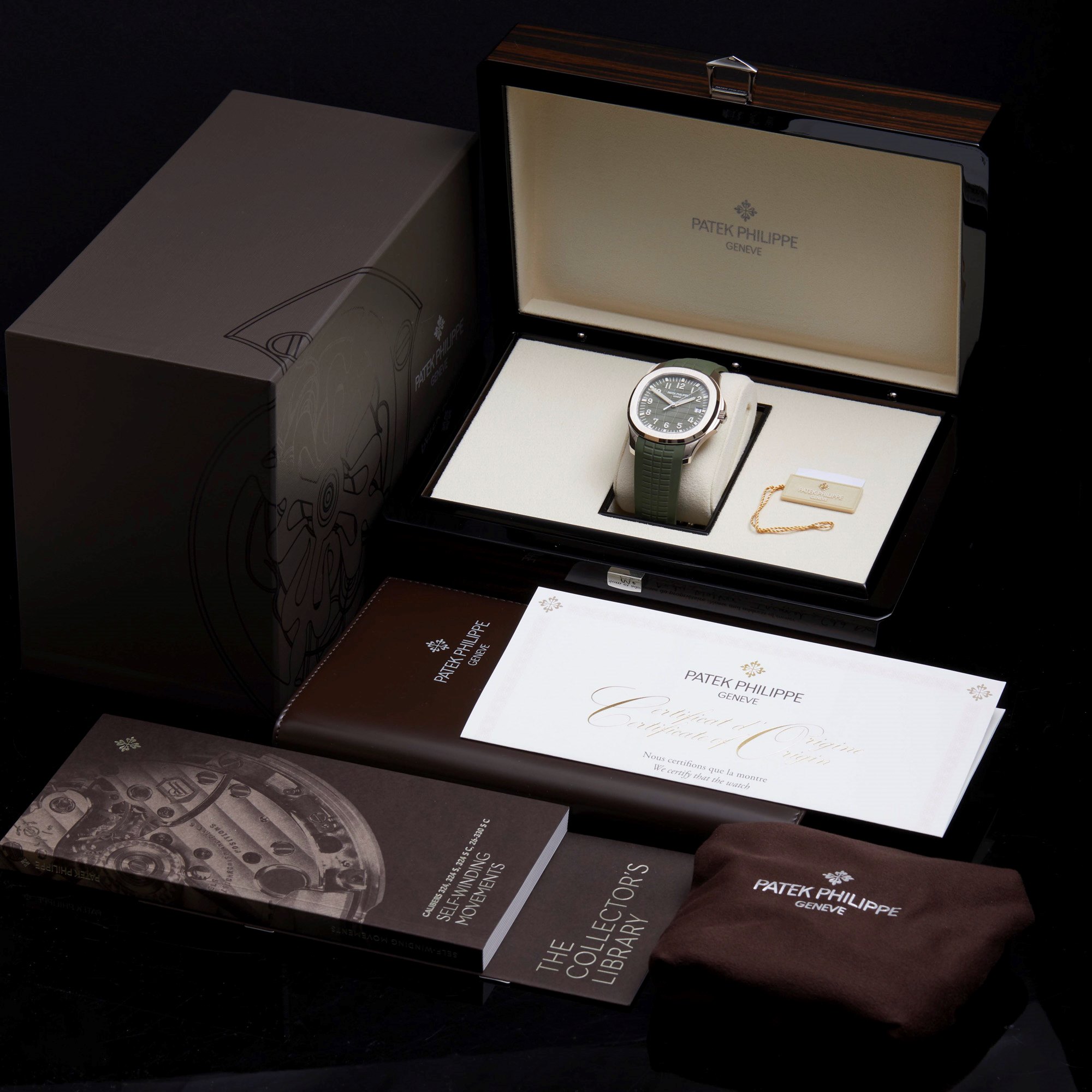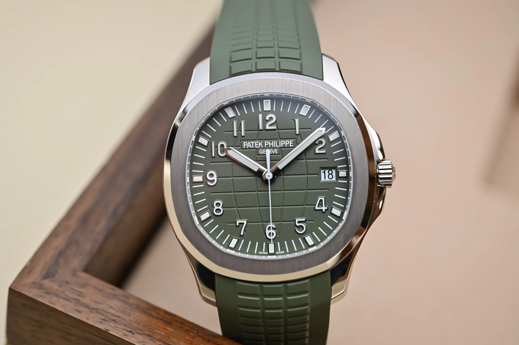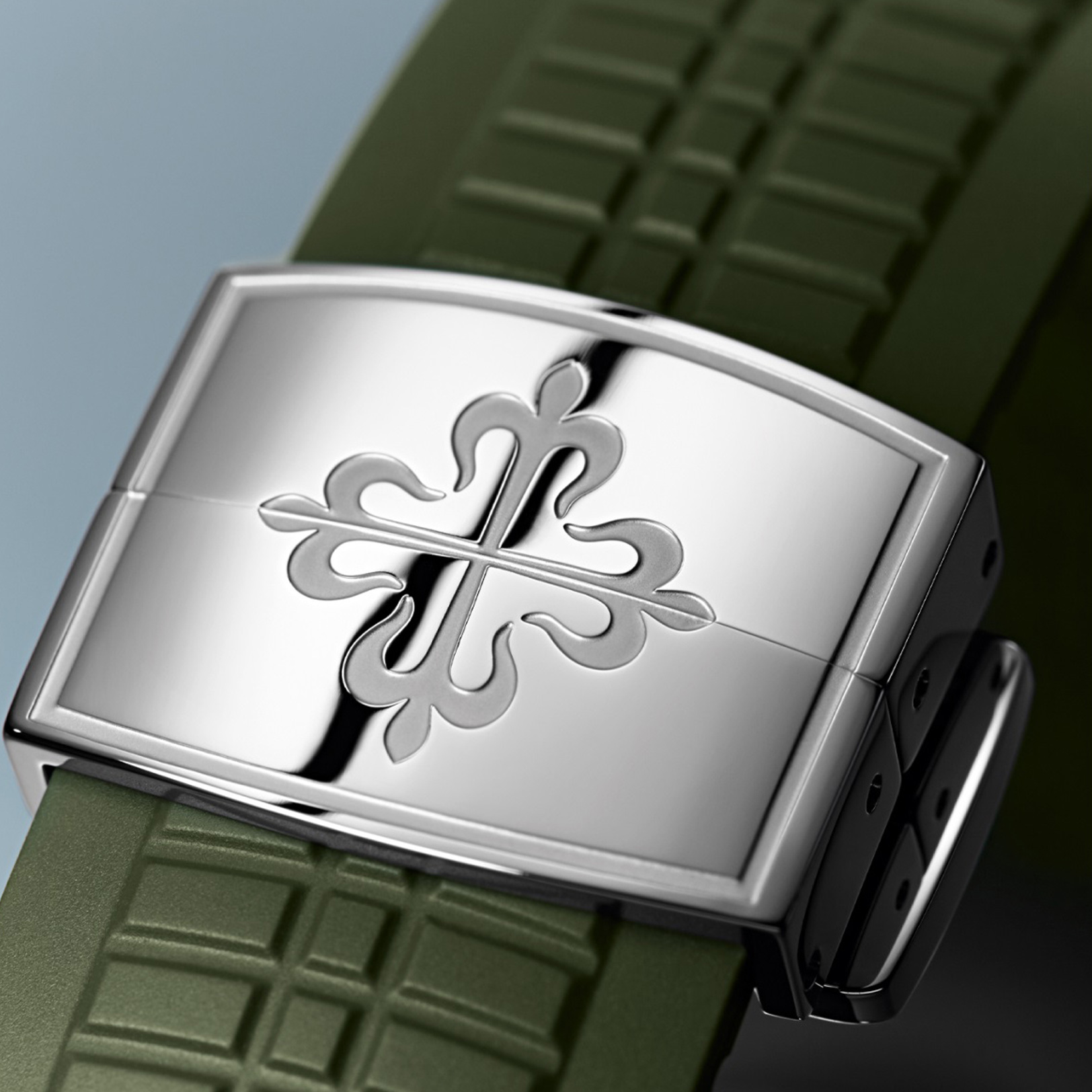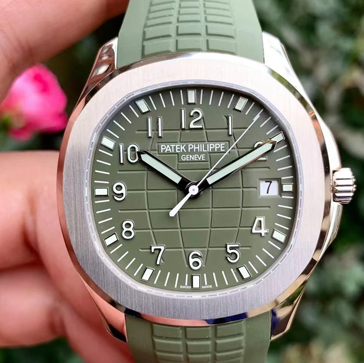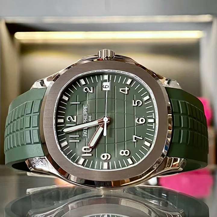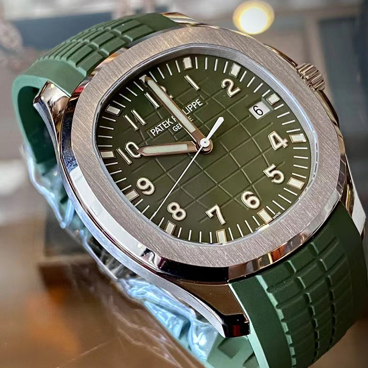 White gold "JUMBO" model in new khaki greenThe Aquanaut white gold men's watch "Jumbo" (case diameter 42.2 mm) is the representative of modern sports fashion, and the new khaki green design shows a youthful and dynamic style. The bold color palette represents the spirit of exploration that longs for the distance, and the rounded octagonal case and bezel combine polish with satin decoration.