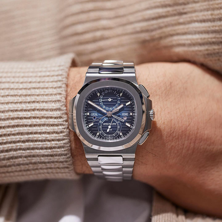 The Ref. 5990/1A-011 Nautilus Travel Time chronograph is one of Patek Philippe’s rare steel watches. It features a new blue dial with a ray sunburst dial and a delicate black gradation to the periphery.