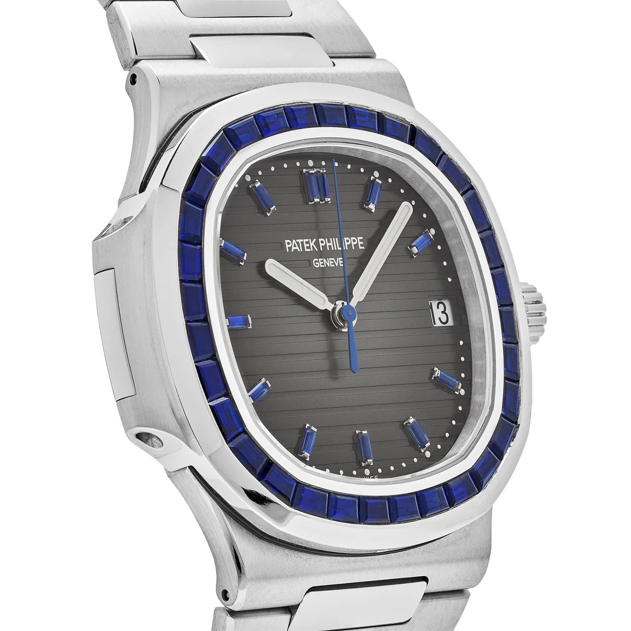 This Patek Philippe Nautilus is crafted in a 40mm platinum case, illuminated with a gem-set blue sapphire bezel, and styled on a platinum bracelet. The black dial hosts baguette-cut blue sapphire hour markers and a date window at 3 o'clock.