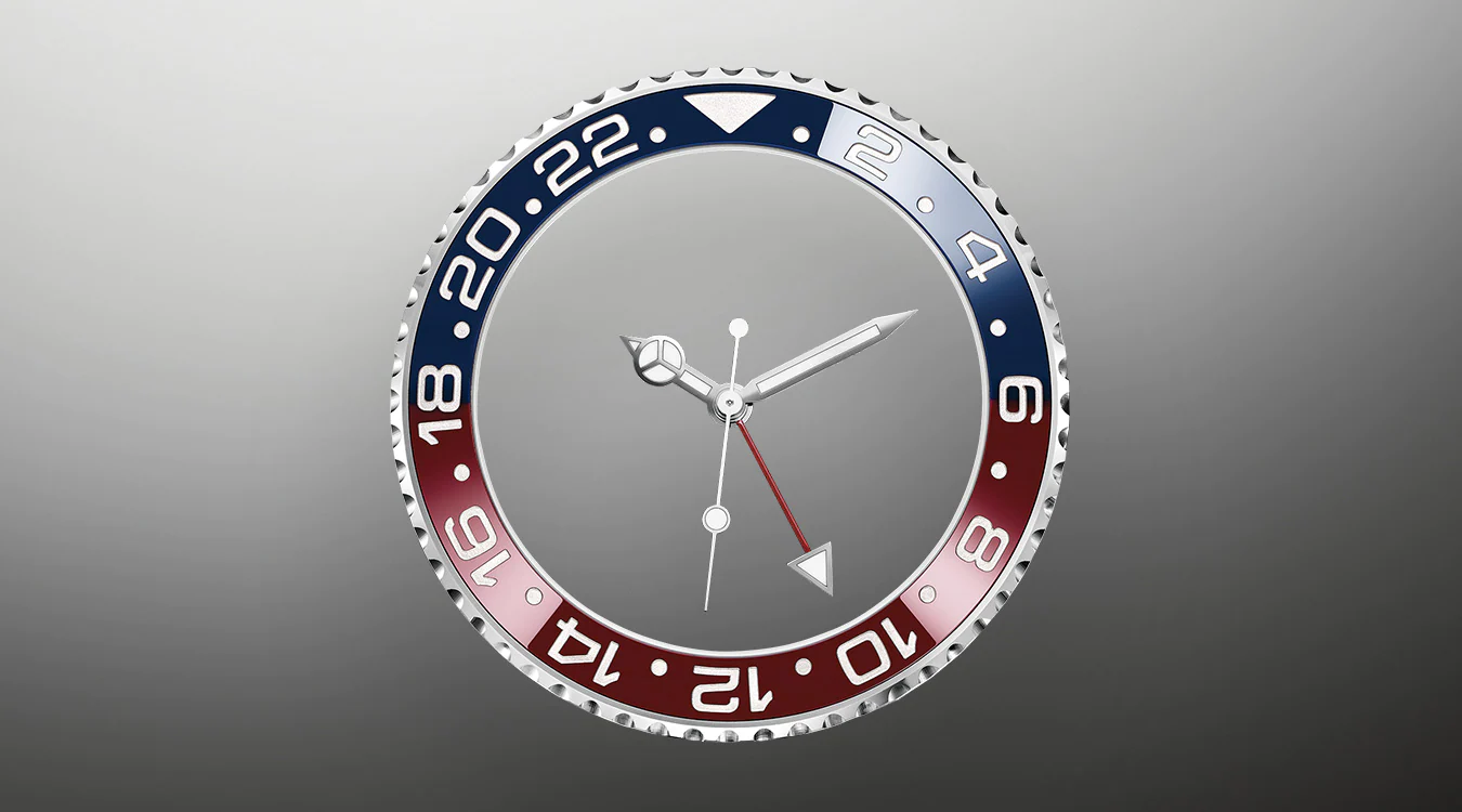 In addition to conventional hour, minute and seconds hands, the GMT-Master II features an arrow-tipped hand, which circles the dial once every 24 hours, as well as a bidirectional rotatable 24-hour graduated bezel. The distinctively coloured 24-hour hand displays the “home” reference time in a first time zone which can be read on the graduations on the bezel. The traveller’s local time is easily set by “jumping” from hour to hour, thanks to an ingenious mechanism operated via the winding crown: the hour hand can be adjusted forwards or backwards independently of the minute and seconds hands. This allows travellers to adapt to their new time zone without affecting the precision of their timekeeping.