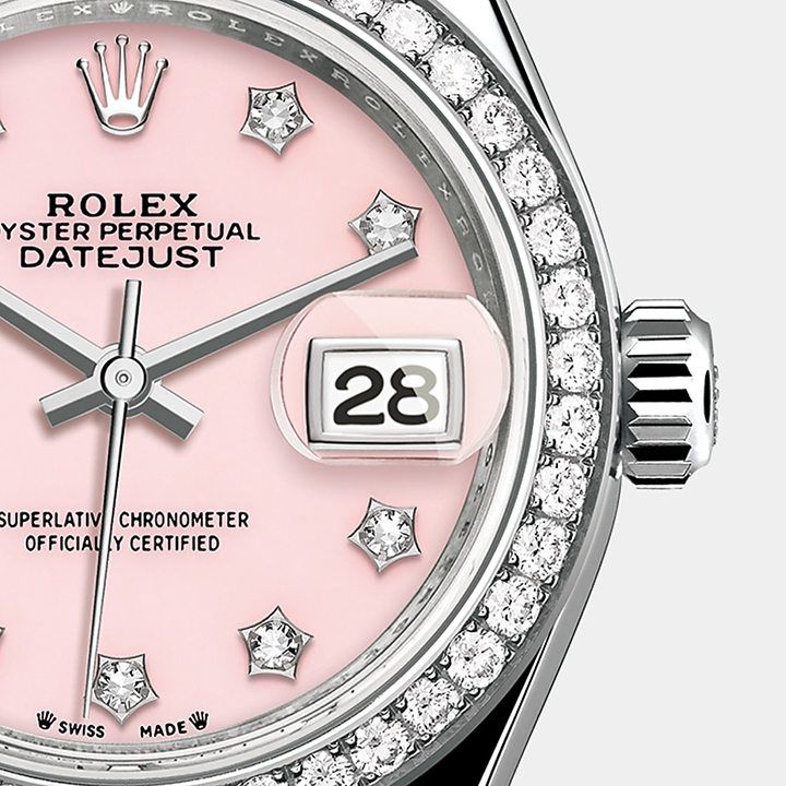 The light reflections on the case sides and lugs highlight the elegant profile of the 28 mm Oyster case, which is fitted with a diamond-set bezel. Rolex's classic feminine watch, the Lady-Datejust is in the lineage of the Datejust, the emblematic model that has been a byword for style and accurate timekeeping.